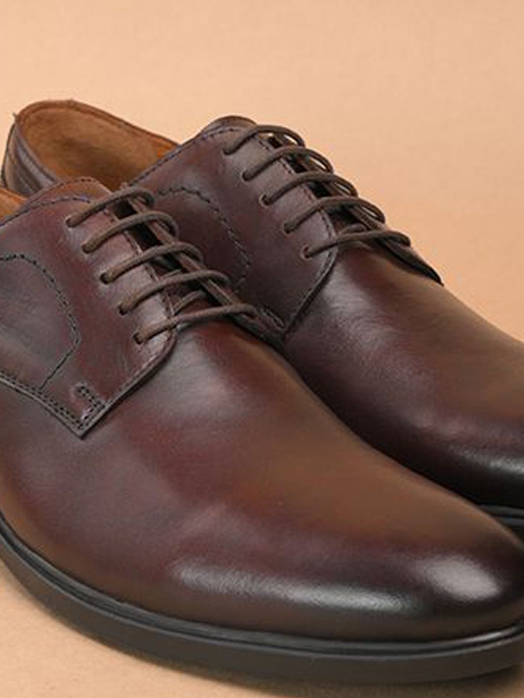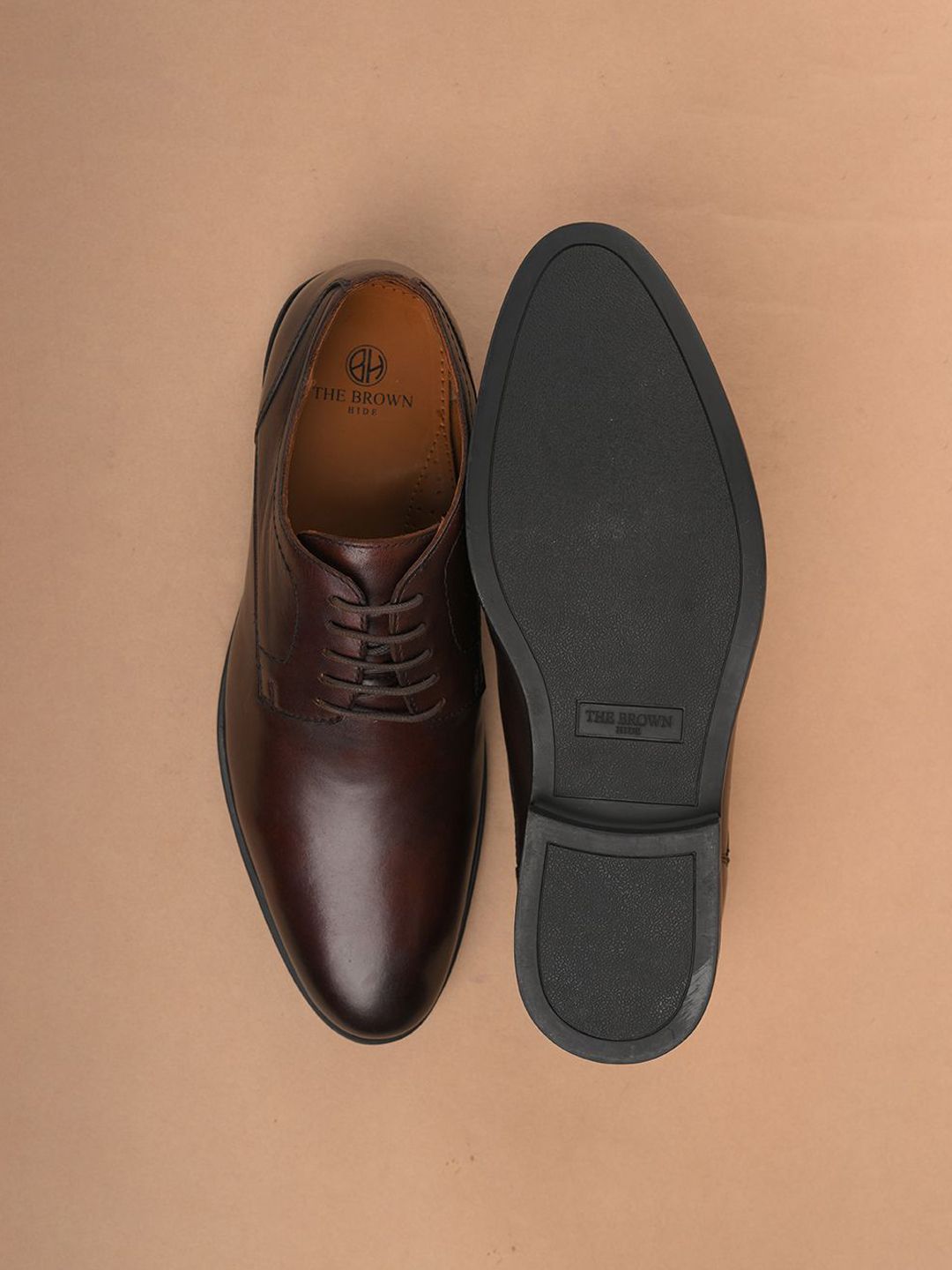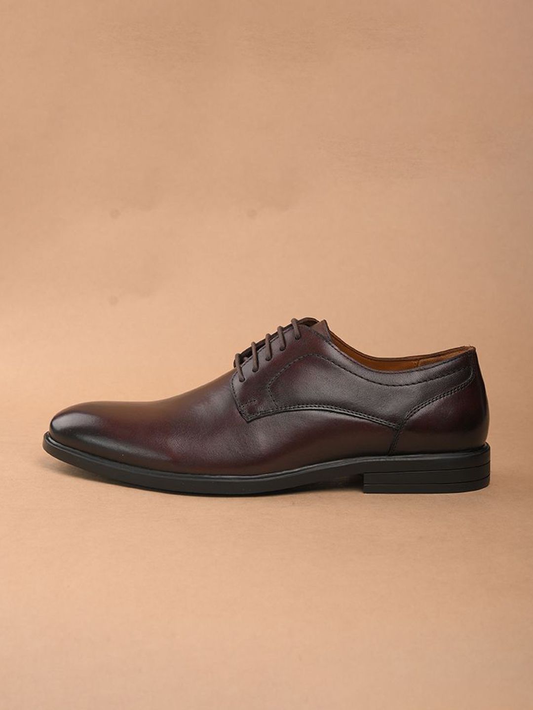 A pair of brown solid round-toe formal derbys with regular styling has a lace-up closureLeather upperCushioned footbedTextured and patterned TPR outsoleWarranty: 6 MonthsWarranty provided by brand/manufacturer