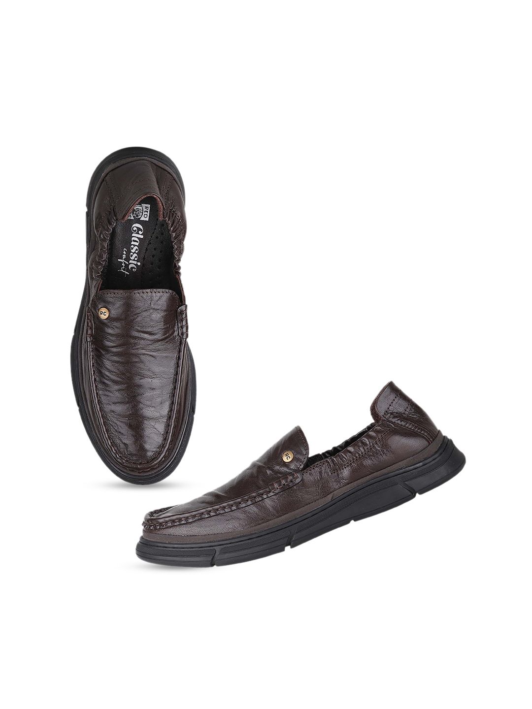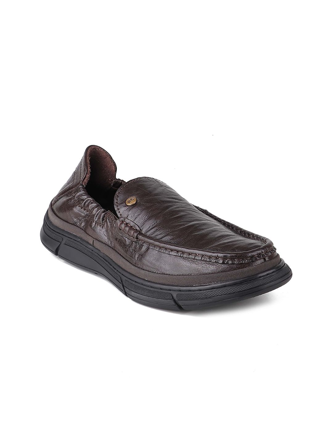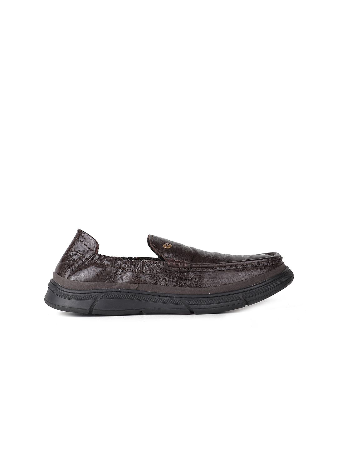 A pair of brown solid round-toe formal slip-ons with regular styling has a slip-on closureLeather upperCushioned footbedTextured and patterned rubber outsoleWarranty: 1 MonthWarranty provided by brand/manufacturer