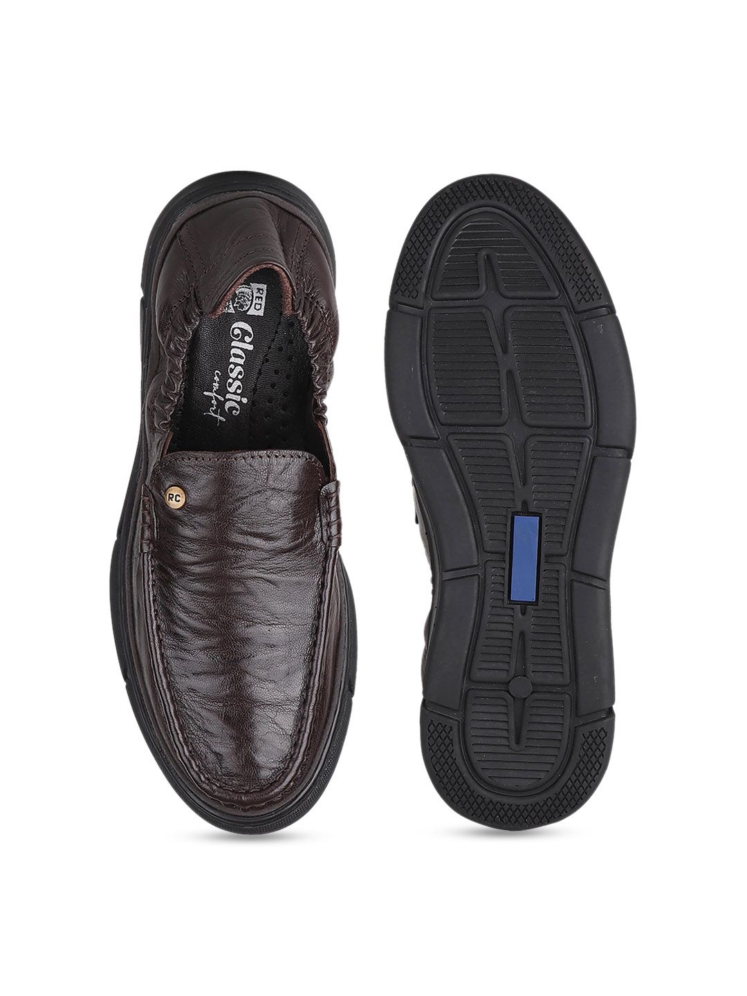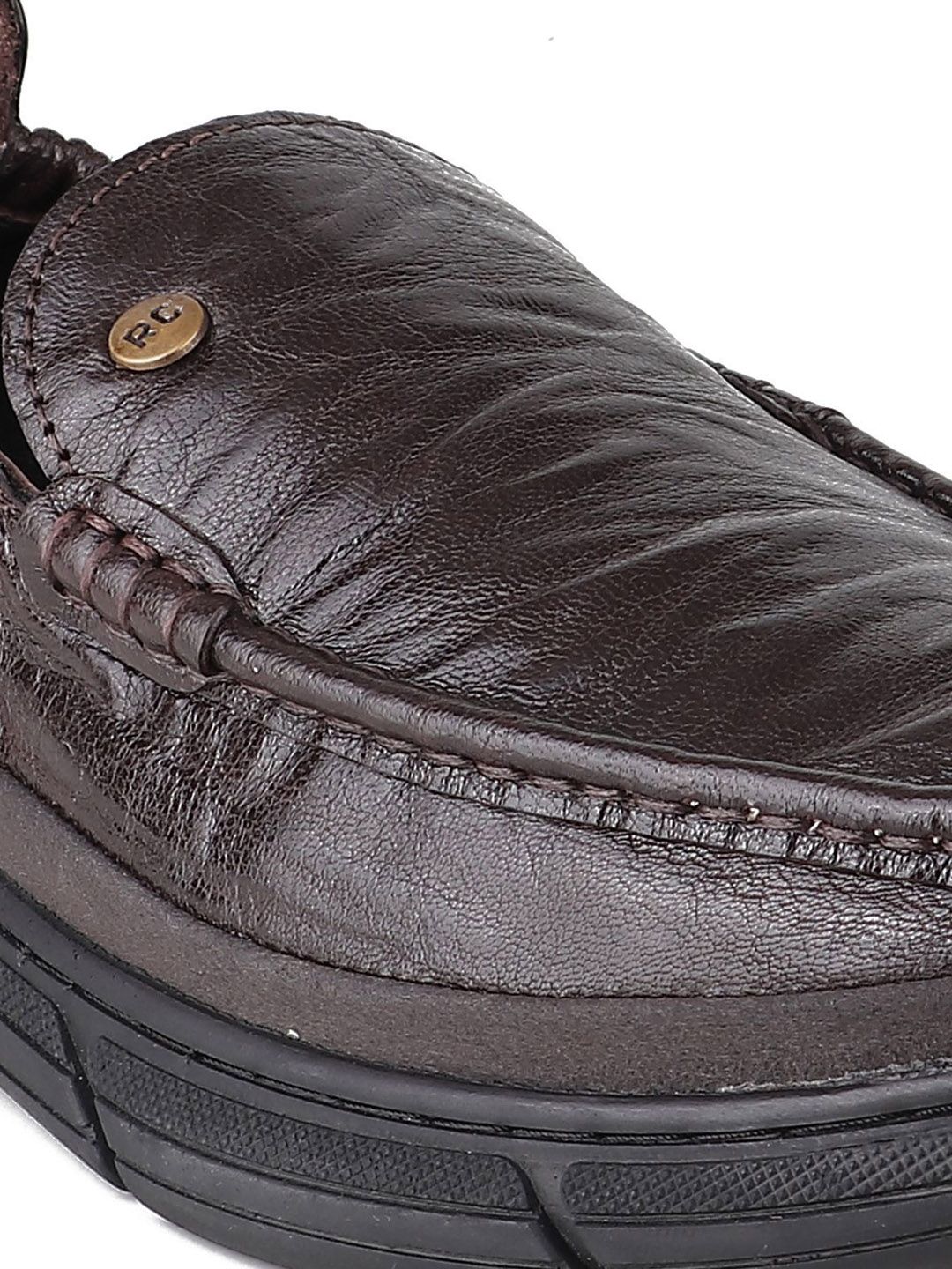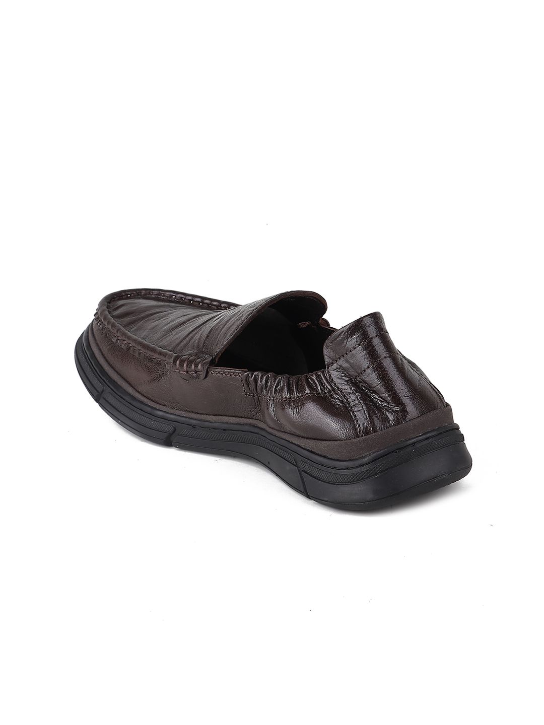 A pair of brown solid round-toe formal slip-ons with regular styling has a slip-on closureLeather upperCushioned footbedTextured and patterned rubber outsoleWarranty: 1 MonthWarranty provided by brand/manufacturer