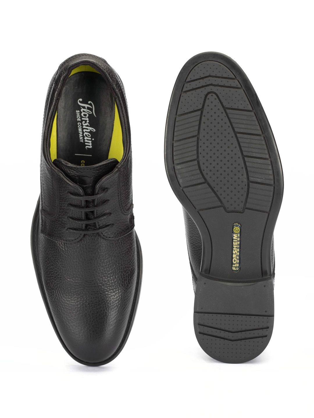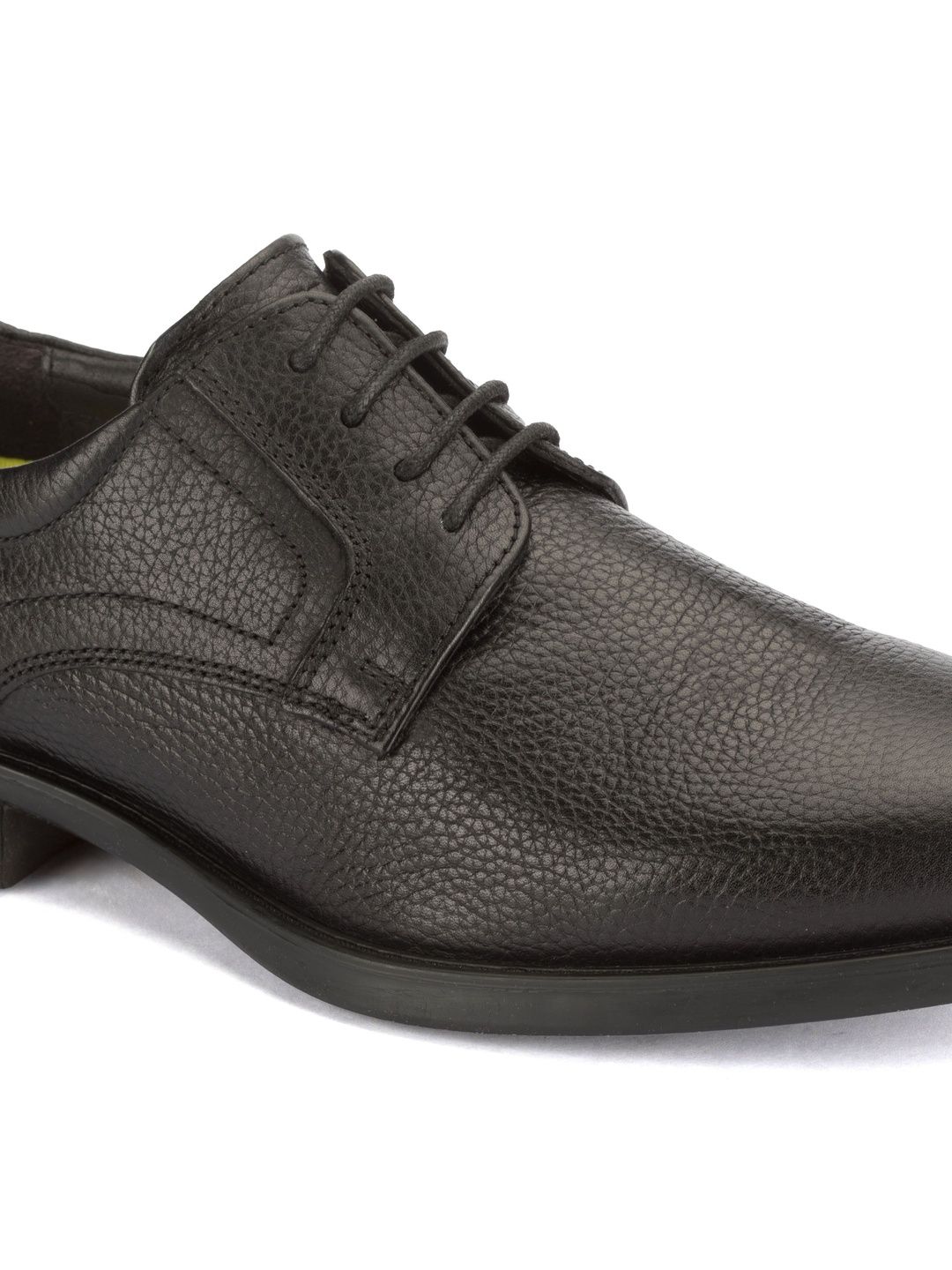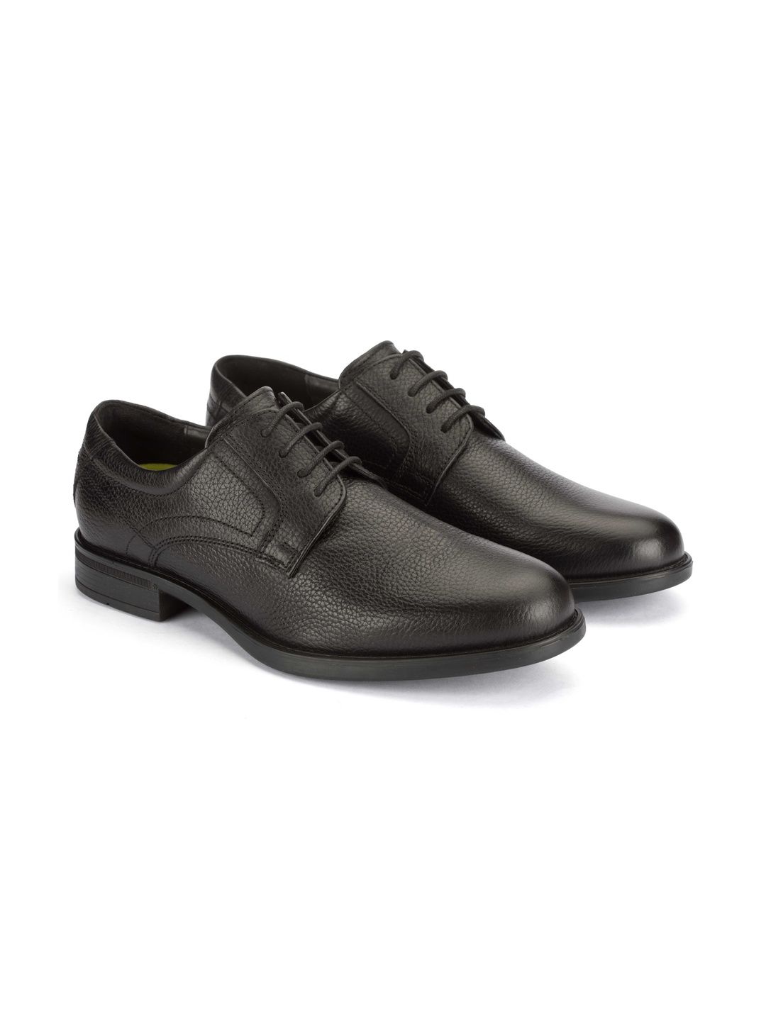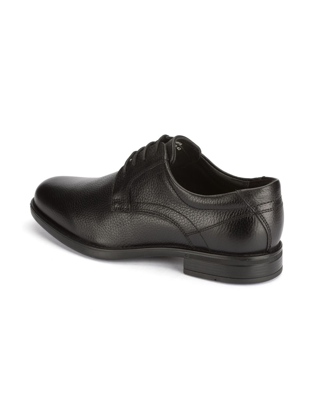 A pair of black solid round-toe formal derbys with regular styling has a lace-up closureLeather upperCushioned footbedTextured and patterned rubber outsoleWarranty: 1 MonthWarranty provided by brand/manufacturer