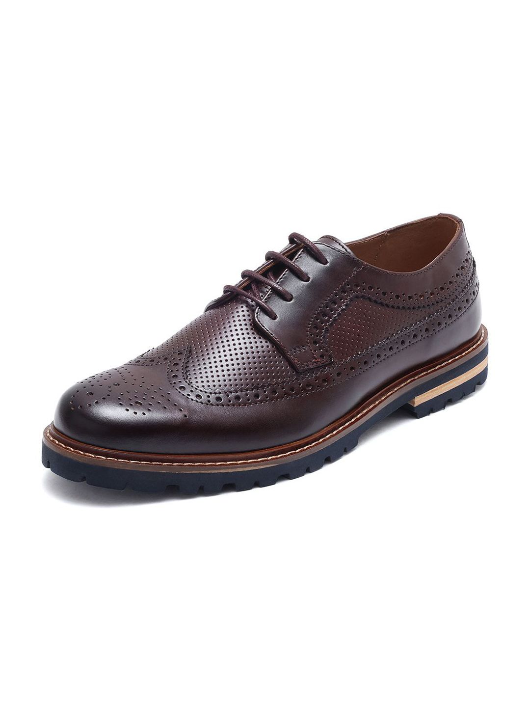 A pair of maroon solid round-toe formal brogues with regular styling has a lace-up closureLeather upperCushioned footbedTextured and patterned TPR outsoleWarranty: 1 MonthWarranty provided by brand/manufacturer
