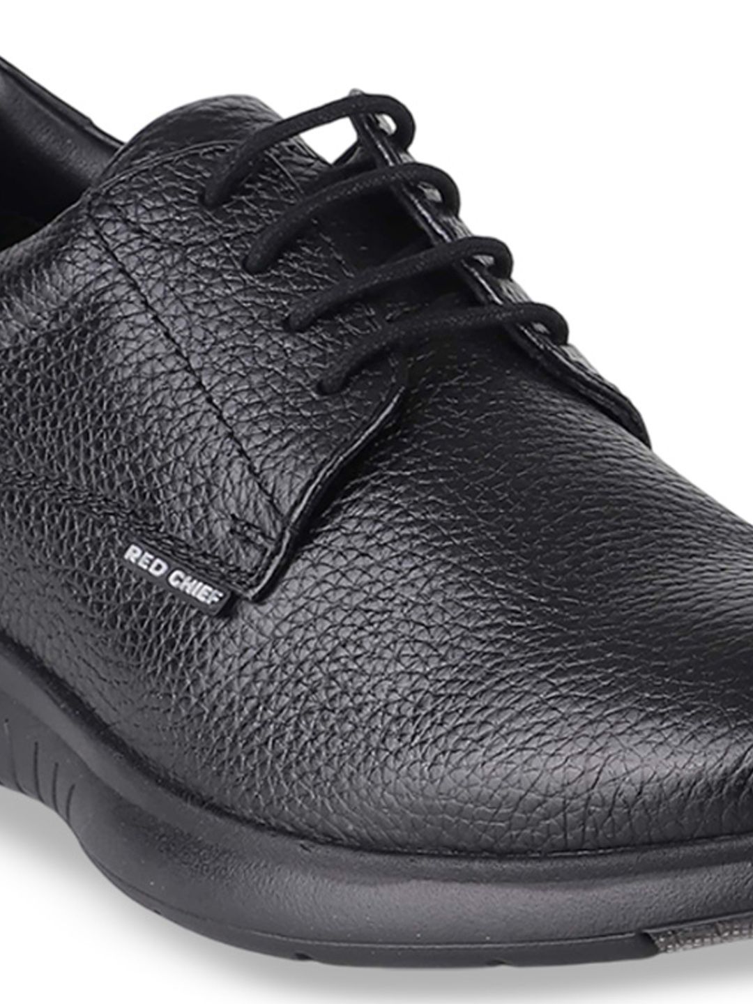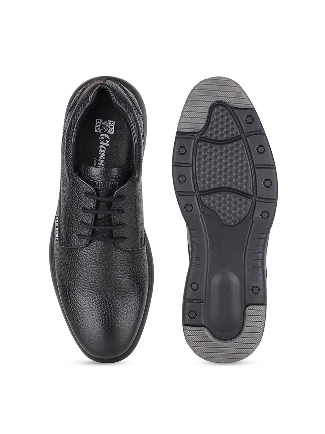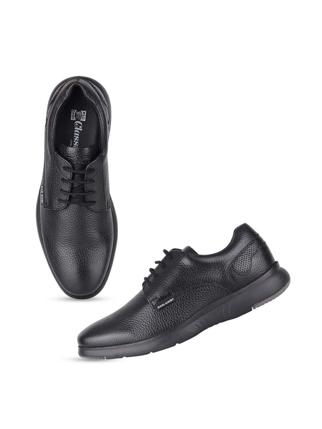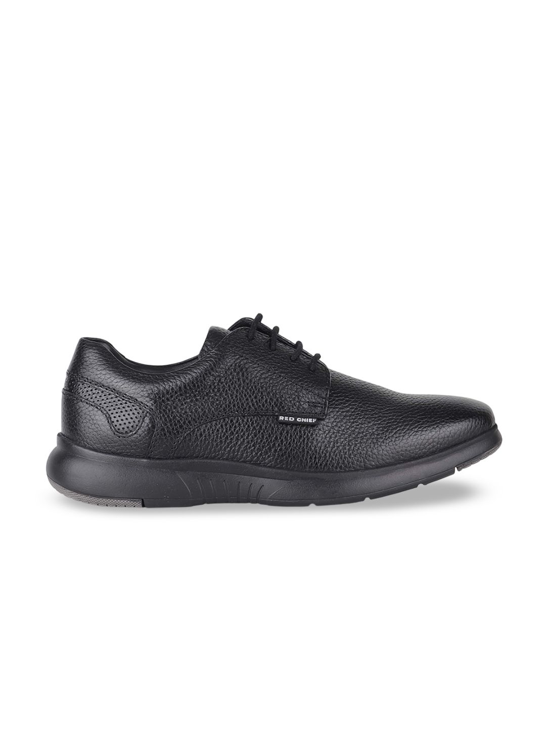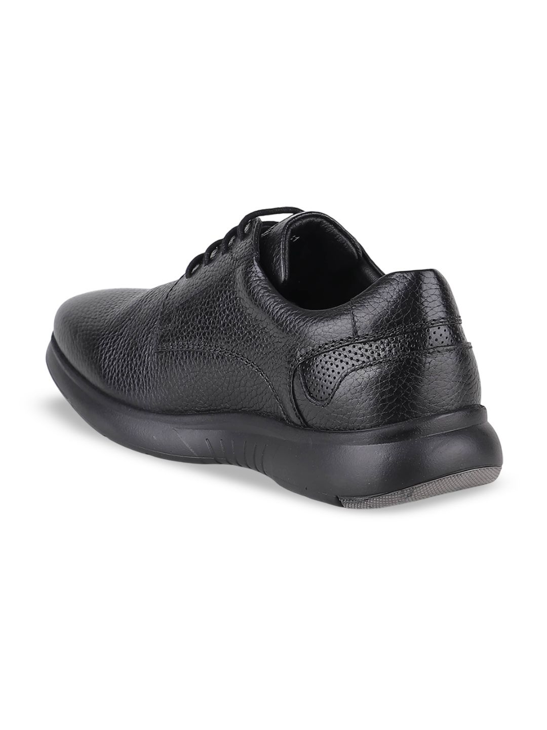 A pair of black solid round-toe formal derbys with regular styling has a lace-up closureLeather upperCushioned footbedTextured and patterned rubber outsoleWarranty: 1 MonthWarranty provided by brand/manufacturer