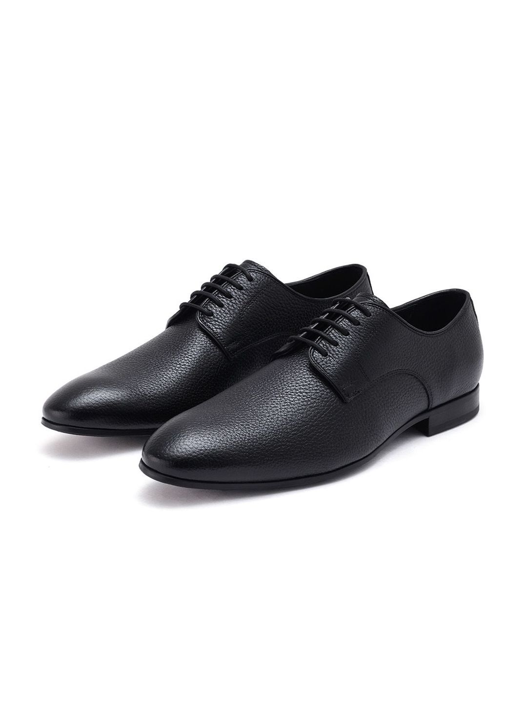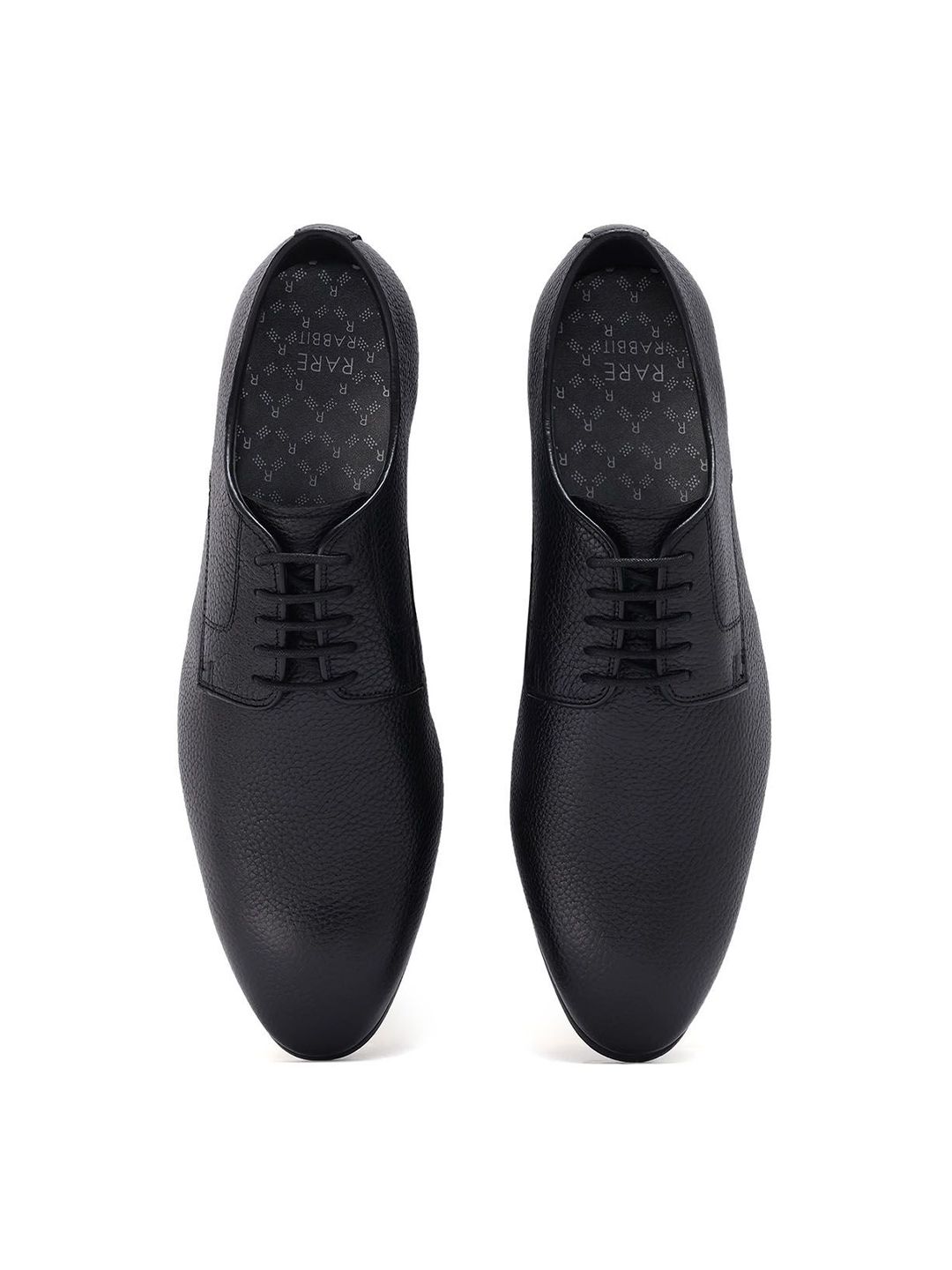 A pair of black solid round-toe formal derbys with regular styling has a lace-up closureLeather upperCushioned footbedTextured and patterned TPR outsoleWarranty: 1 MonthWarranty provided by brand/manufacturer