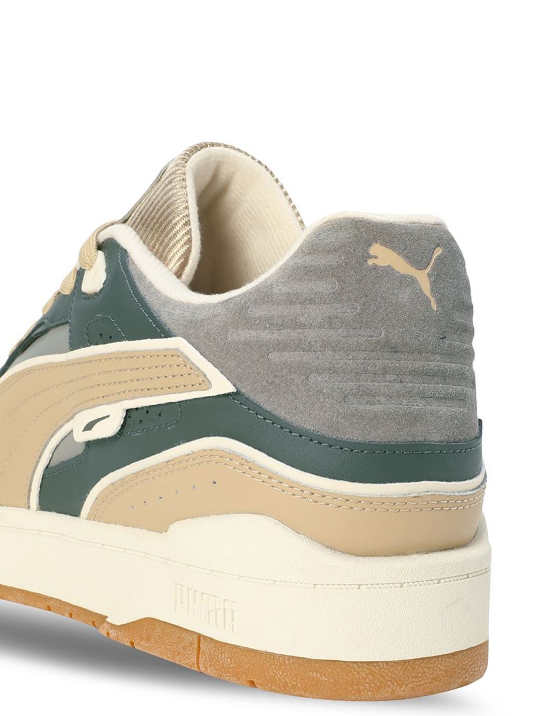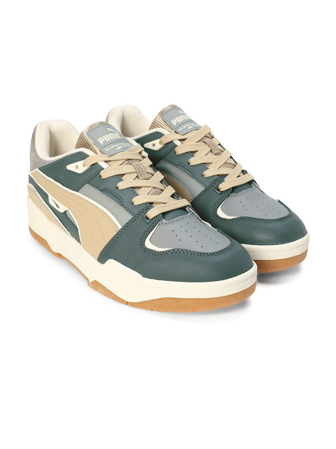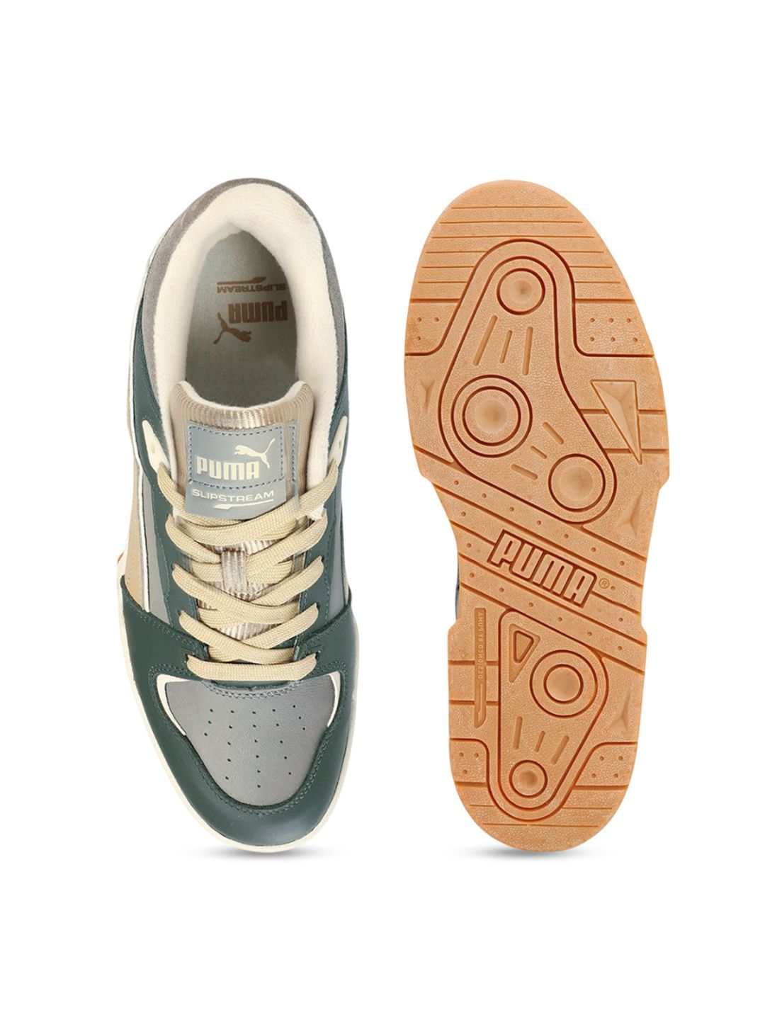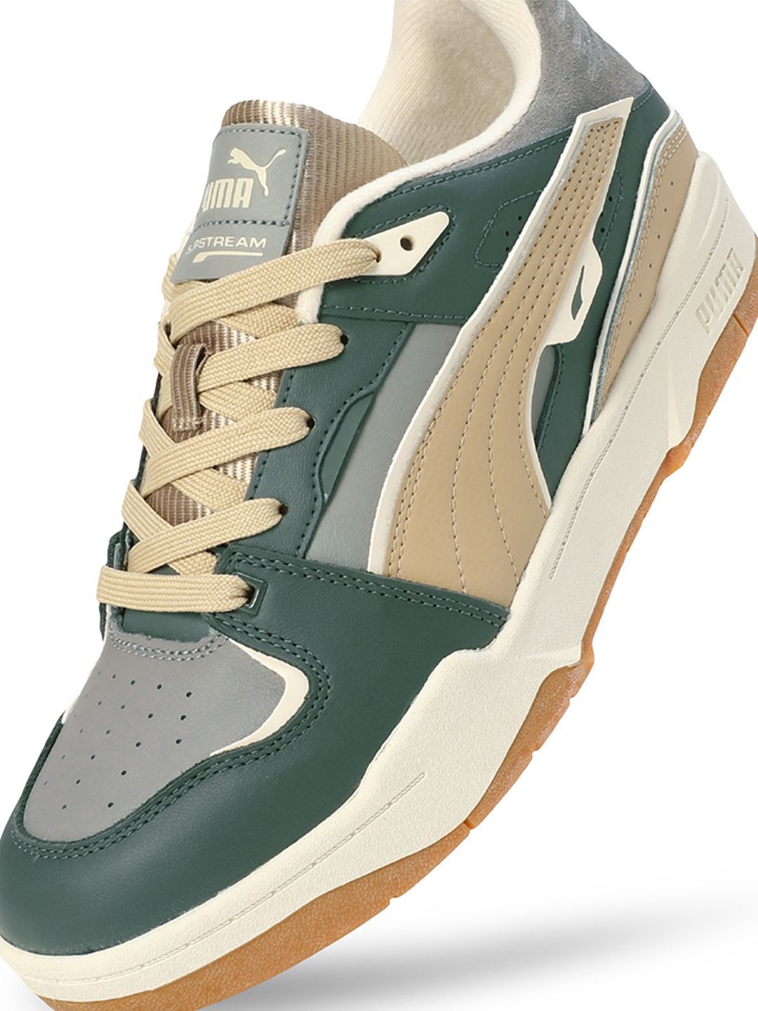 A pair of grey beige & white printed round toe casual sneakers with regular styling has a lace up closureLeather upperCushioned footbedTextured and patterned rubber outsoleWarranty: 3 MonthsWarranty provided by brand/manufacturerProduct Story Classic aesthetics and modern sneakerhead style come together in our Slipstream Bball Sneakers. Crafted with a perforated leather upper and contrast accents, these sneakers exude a clean yet refined vibe that's sure to turn heads. The zoned rubber outsole provides exceptional traction and durability, perfect for both on and off-court style. Details : Heel type: Flat, Shoe width: Regular fit, Heel-to-toe-drop: 0 mm, Shoe pronation: Neutral, Low boot construction, Leather upper, Leather vamp and vamp overlay, Zoned Rubber outsole, Synthetic leather quarter panel and eyestay, PUMA Formstrip on lateral side, Lace closure.