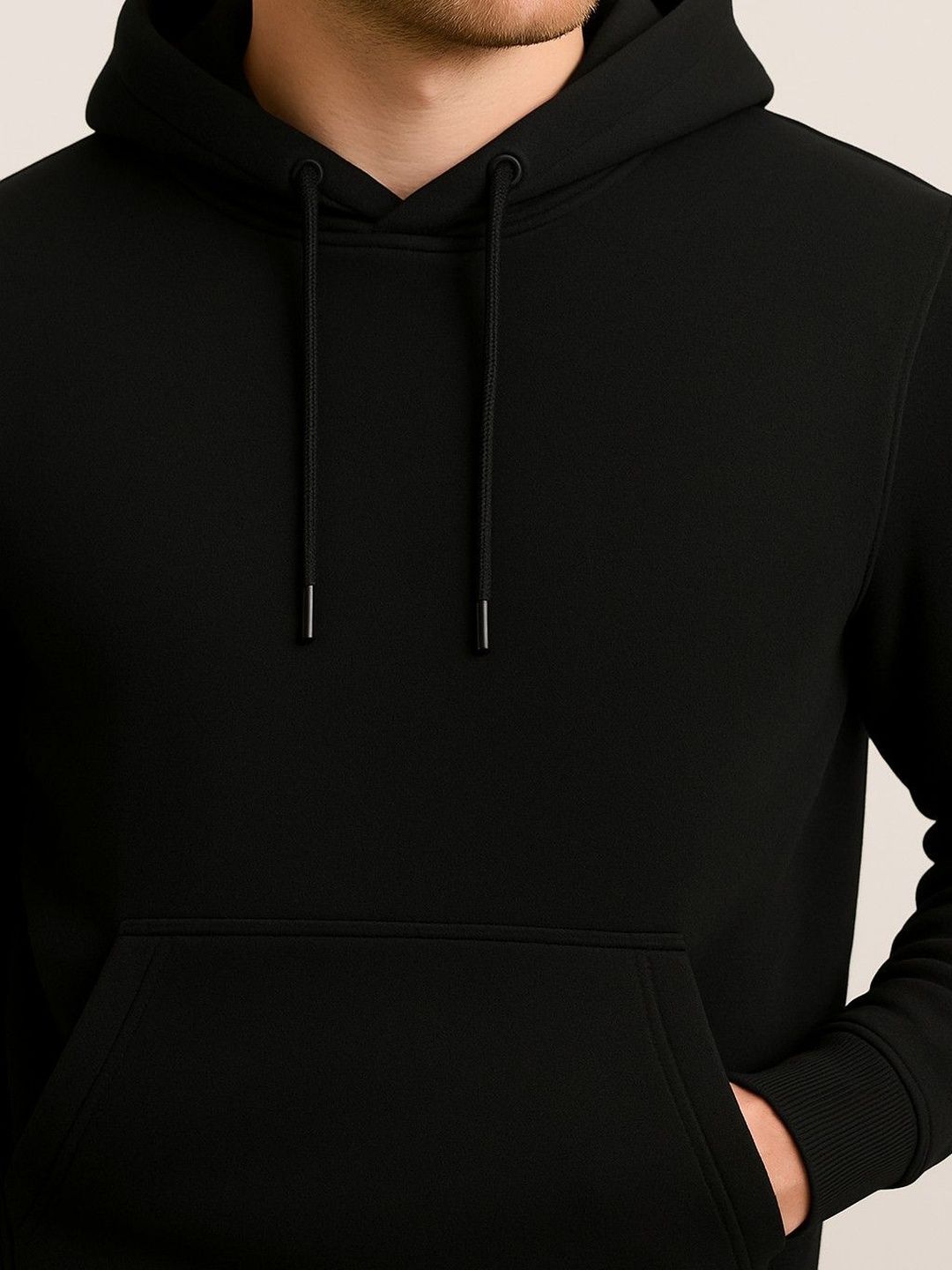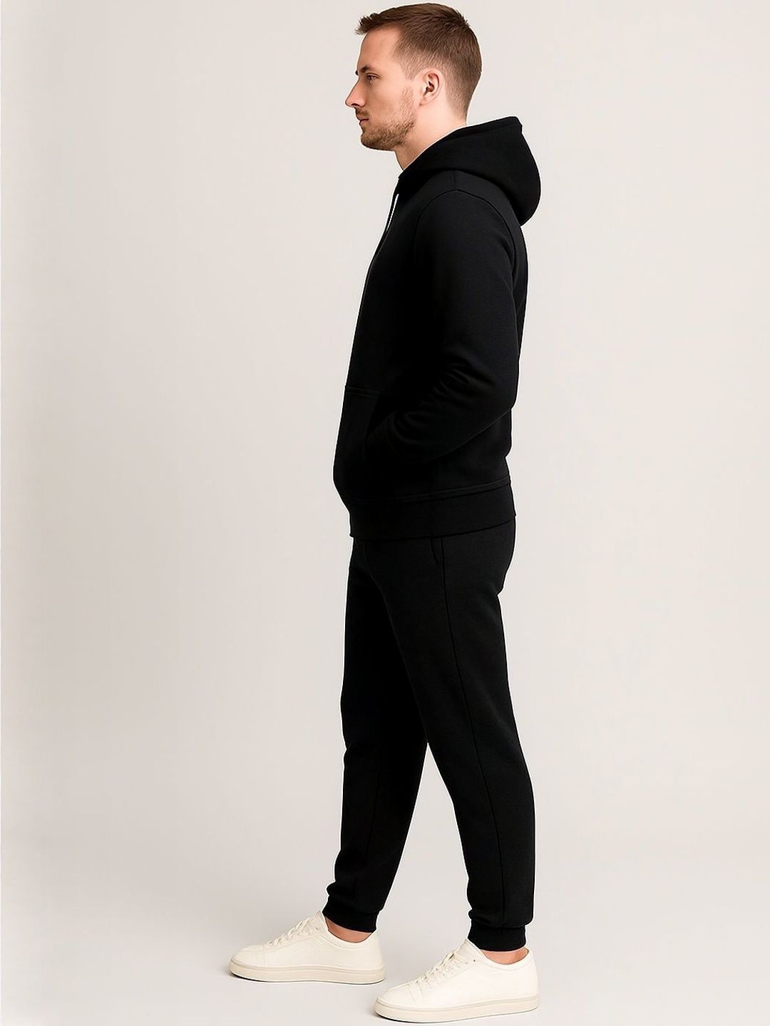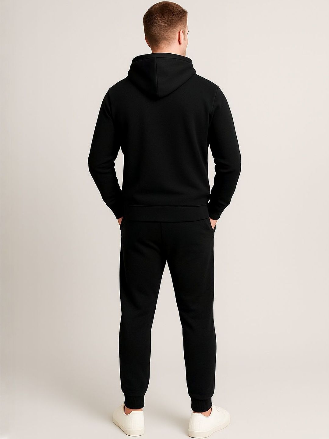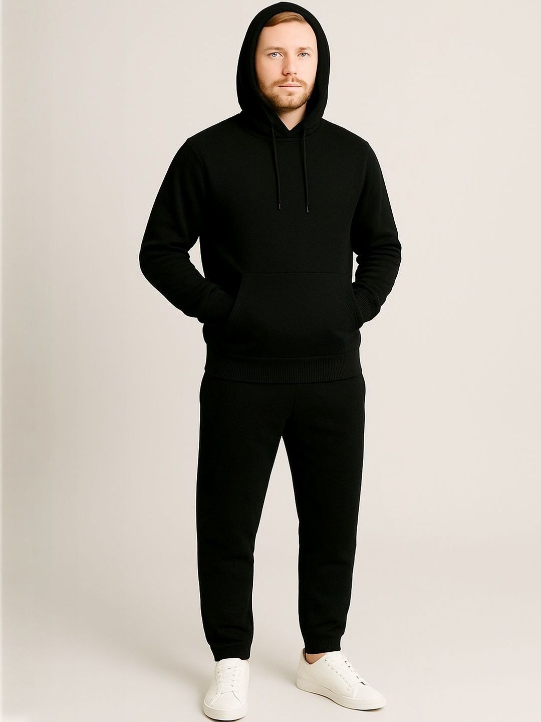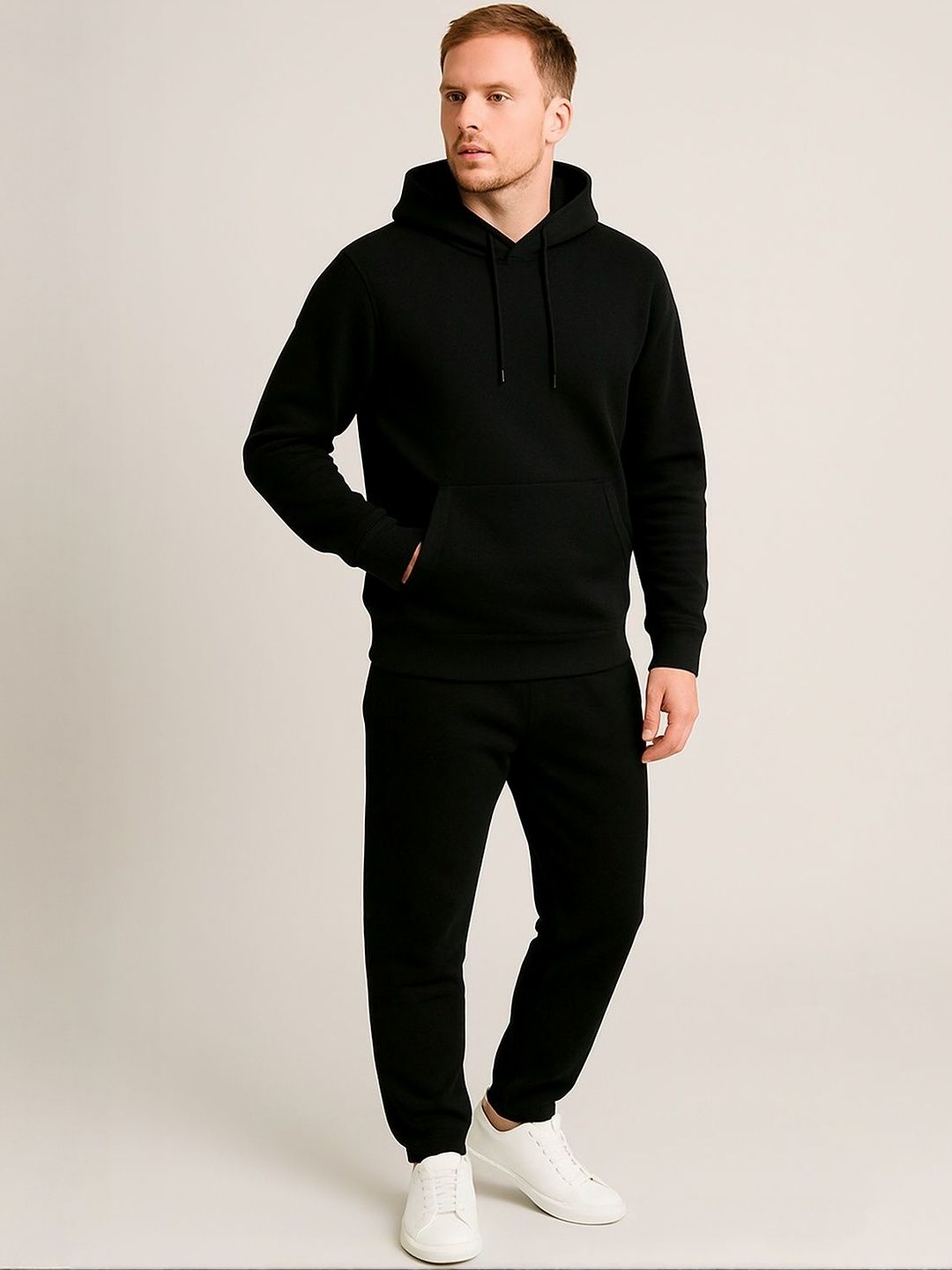 Black solid tracksuitBlack solid sweatshirt, has a hooded neck with drawcords, long sleeves with ribbed cuffed hems and kangaroo pocketBlack solid mid-rise joggers, has an elasticated waistband with drawstring closure, ribbed cuffed hems and two pockets
