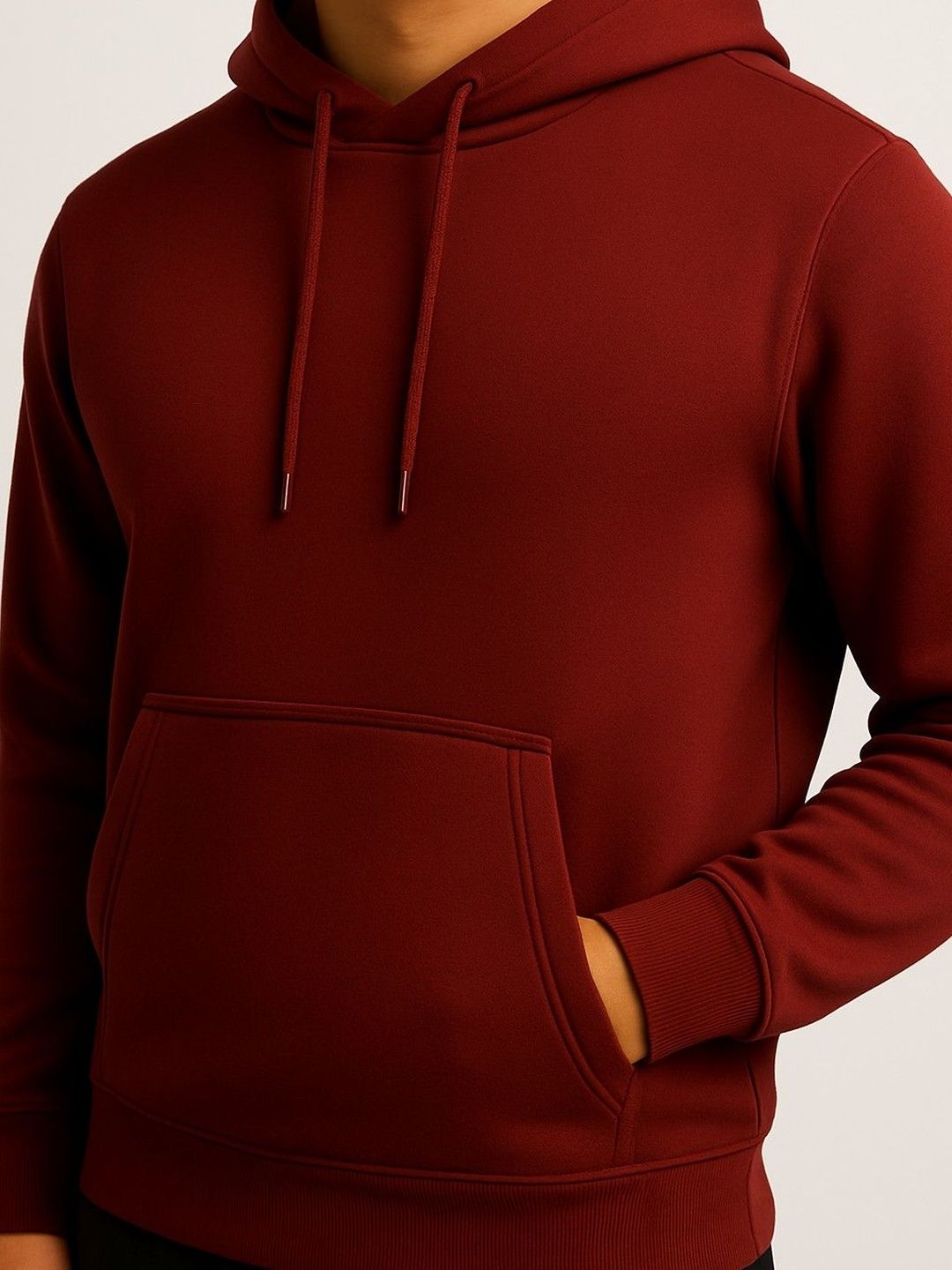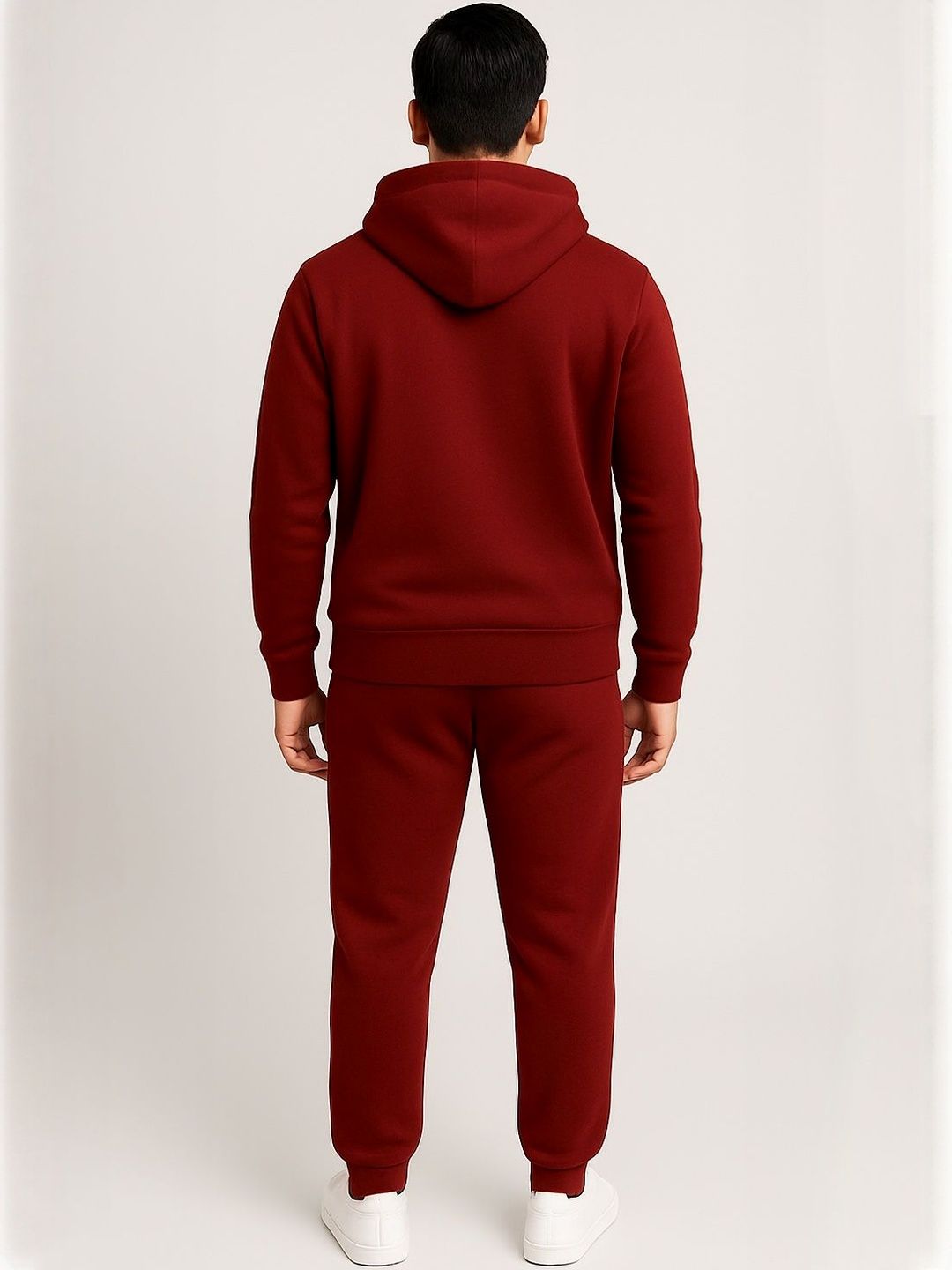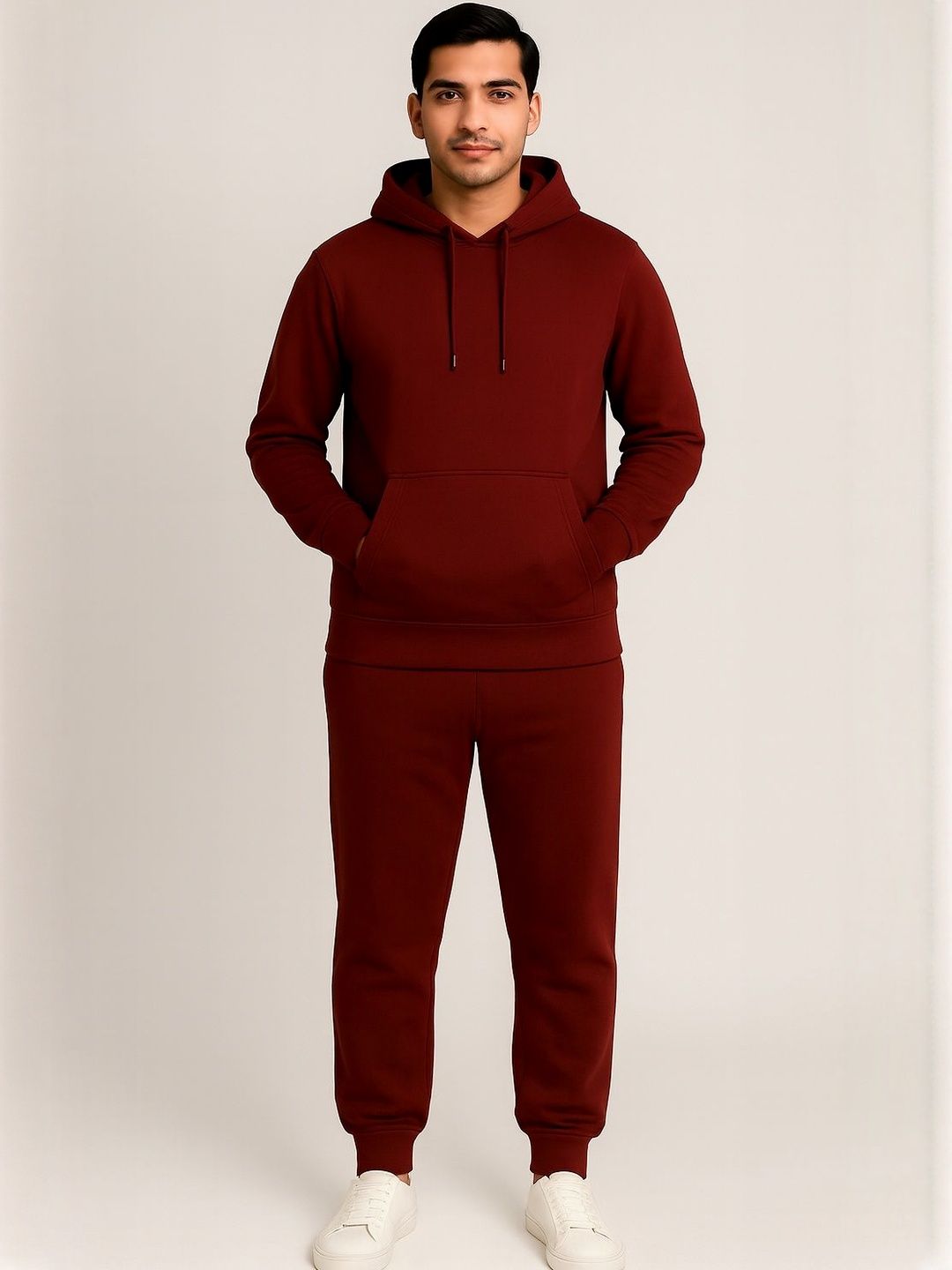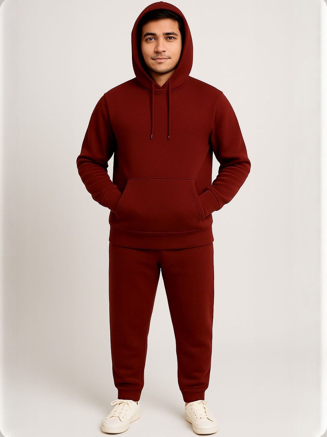 Maroon solid tracksuitMaroon solid sweatshirt, has a hooded neck with drawcords, long sleeves with ribbed cuffed hems and kangaroo pocketMaroon solid mid-rise joggers, has an elasticated waistband with drawstring closure, ribbed cuffed hems and two pockets