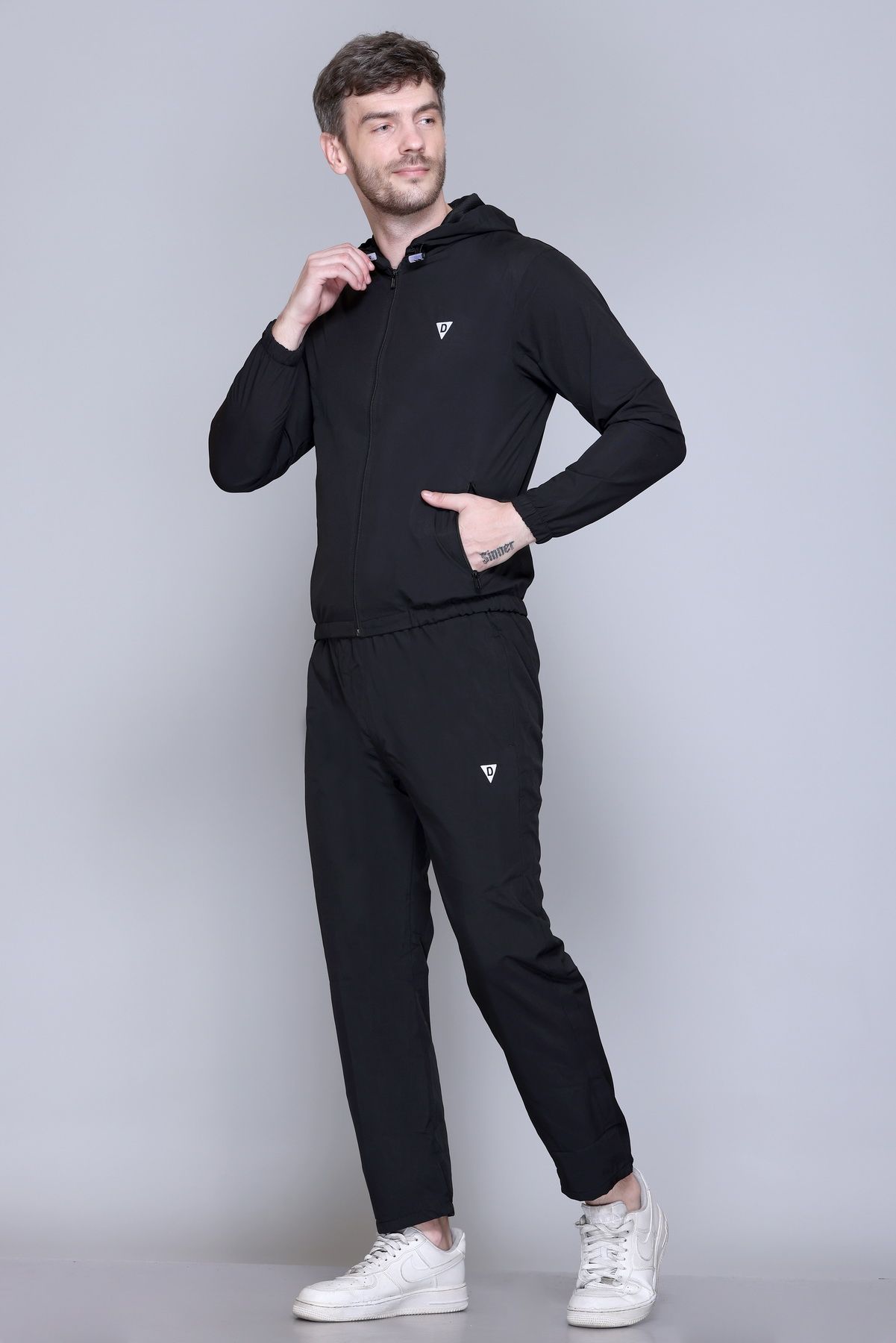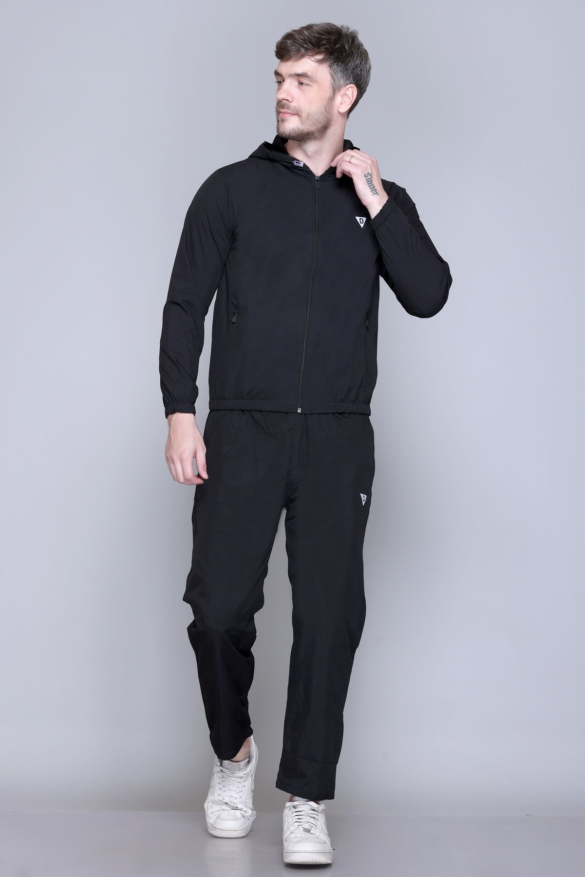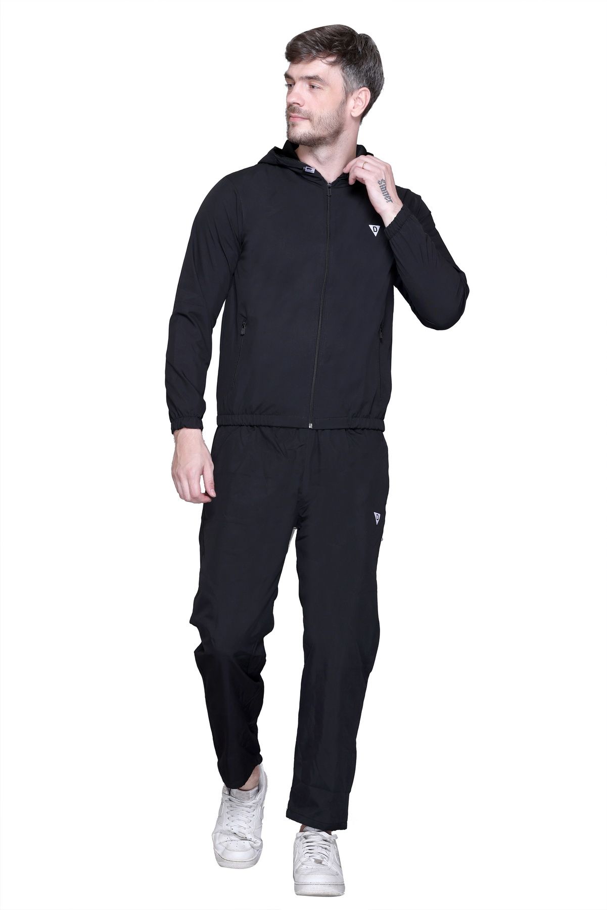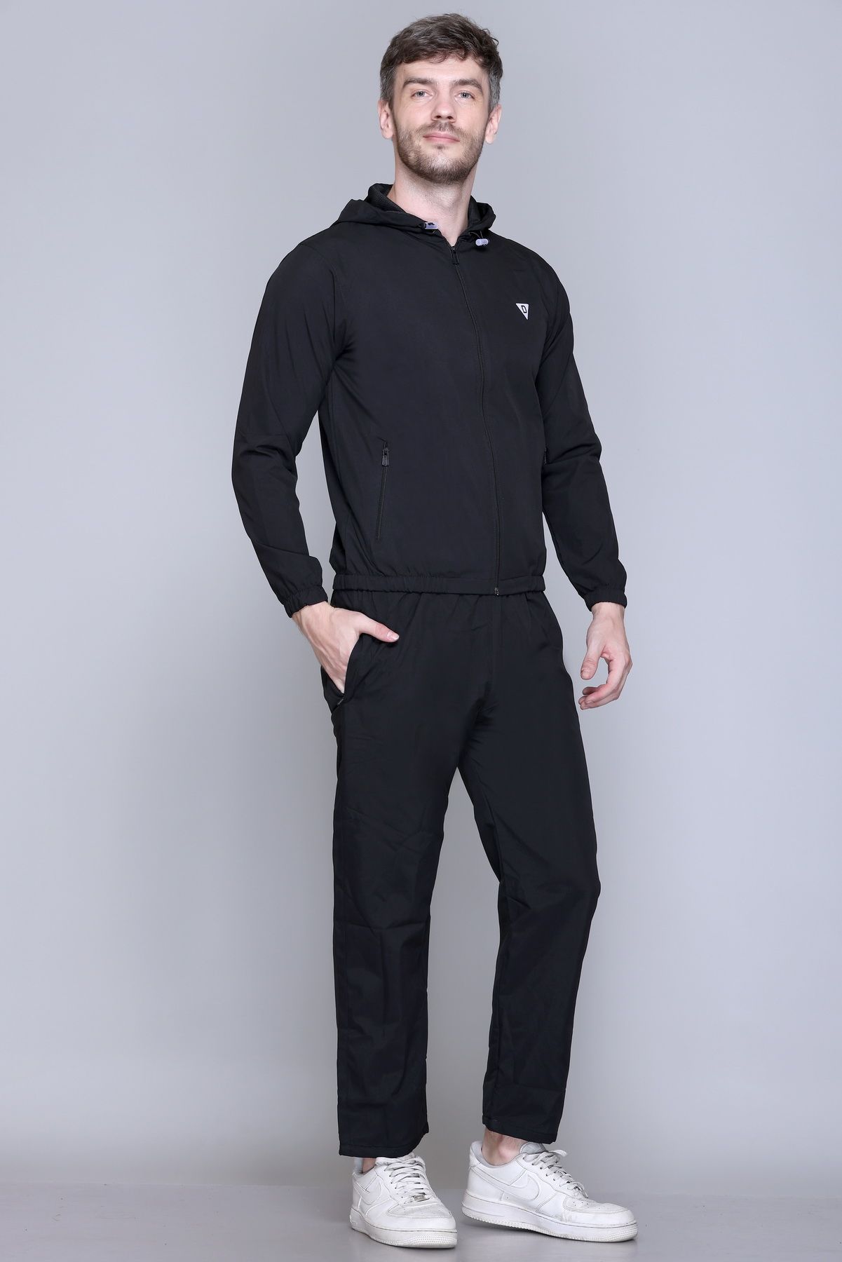 Black solid tracksuitBlack Solid sports jacket has a mock neck, long sleeves and zip closureBlack solid mid-rise trackpants, has an elasticated waistband with slip on closure