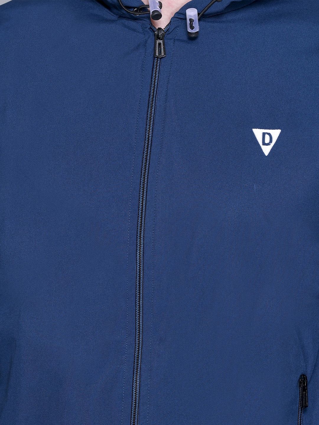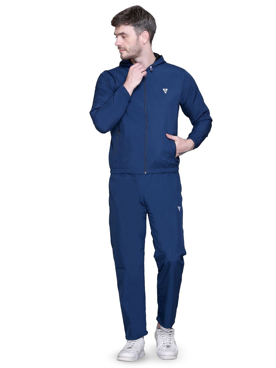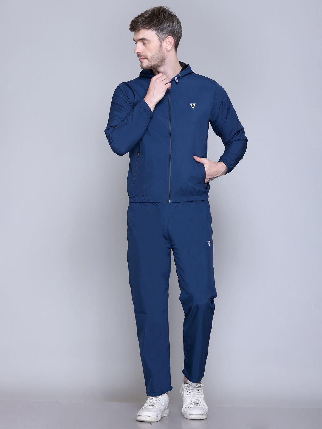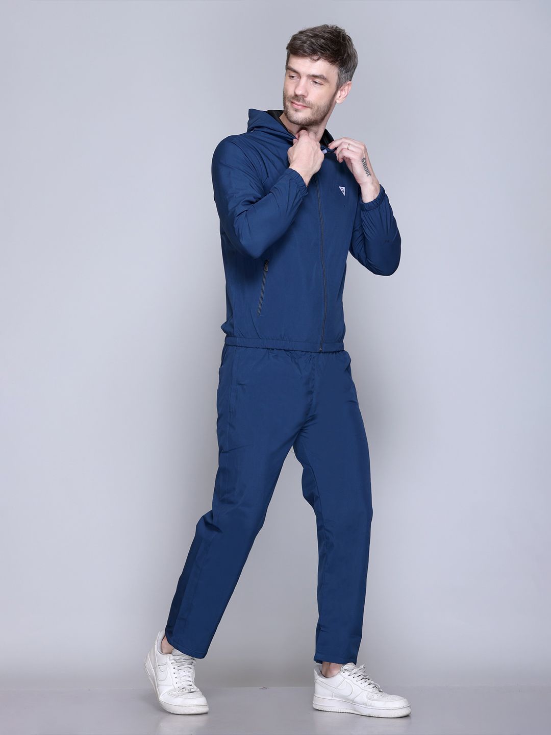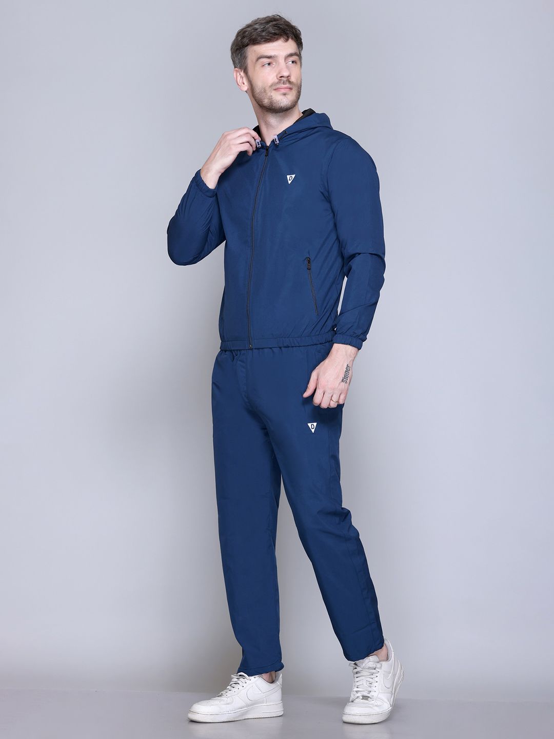 Blue color tracksuitBlue color solid jacket has hooded collar long sleeve with zip closure Olive color solid mid-rise track pant has an elasticated waistband, slip-on closure