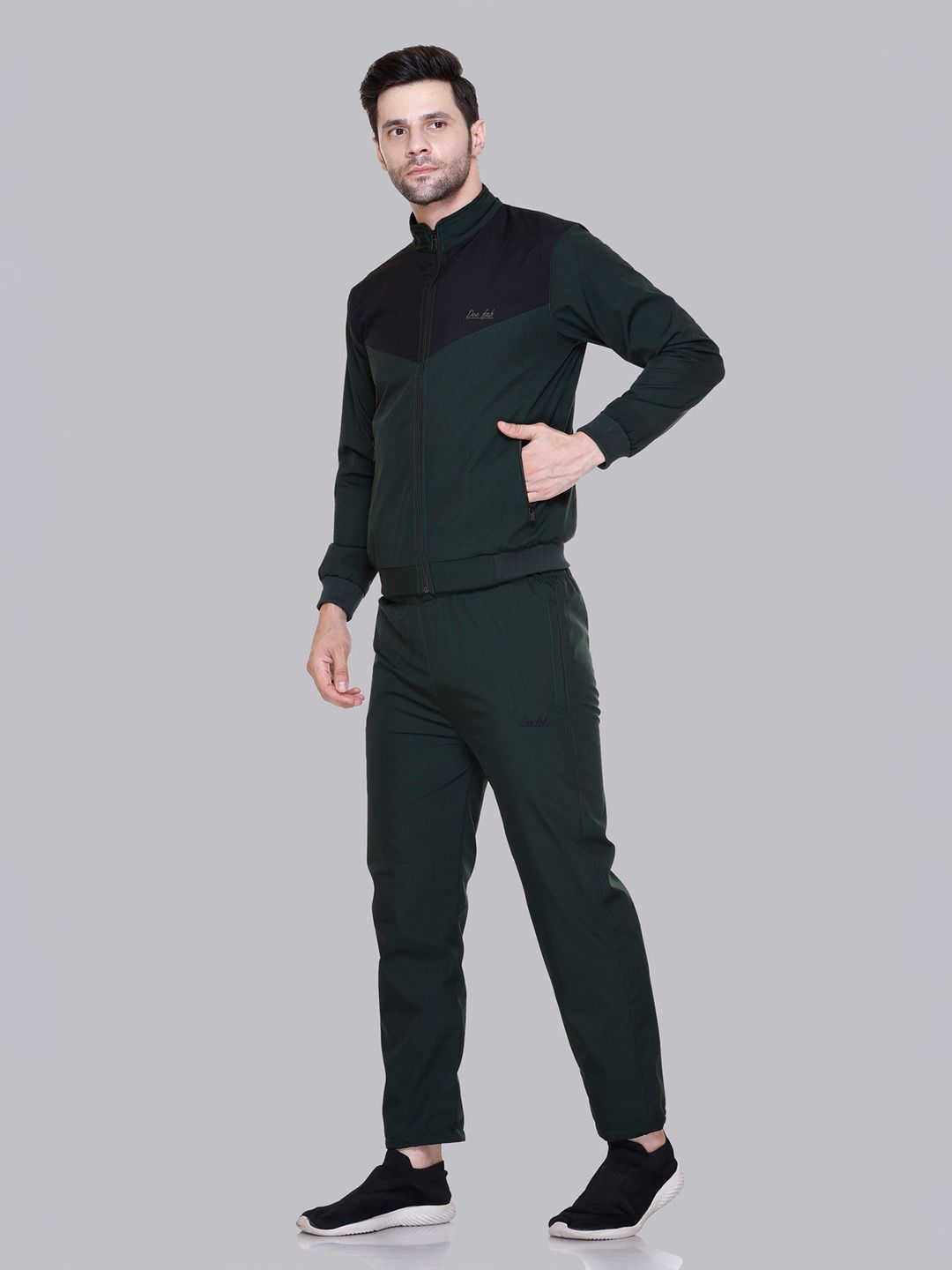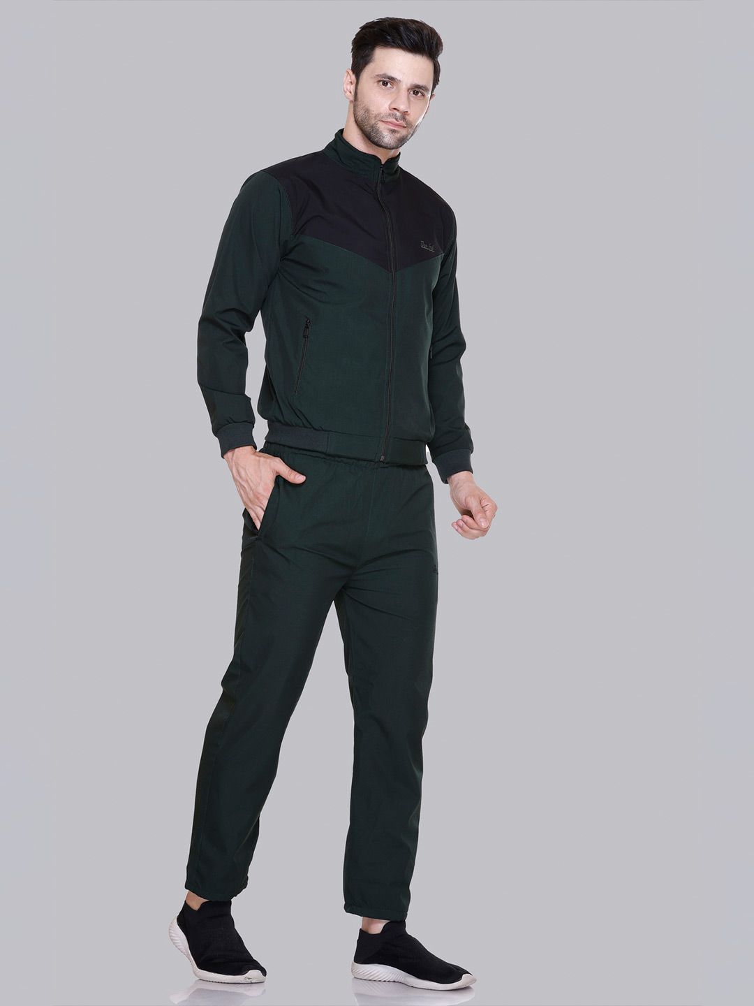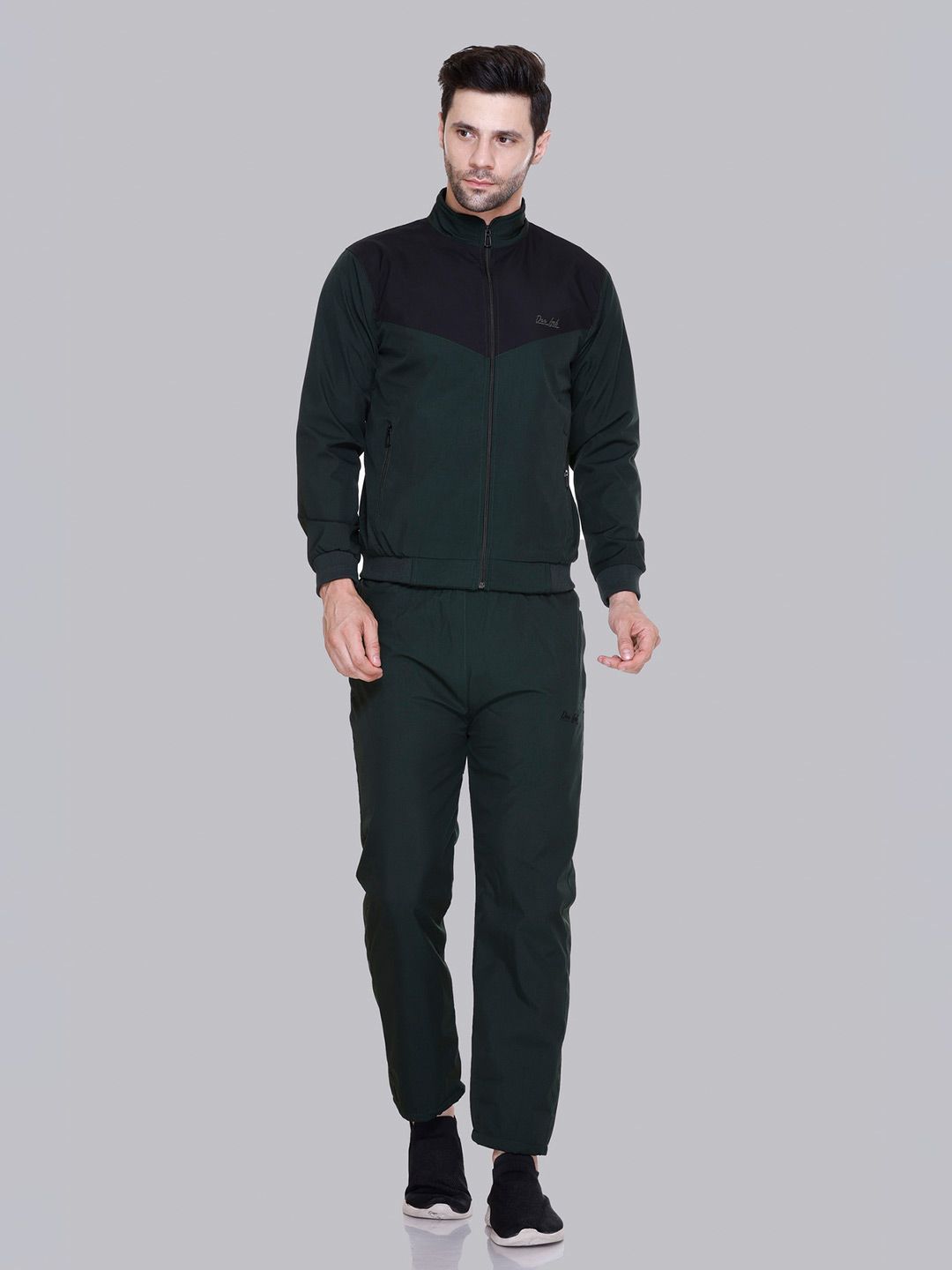 Olive color tracksuitOlive color solid jacket has mock collar long sleeve with zip closure Olive color solid mid-rise track pant has an elasticated waistband, slip-on closure