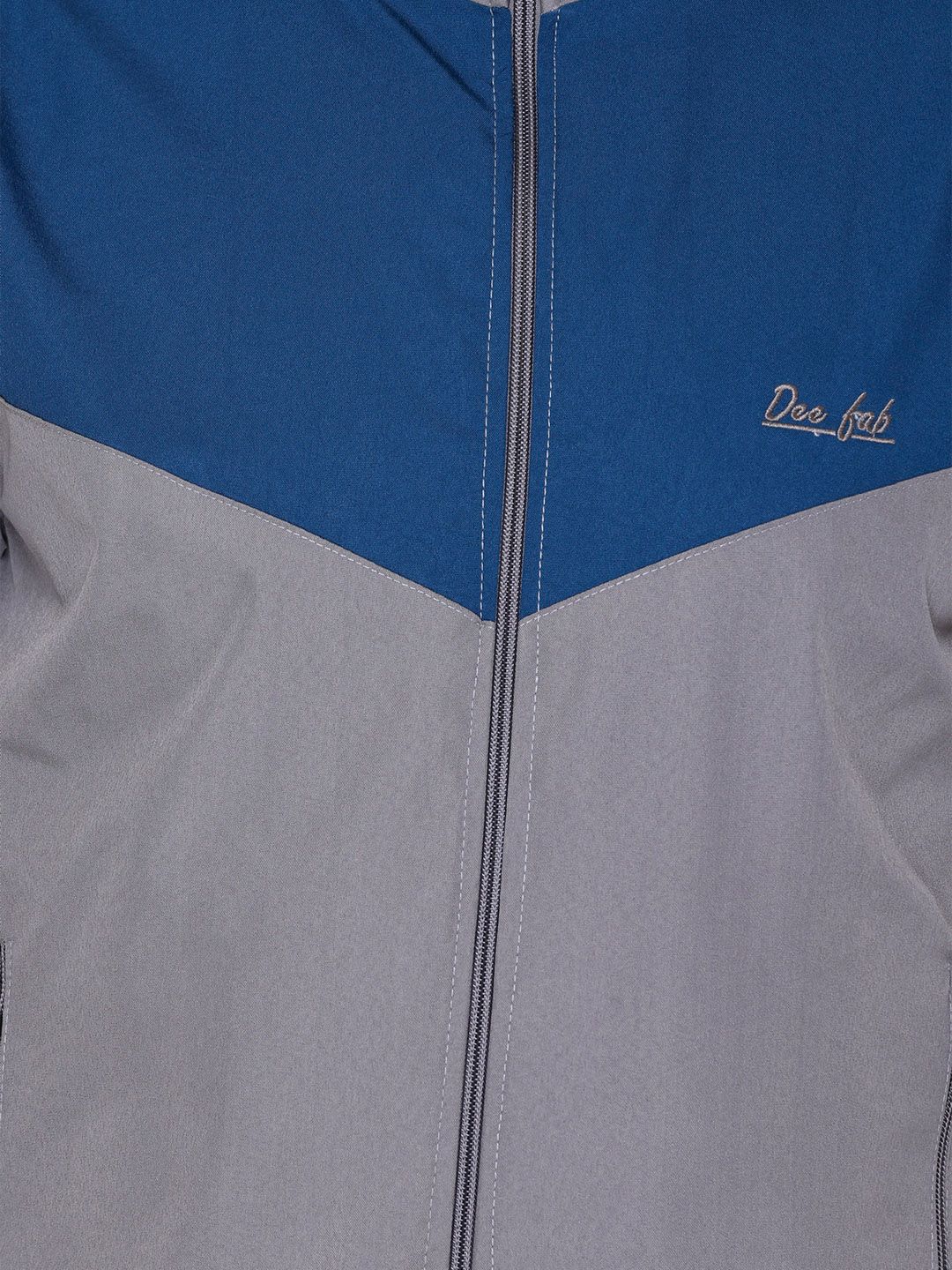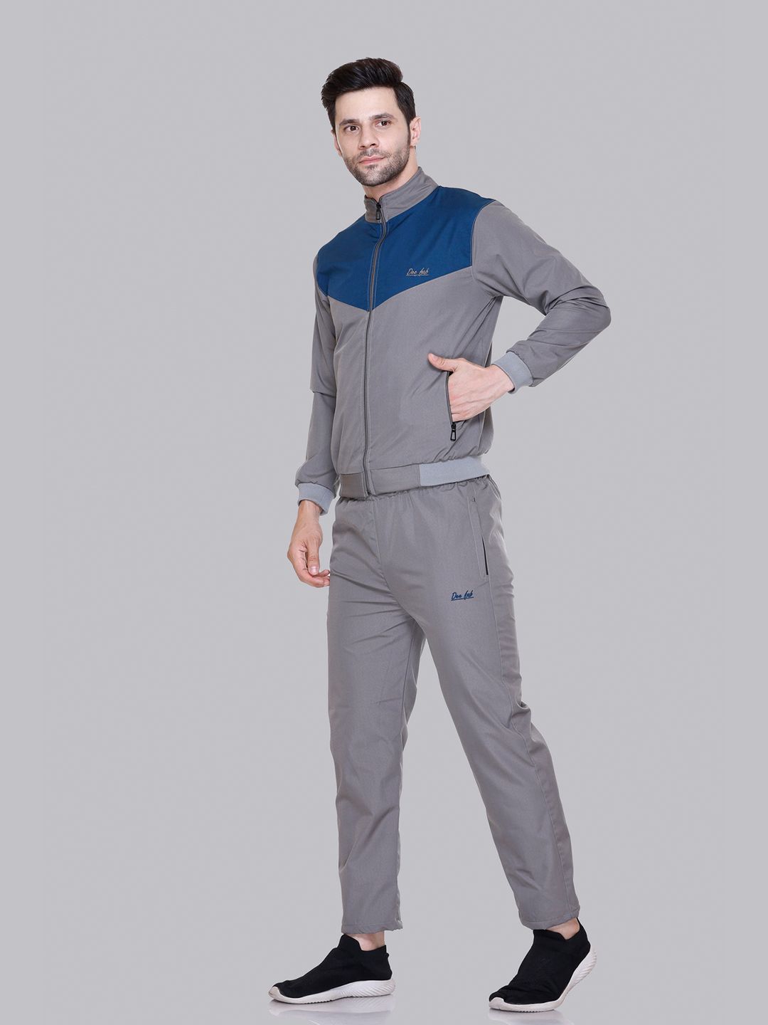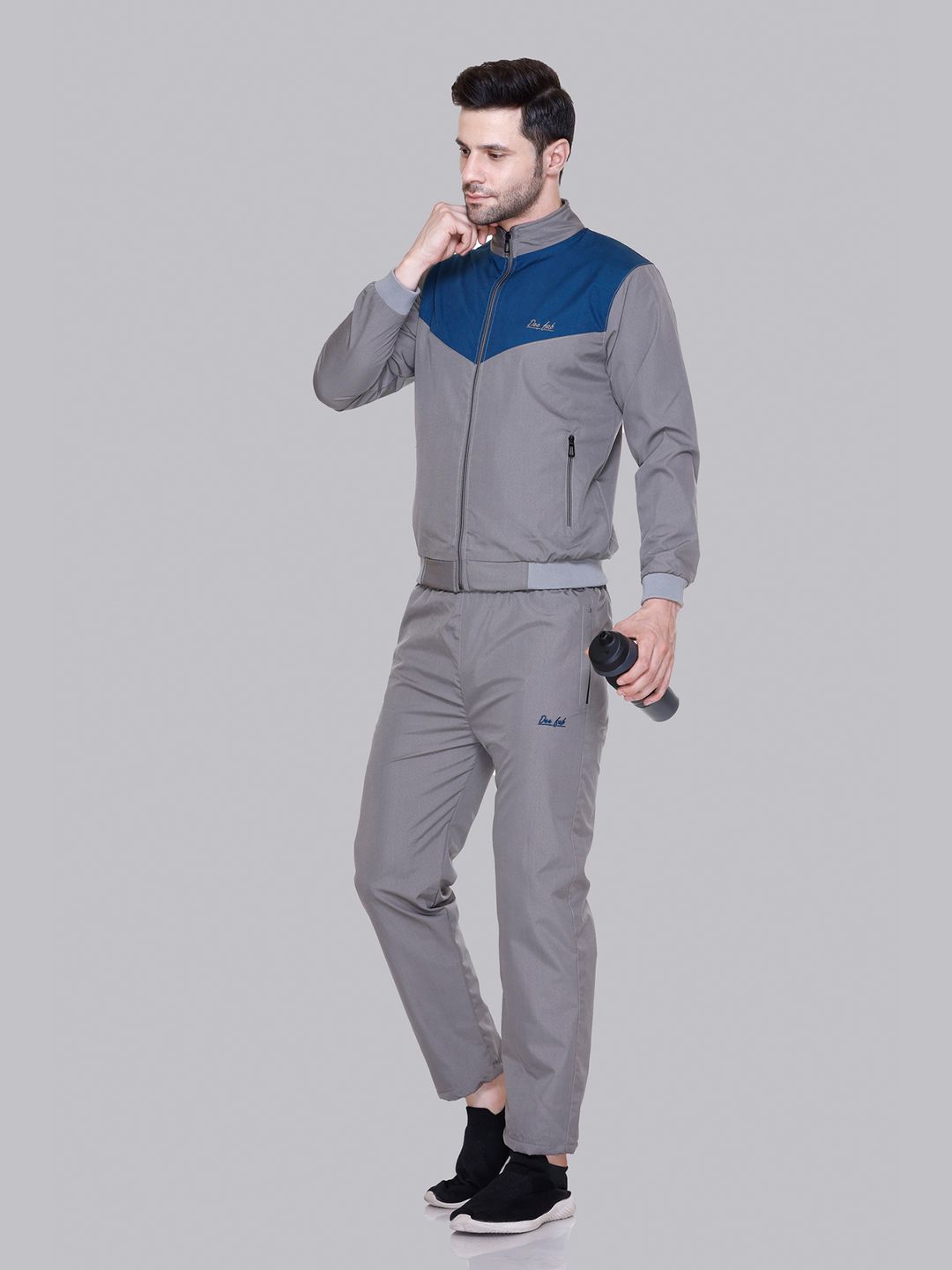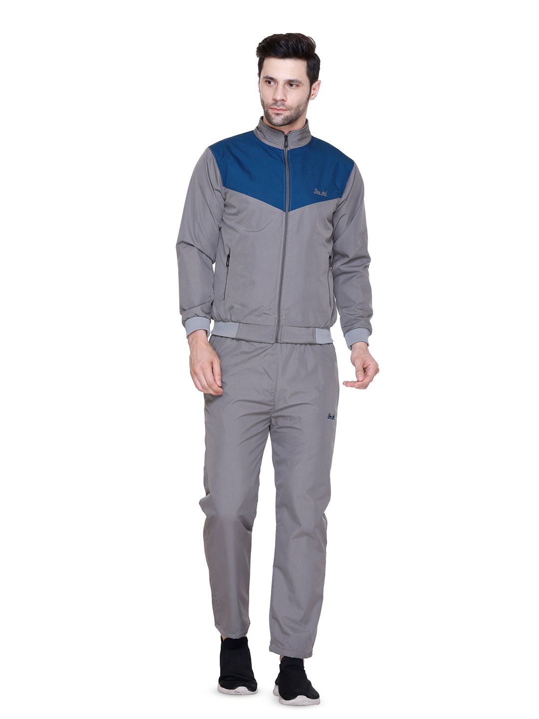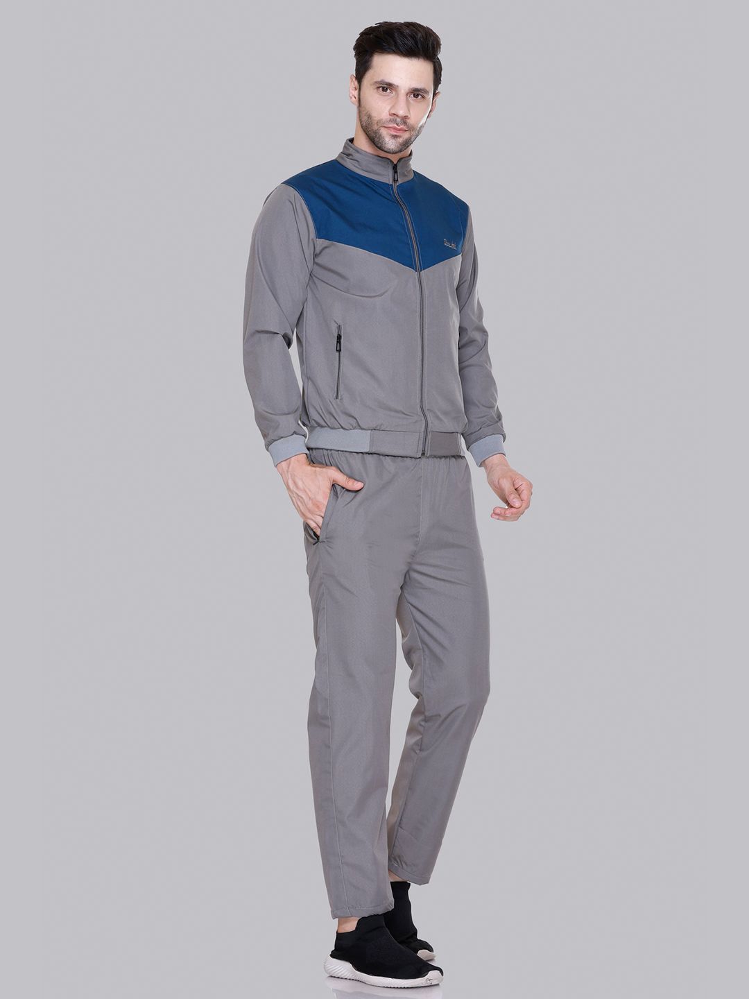 Grey and blue color block tracksuitGrey and blue color block sweatshirt, has a mock collsr neck and long sleevesGrey solid mid-rise track pants has an elasticated waistband with drawstring closure and two pockets