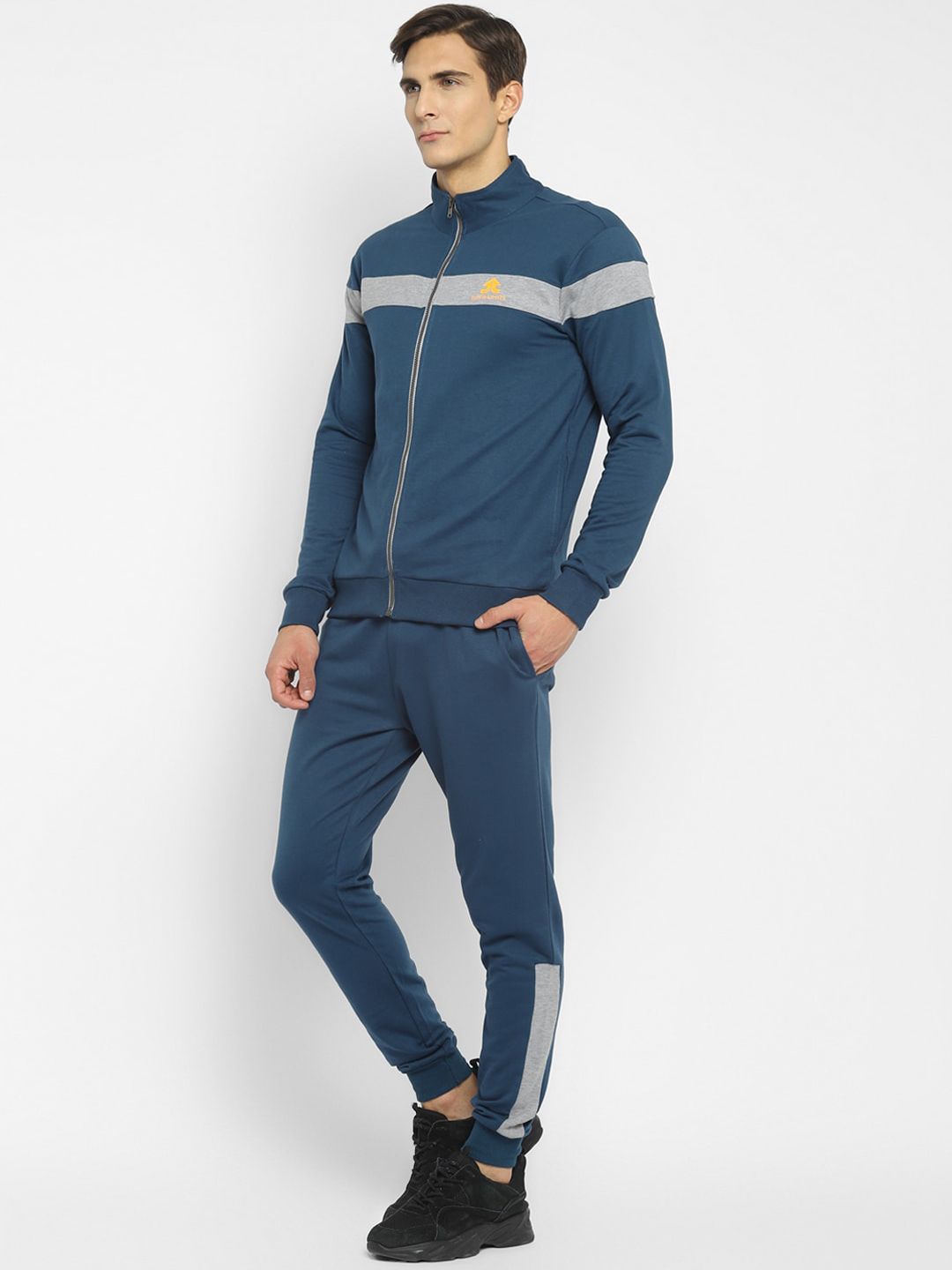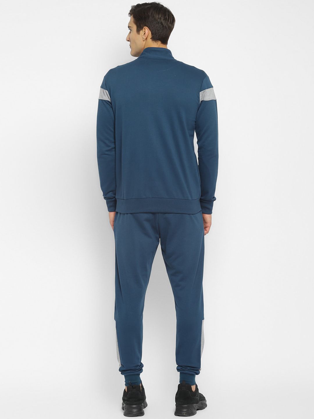 This tracksuit consists of a jacket and a pair of joggersTeal blue and grey solid jacket, has a mock collar, long sleeves with ribbed cuffs, a full zipper placket, and two pocketsTeal blue solid mid-rise joggers with contrast side panel detail, has an elasticated waistband, two pockets and cuffed hems