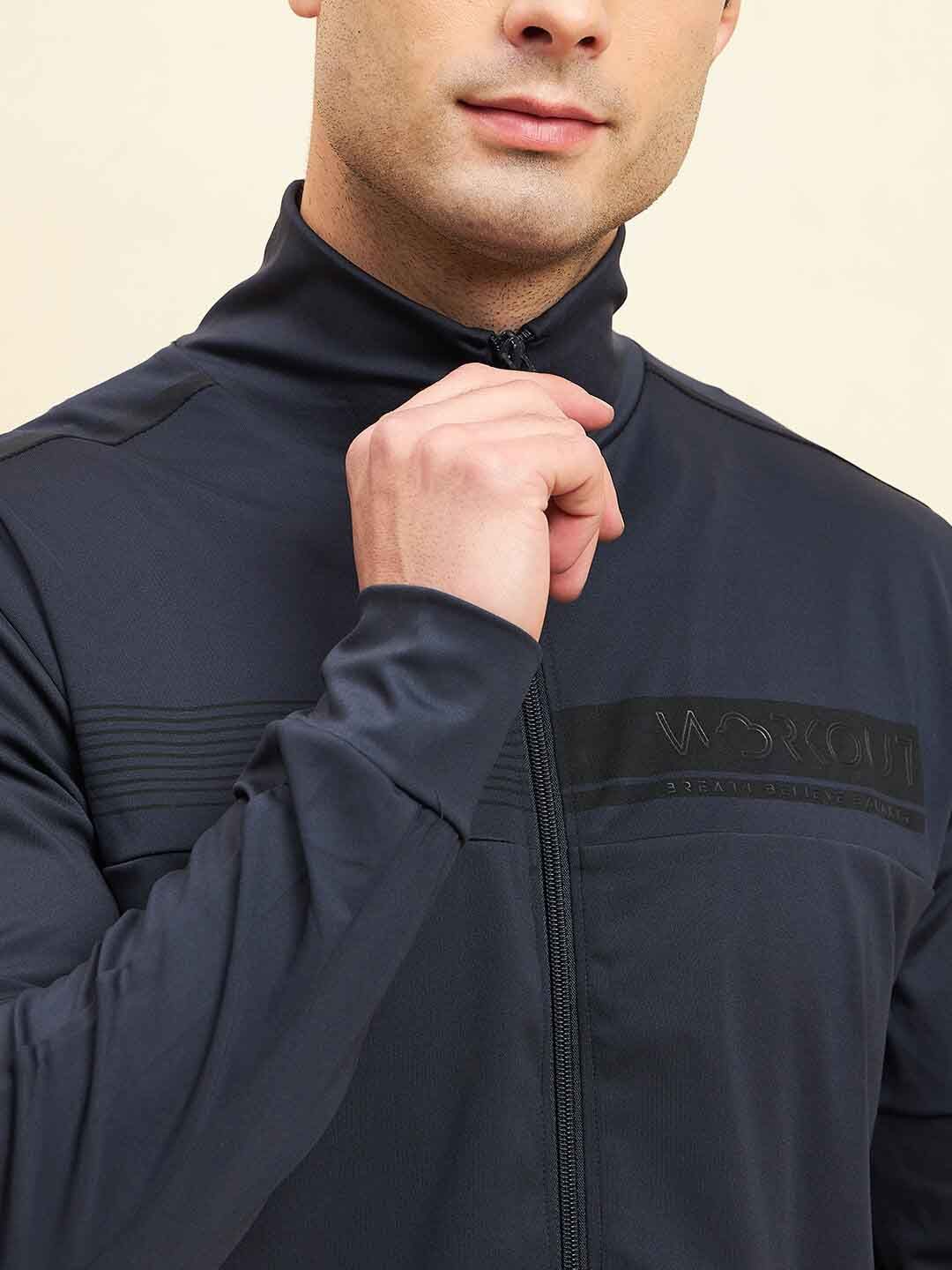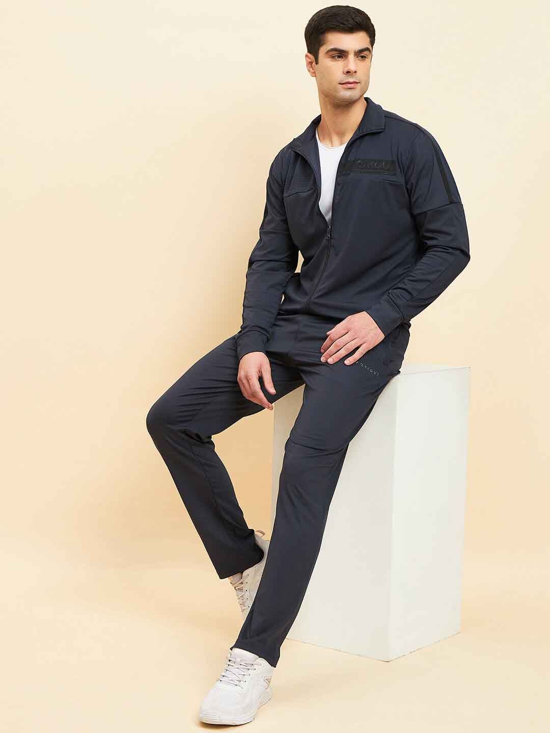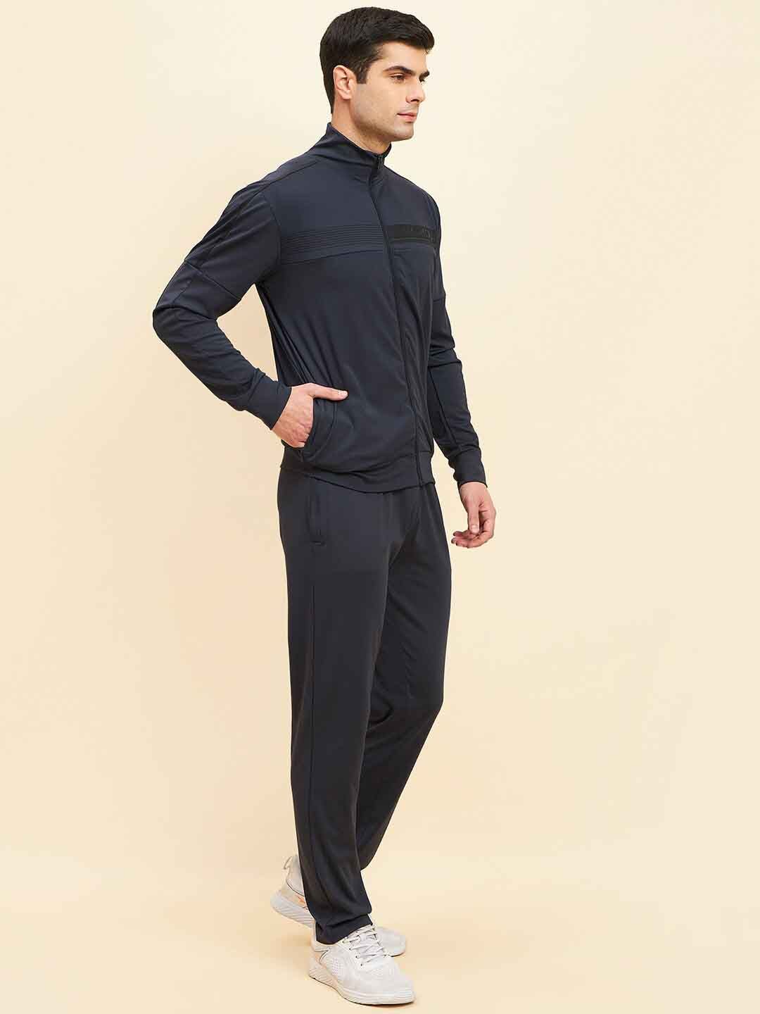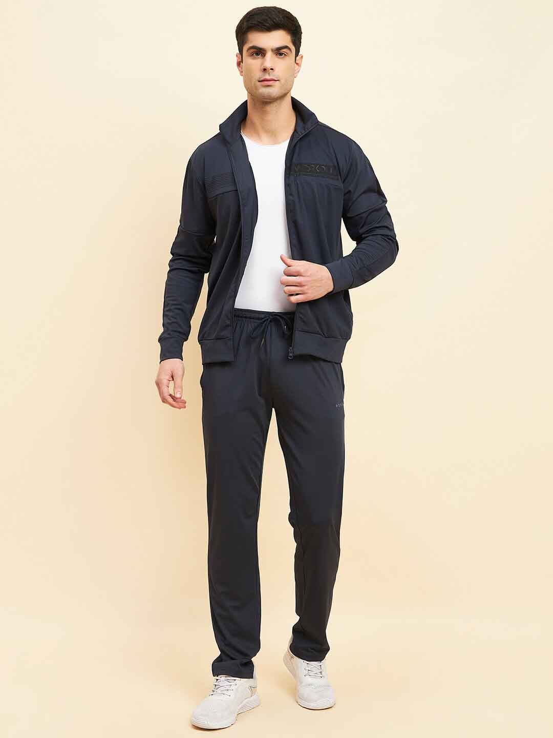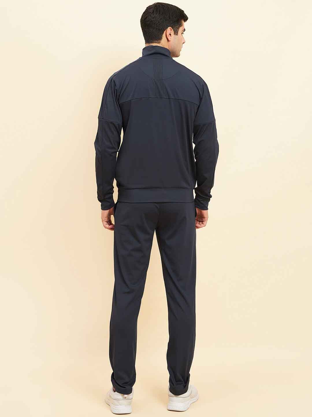 Navy blue solid tracksuitNavy blue solid track jacket, mock collar, long sleeves and zip closureNavy blue solid high-rise ankle-length track pant, has an elasticated waistband, slip-on closure