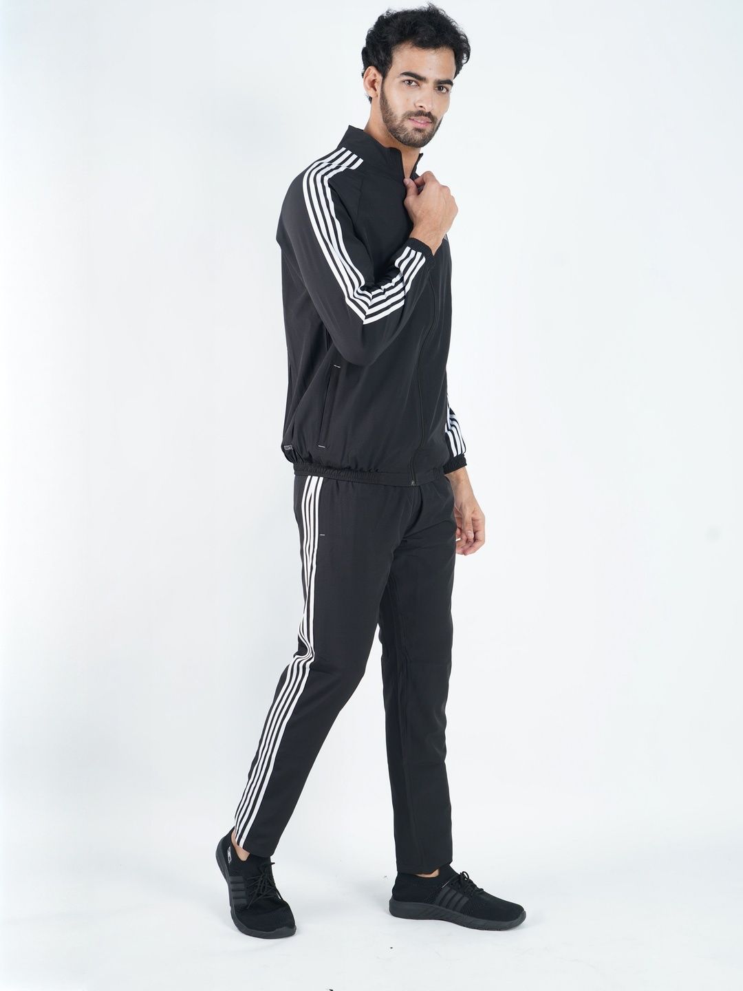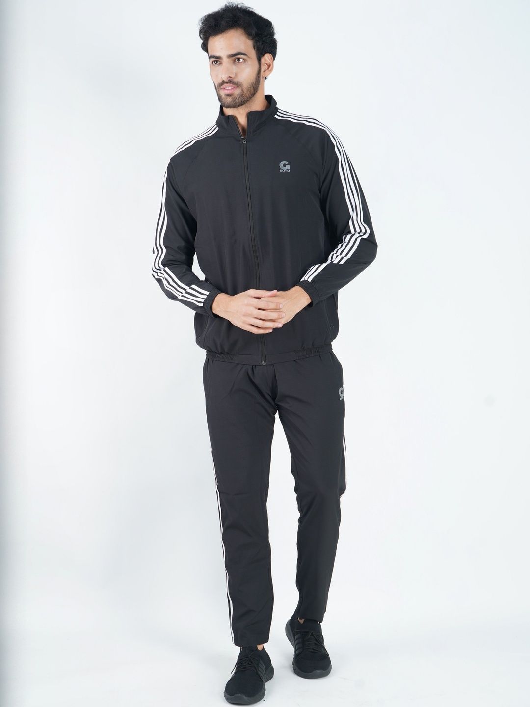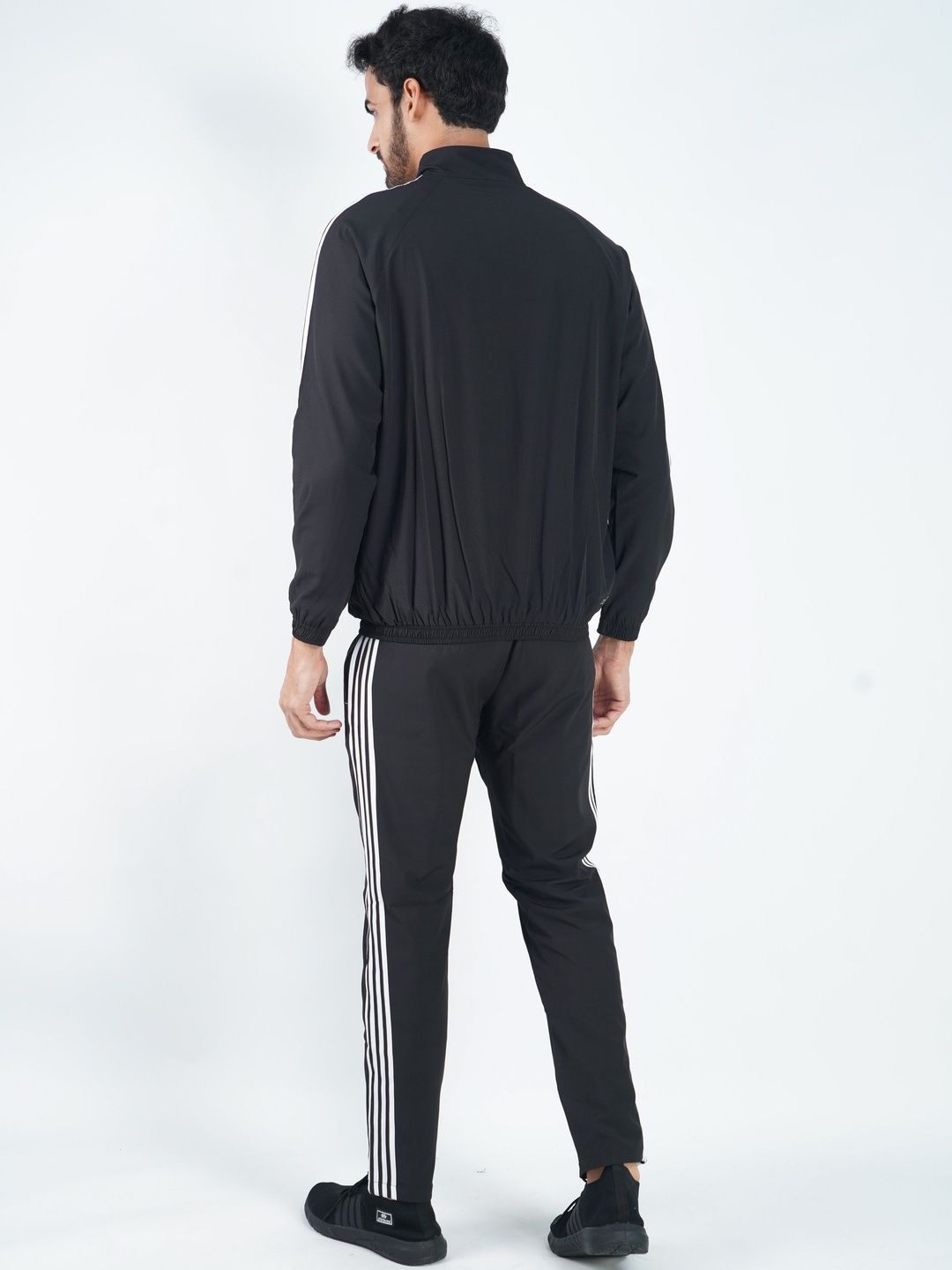 Black solid tracksuitBlack solid jacket, has a mock neck and long sleevesBlack solid mid-rise track pants has an elasticated waistband with drawstring closure and two pockets