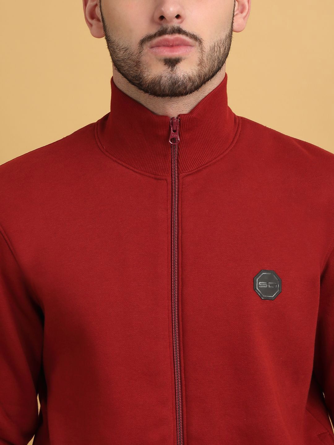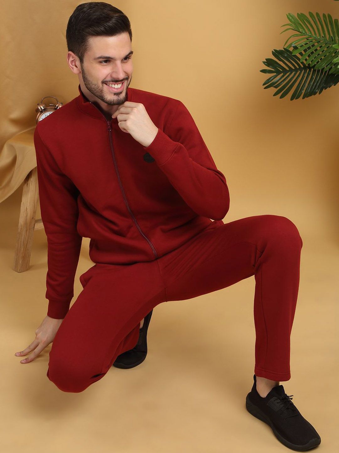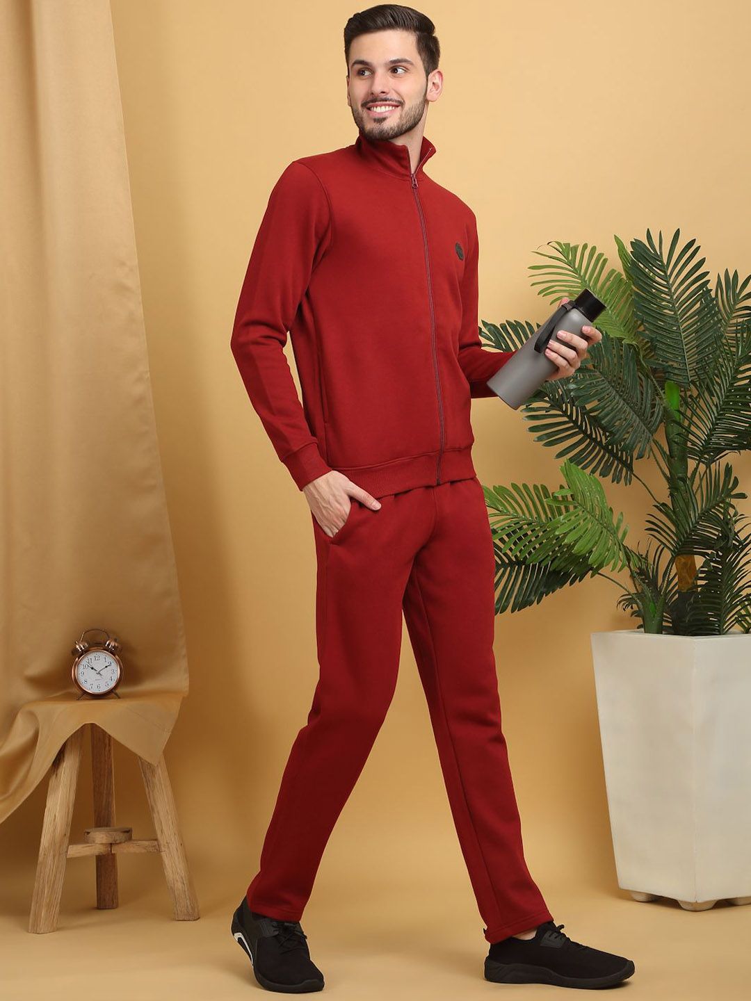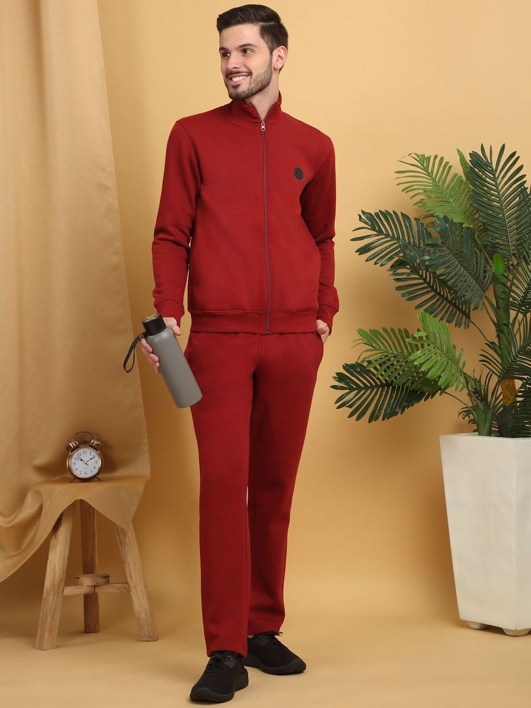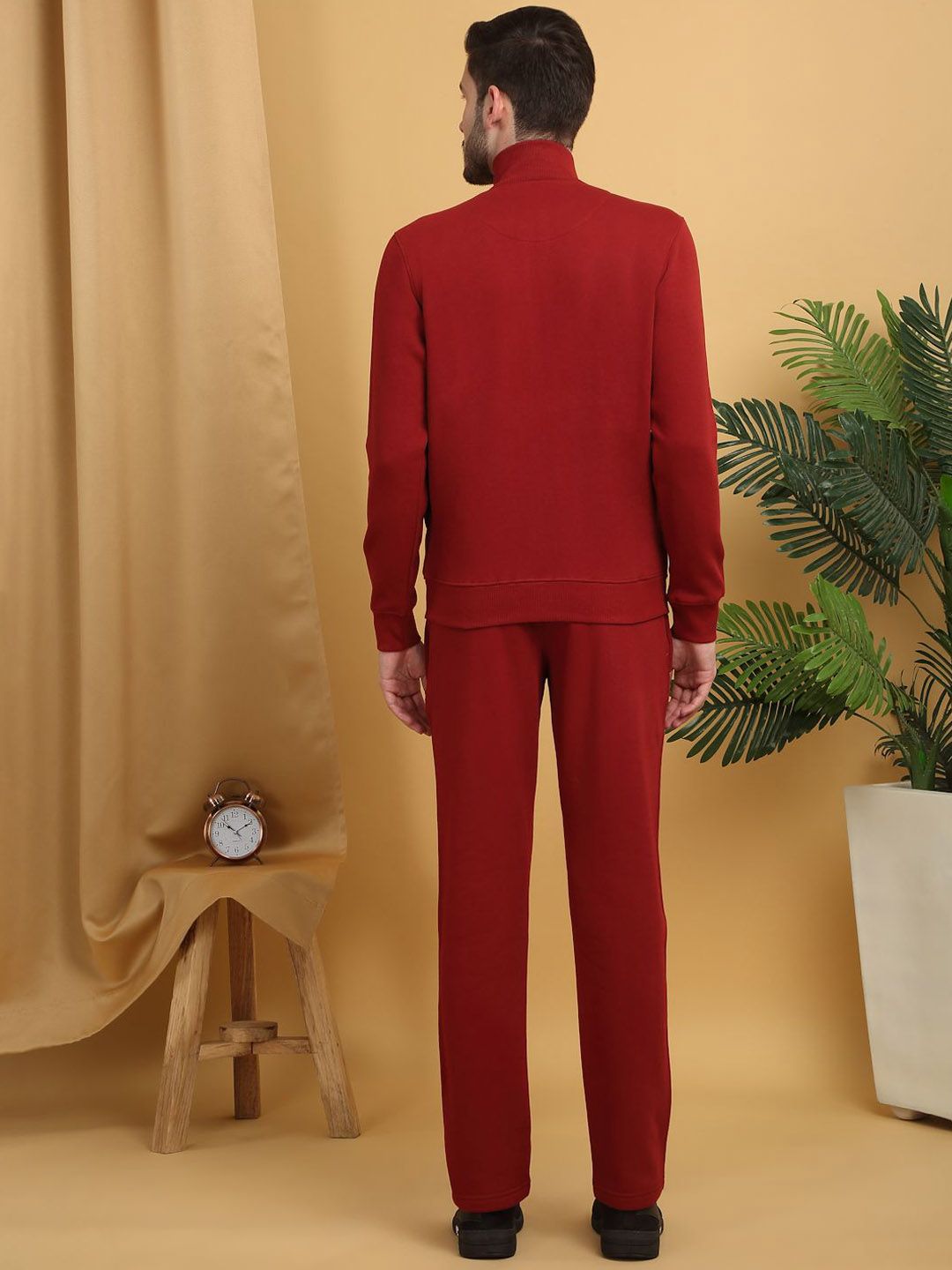 This tracksuit consists of a jacket and a pair of track pantsRed solid jacket has a polo neck, front-open with full zipper closure, two pockets, long sleevesRed solid mid-rise track pants has an elasticated waistband with drawstring closure and two pockets