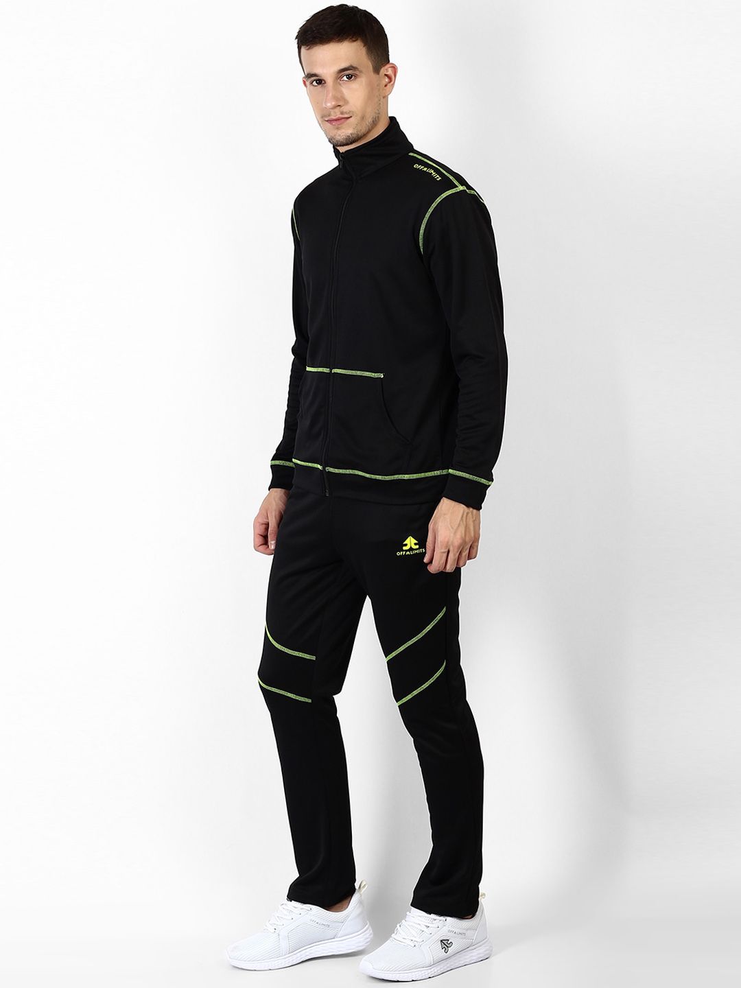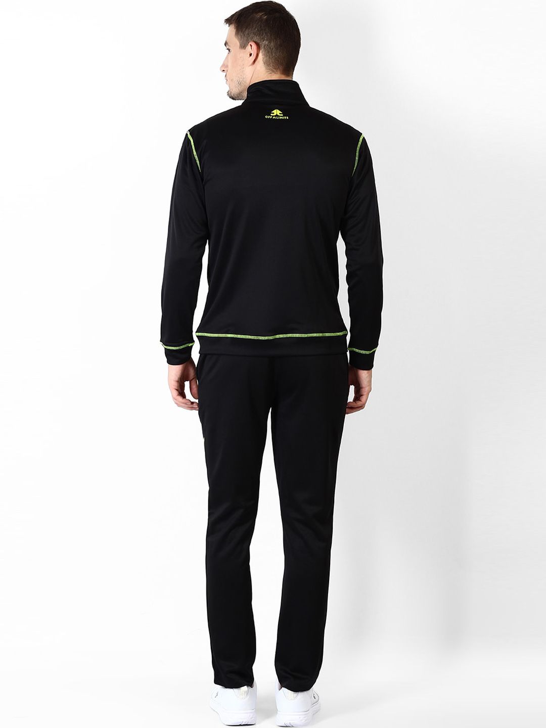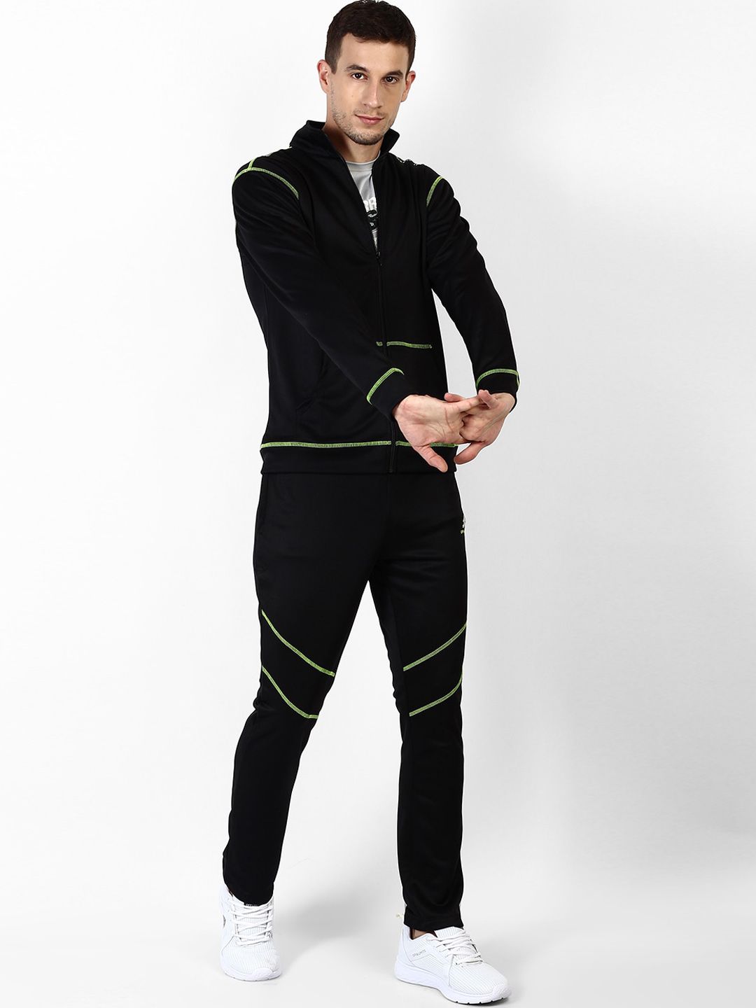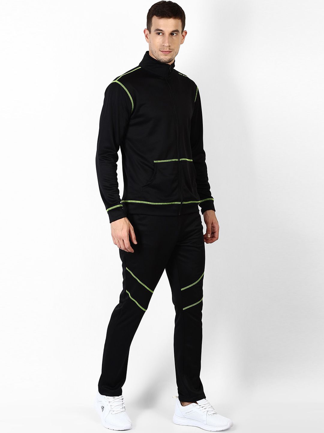 Black solid tracksuitBlack solid sweat jacket, has mock collar, long sleeves with ribbed cuffs, button closure and two pocketsBlack solid mid-rise joggers, has an elasticated waistband with slip-on closure, two pockets and cuffed hems