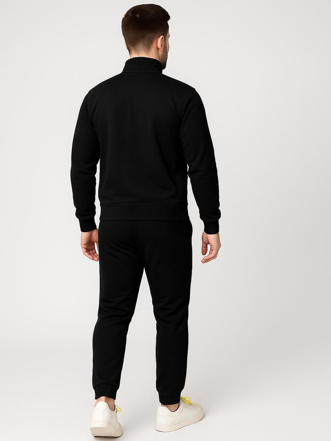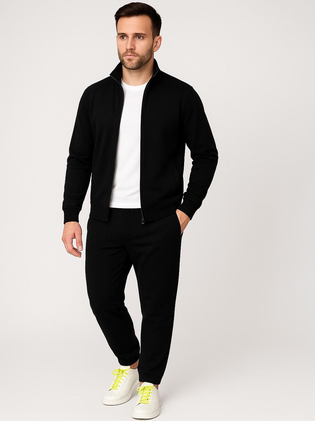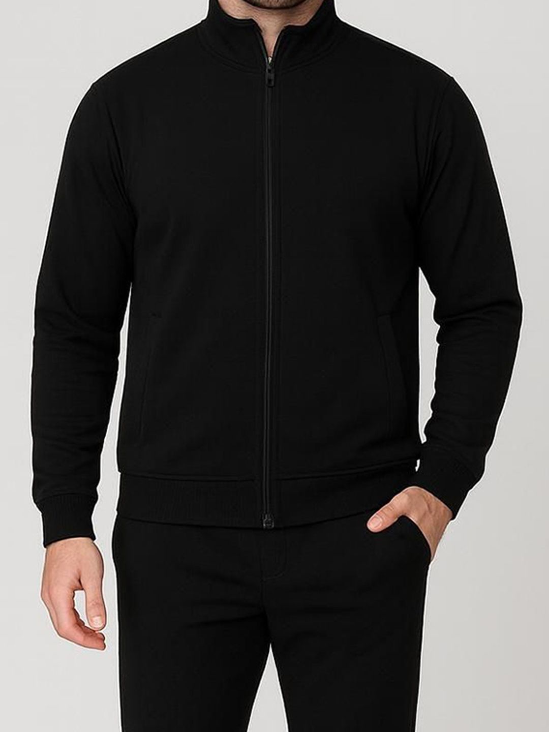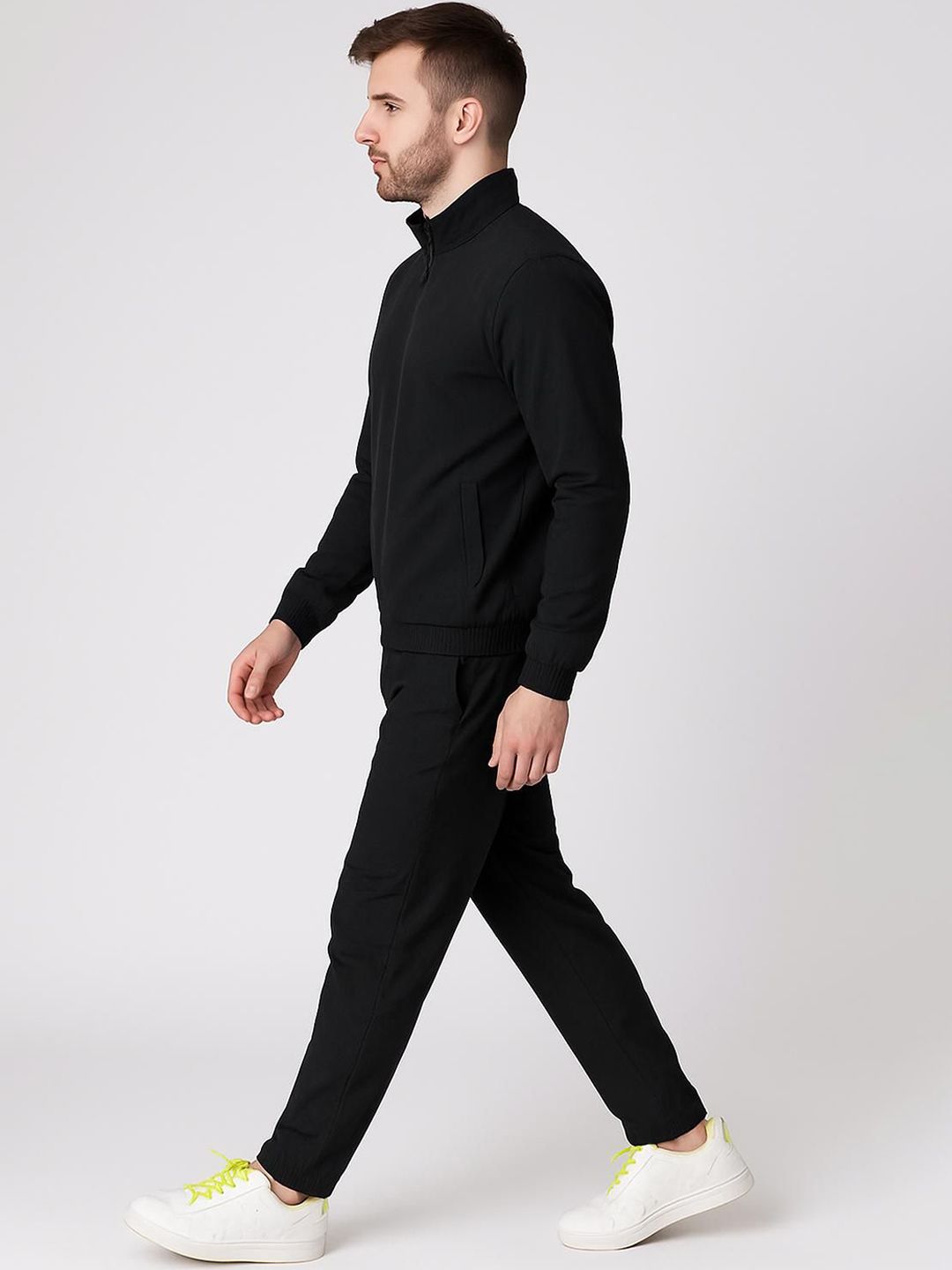 Black solid tracksuitBlack solid jacket, has a mock collar and long sleeves, secured with zip closureBlack solid mid-rise track pants, has an elasticated waistband with slip-on closure and two pockets