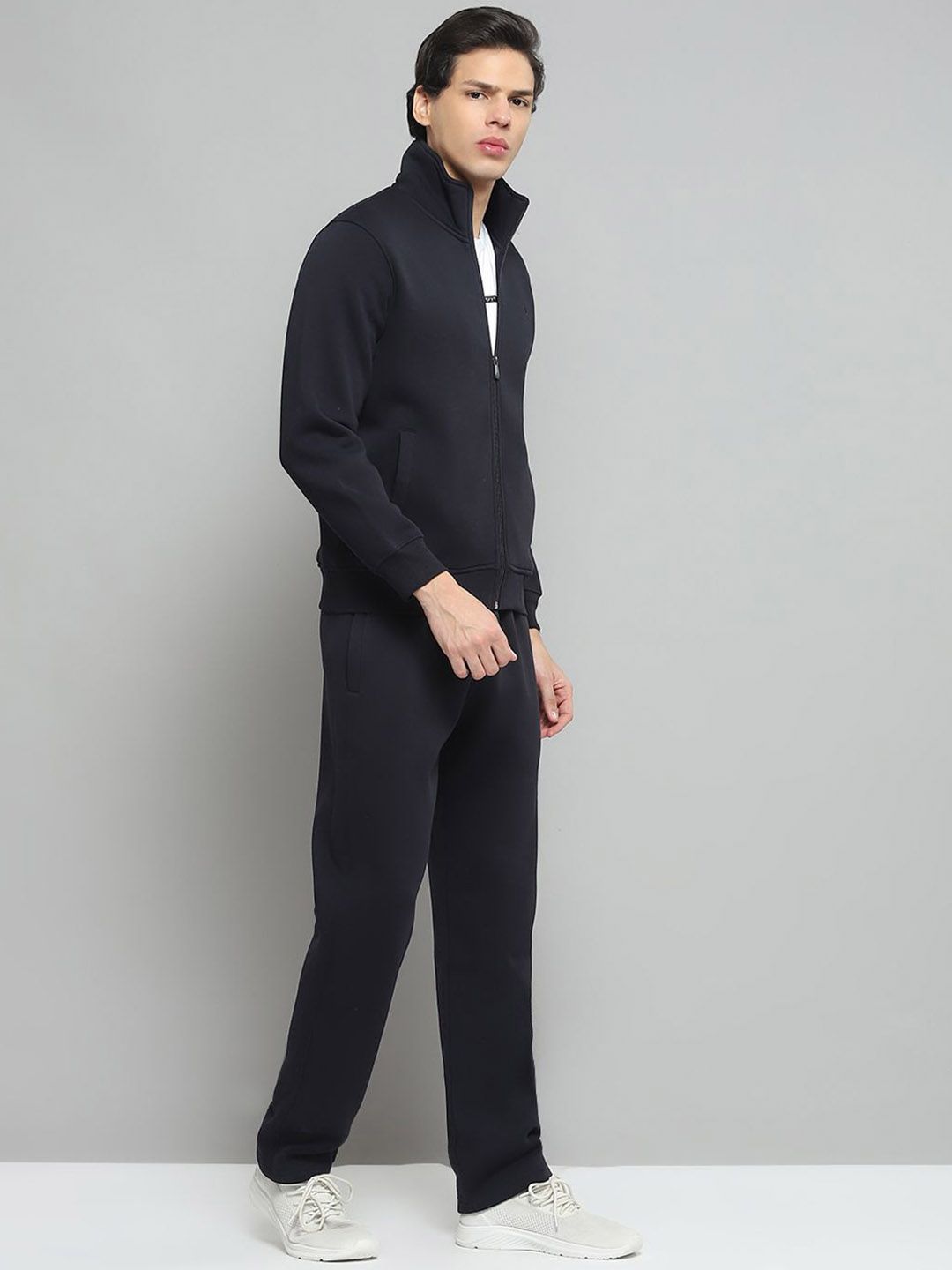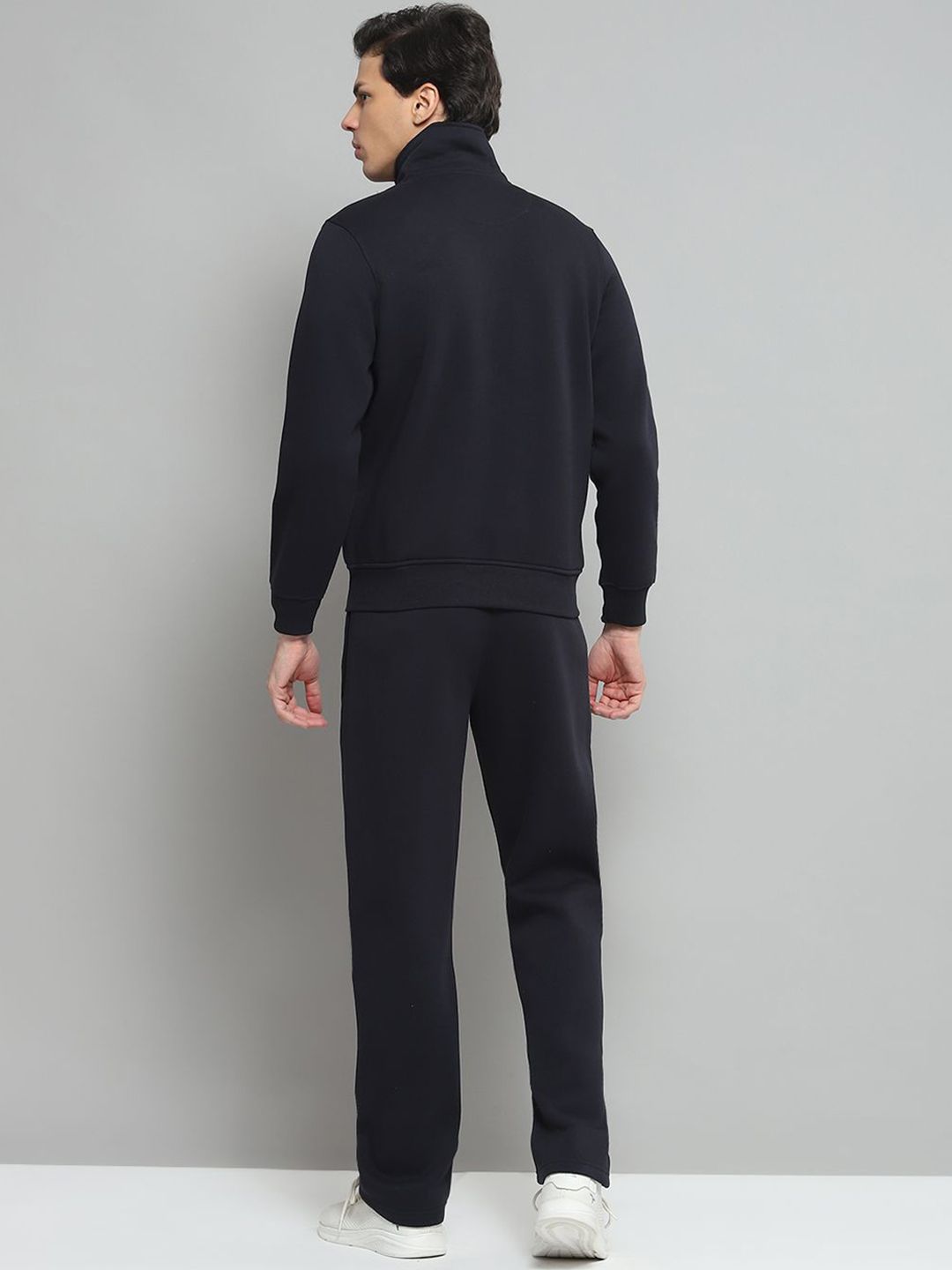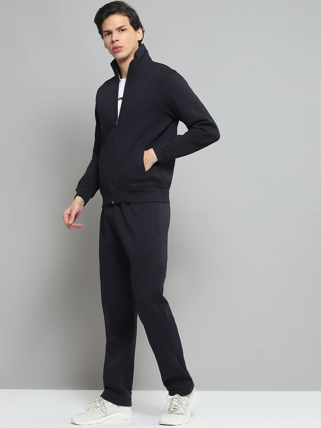 Navy Blue Solid tracksuitNavy Blue Solid Jacket, has a Mock Collar and long sleeves, two pockets with Zip ClosureNavy Blue Solid mid-rise trackpant, has an elasticated waistband with drawstring closure and two pockets