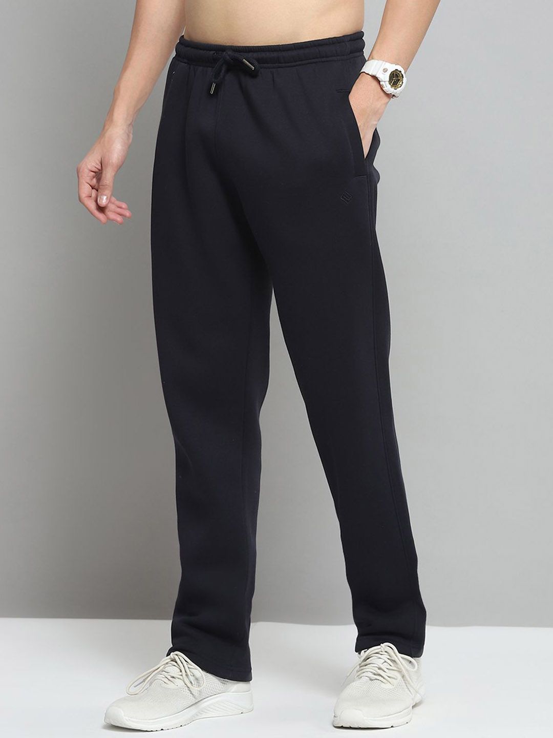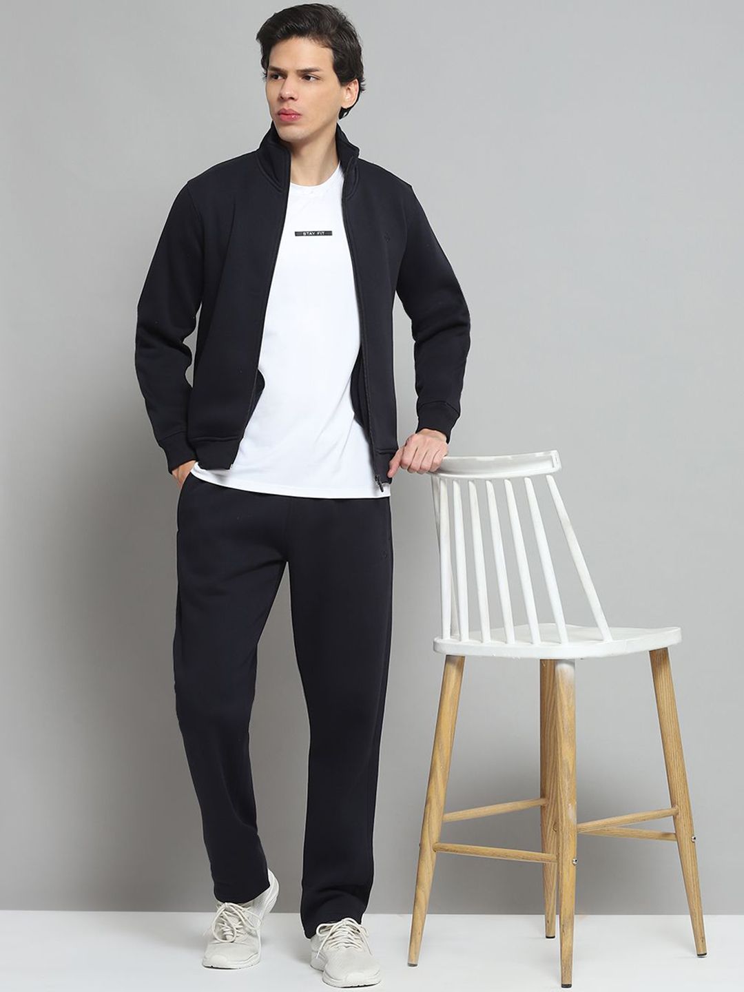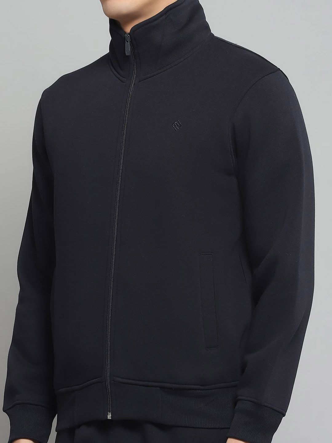 Navy Blue Solid tracksuitNavy Blue Solid Jacket, has a Mock Collar and long sleeves, two pockets with Zip ClosureNavy Blue Solid mid-rise trackpant, has an elasticated waistband with drawstring closure and two pockets