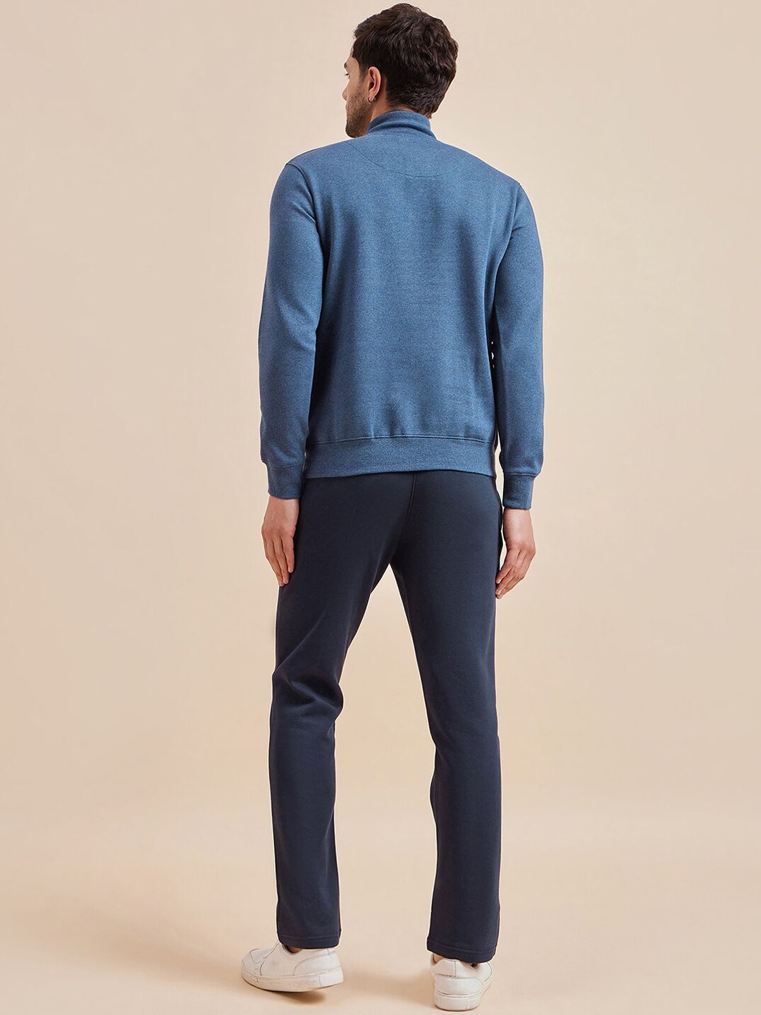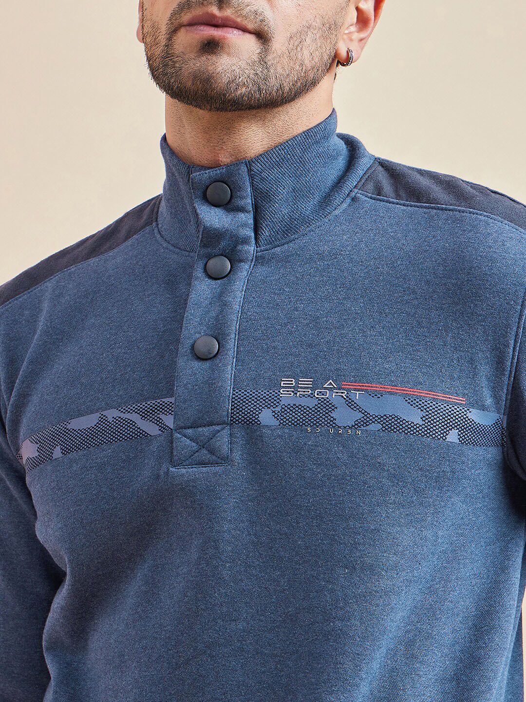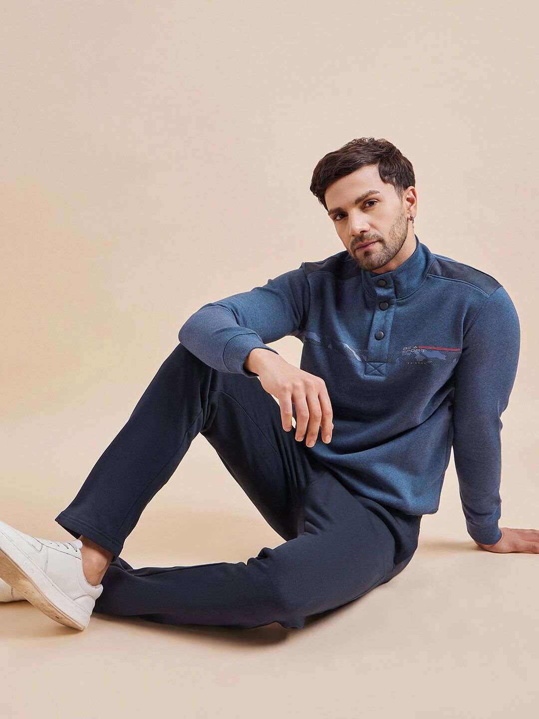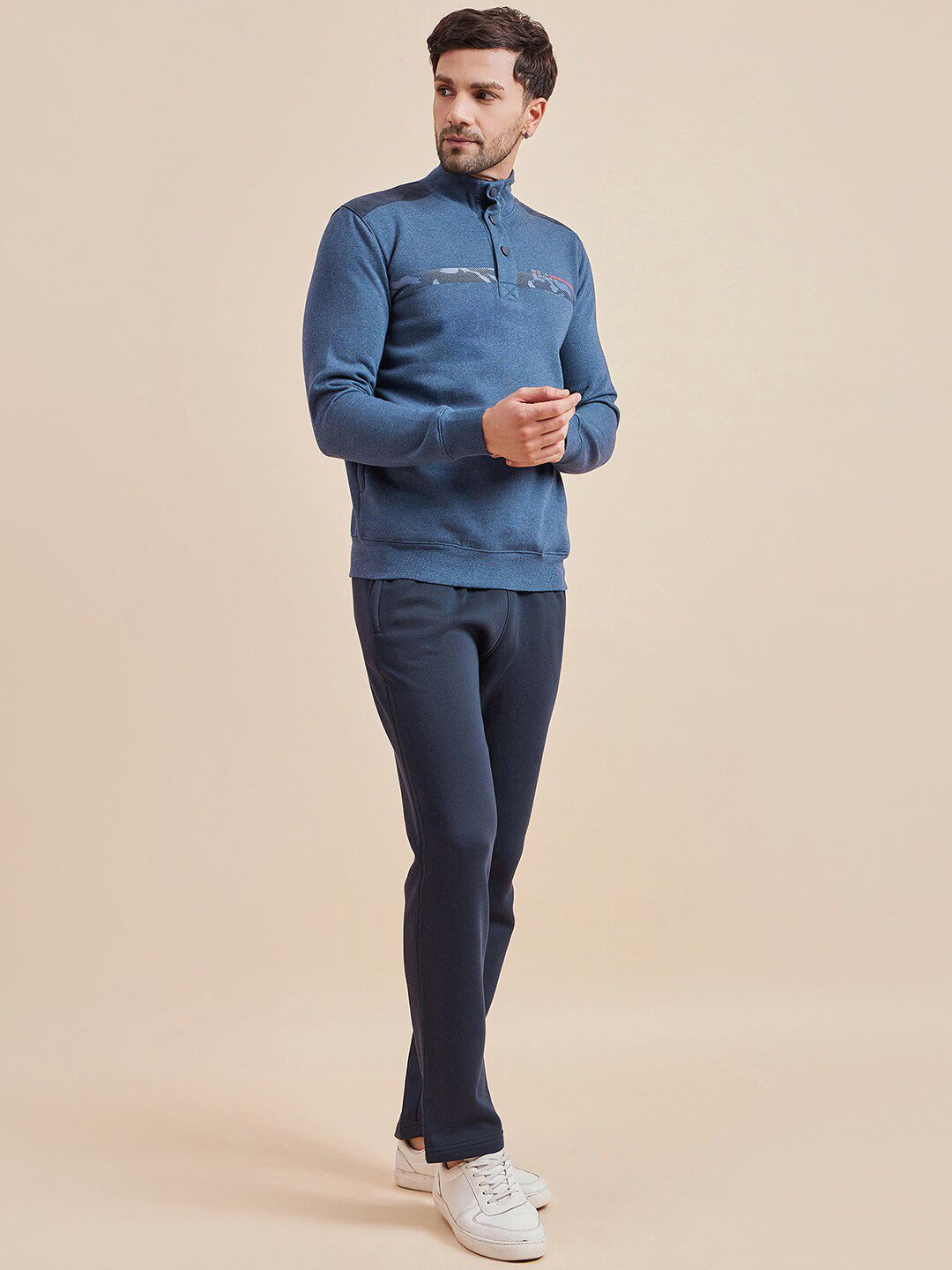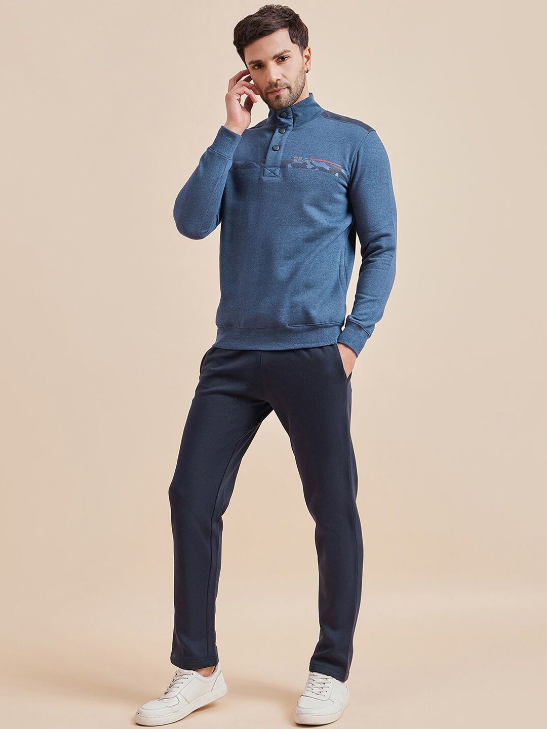 This tracksuit consists of a sweatshirt and a pair of track pantsNavy-blue, white and black printed sweatshirt, has mock-collar neckline, half-button closure, two slip pockets, long sleeves and ribbed hemsNavy-blue solid mid-rise track pants, has an elasticated waistband with drawstring closure and two pockets