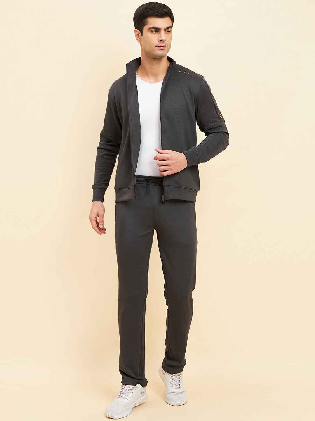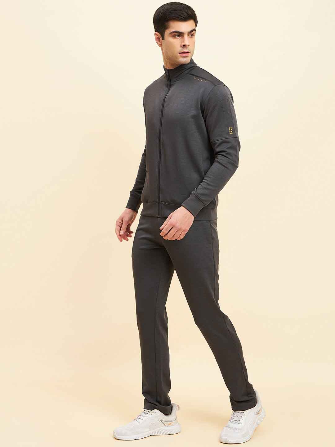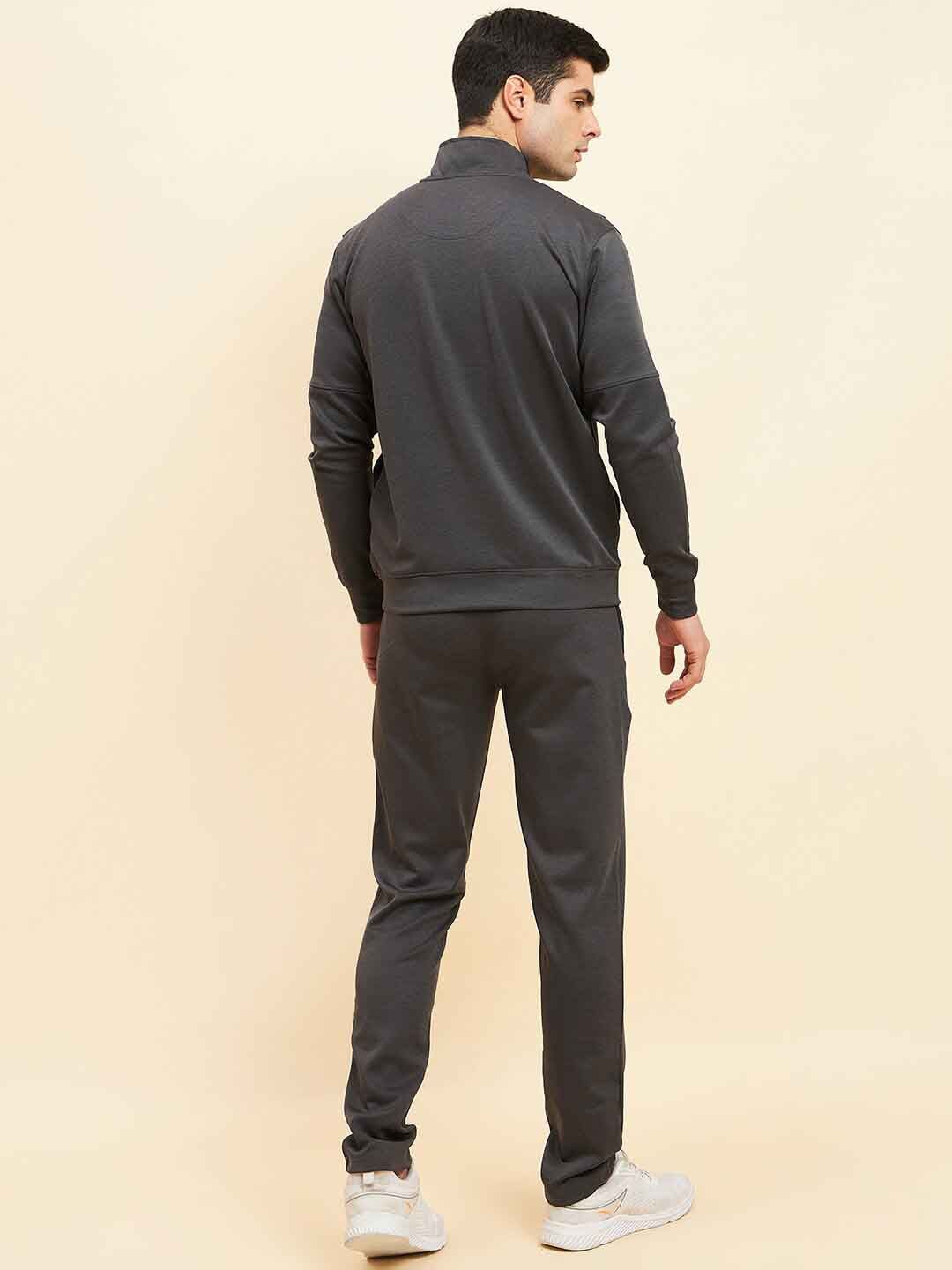 Charcoal black solid tracksuitCharcoal black solid sweat shirt has a mock collar, long sleeves and zip closureCharcoal black solid mid-rise trousers, has an elasticated waistband with drawstring closure