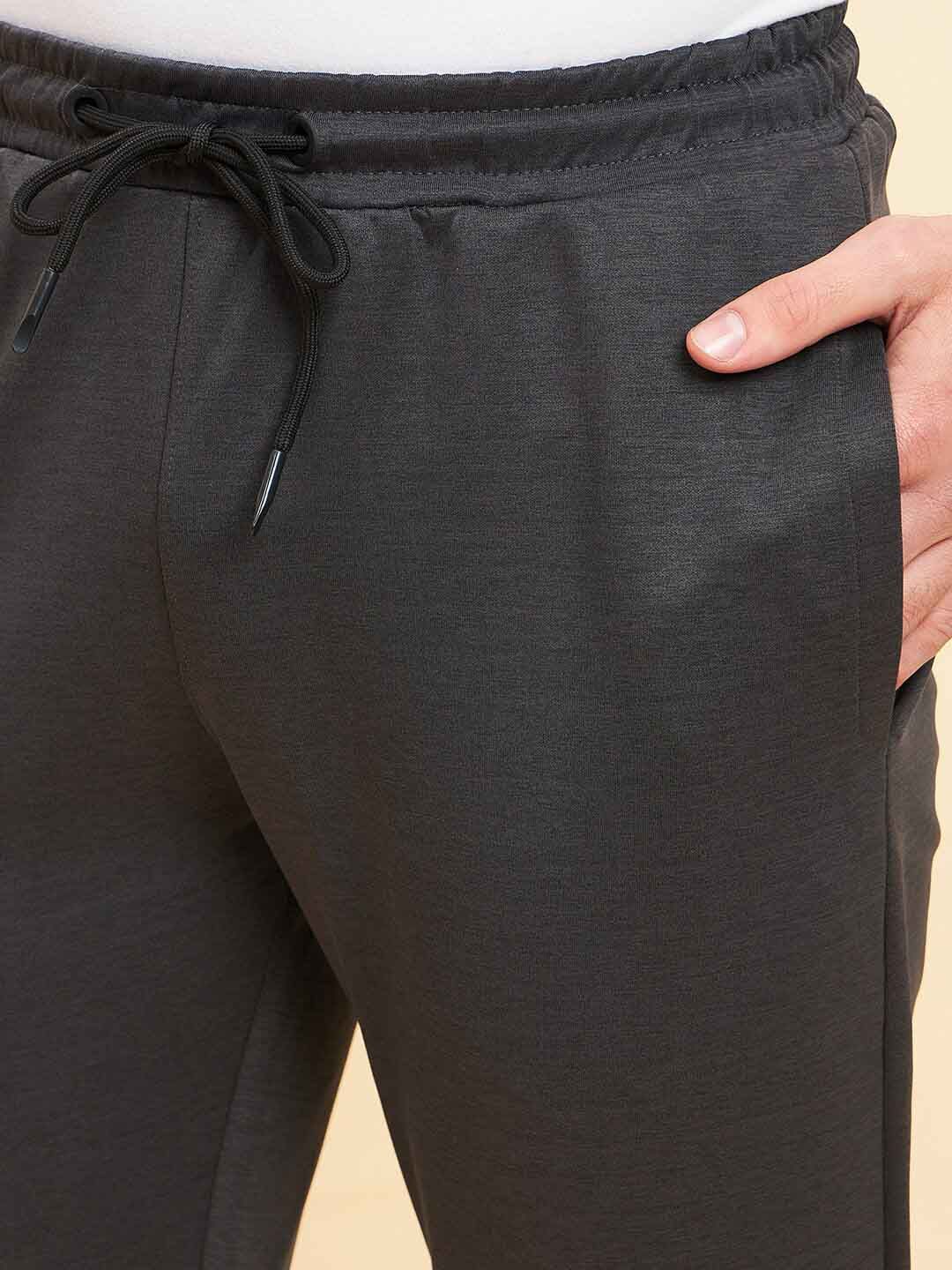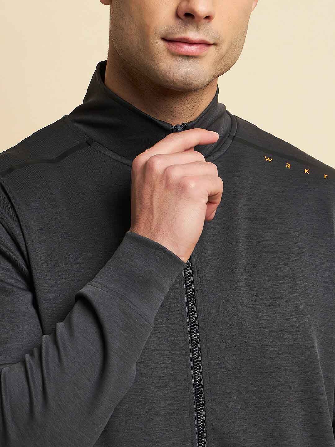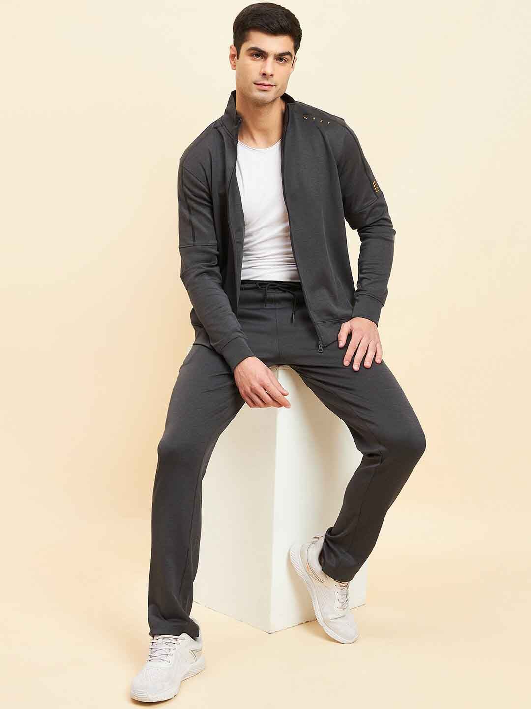 Charcoal black solid tracksuitCharcoal black solid sweat shirt has a mock collar, long sleeves and zip closureCharcoal black solid mid-rise trousers, has an elasticated waistband with drawstring closure