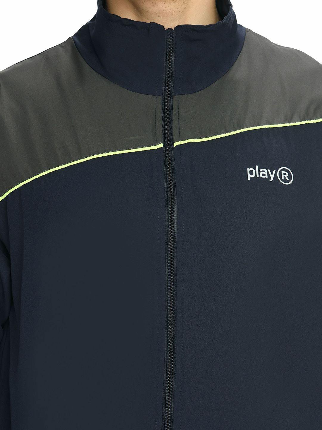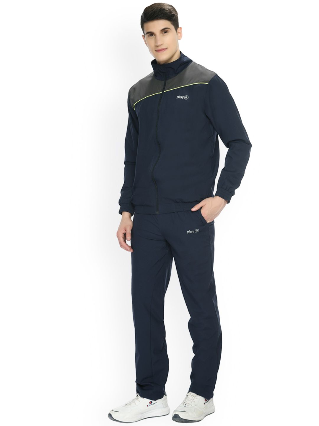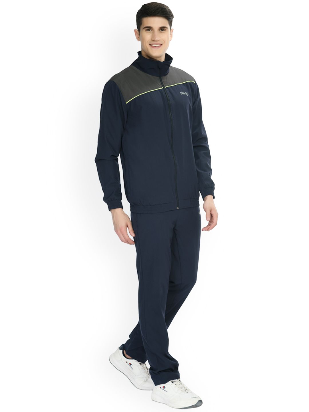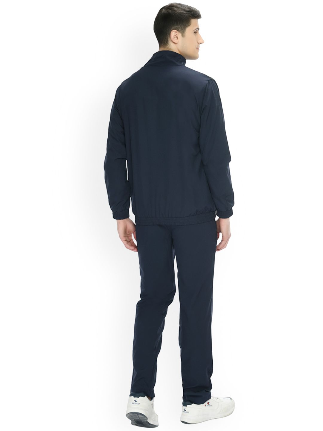 Navy blue tracksuitNavy blue jacket has monk collar, long sleeves zip closureNavy blue track pant, has an elasticated waistband, with slip-on closure