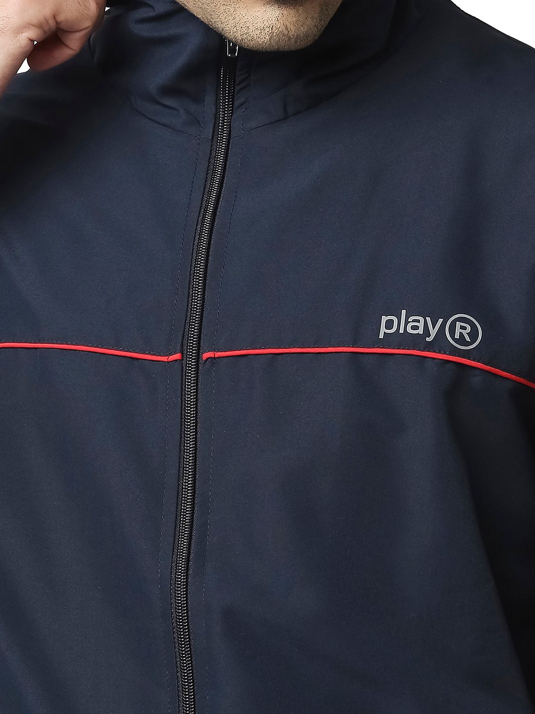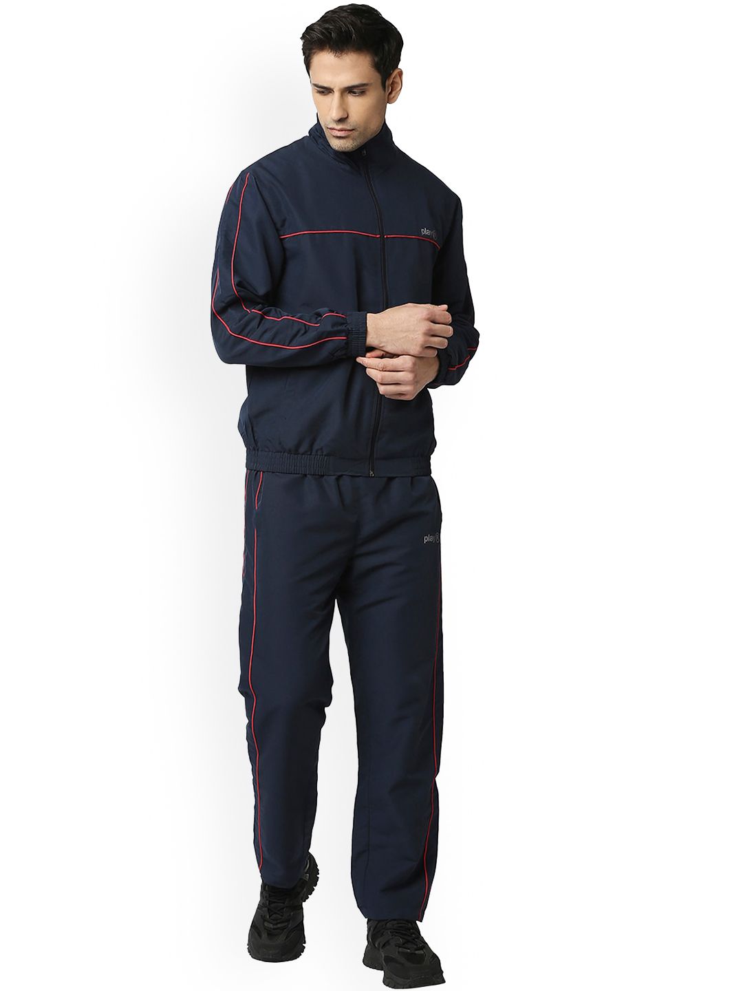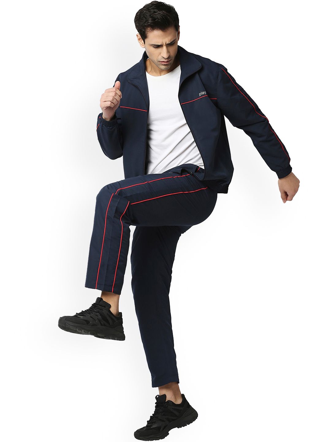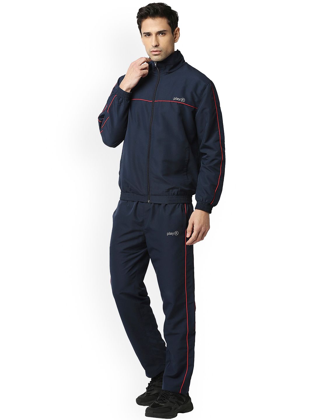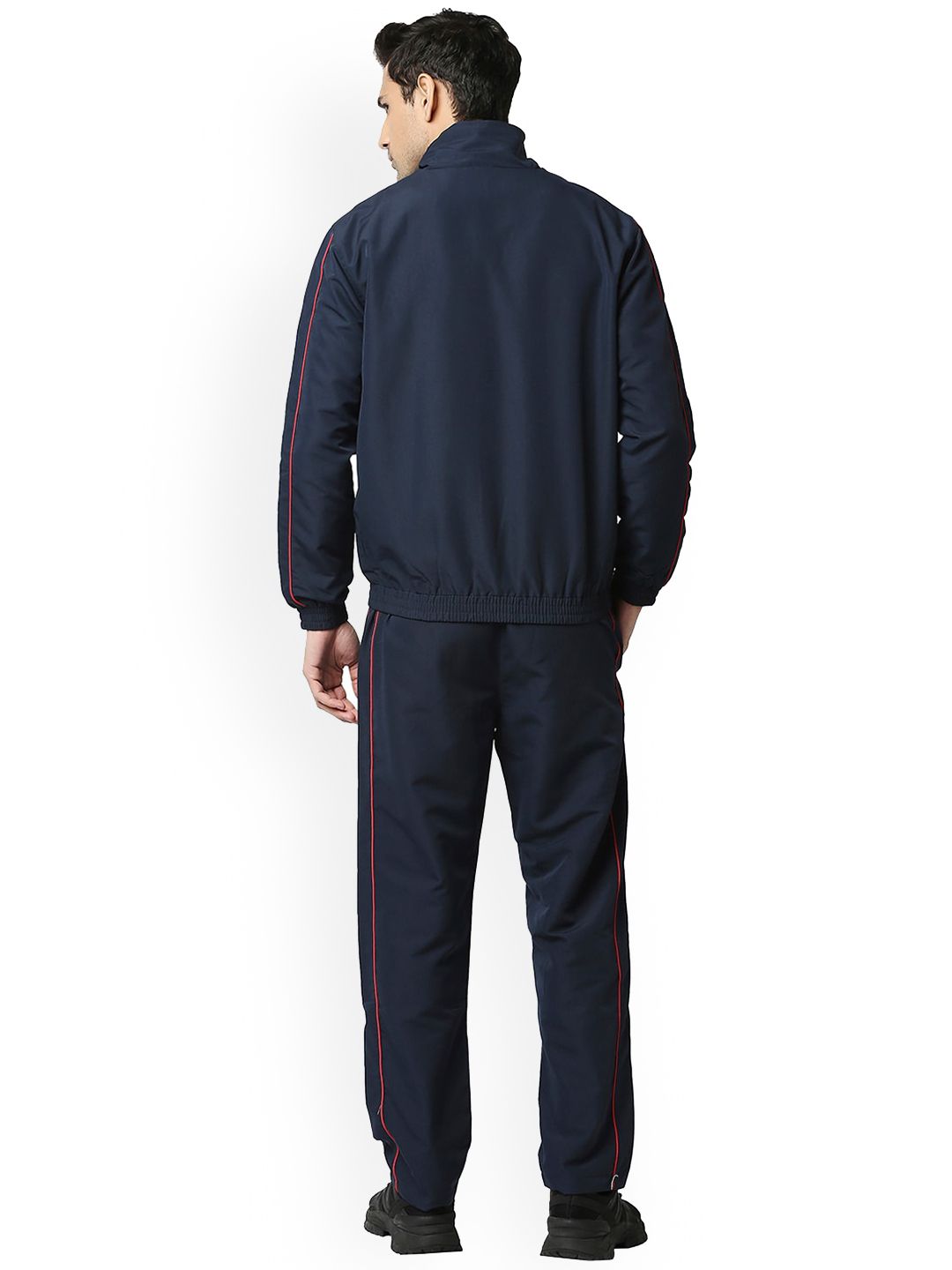 Navy blue tracksuitNavy blue jacket has monk collar, long sleeves zip closureNavy blue track pant, has an elasticated waistband, with slip-on closure