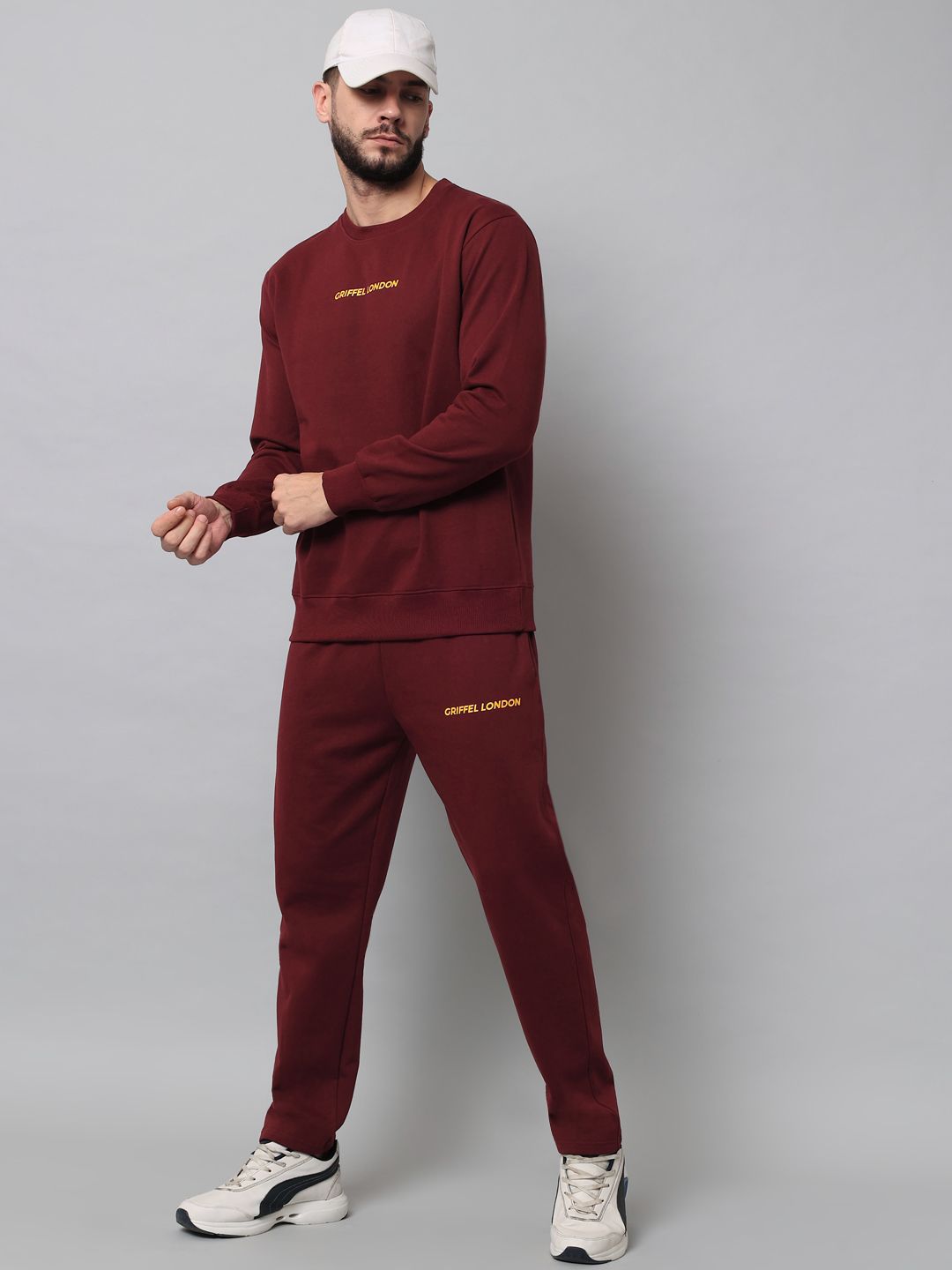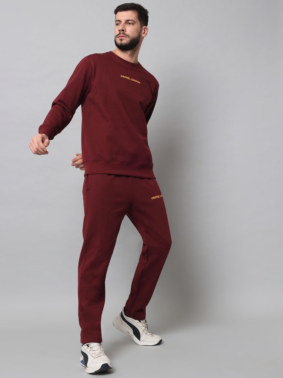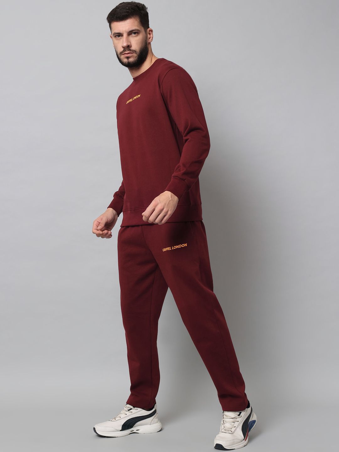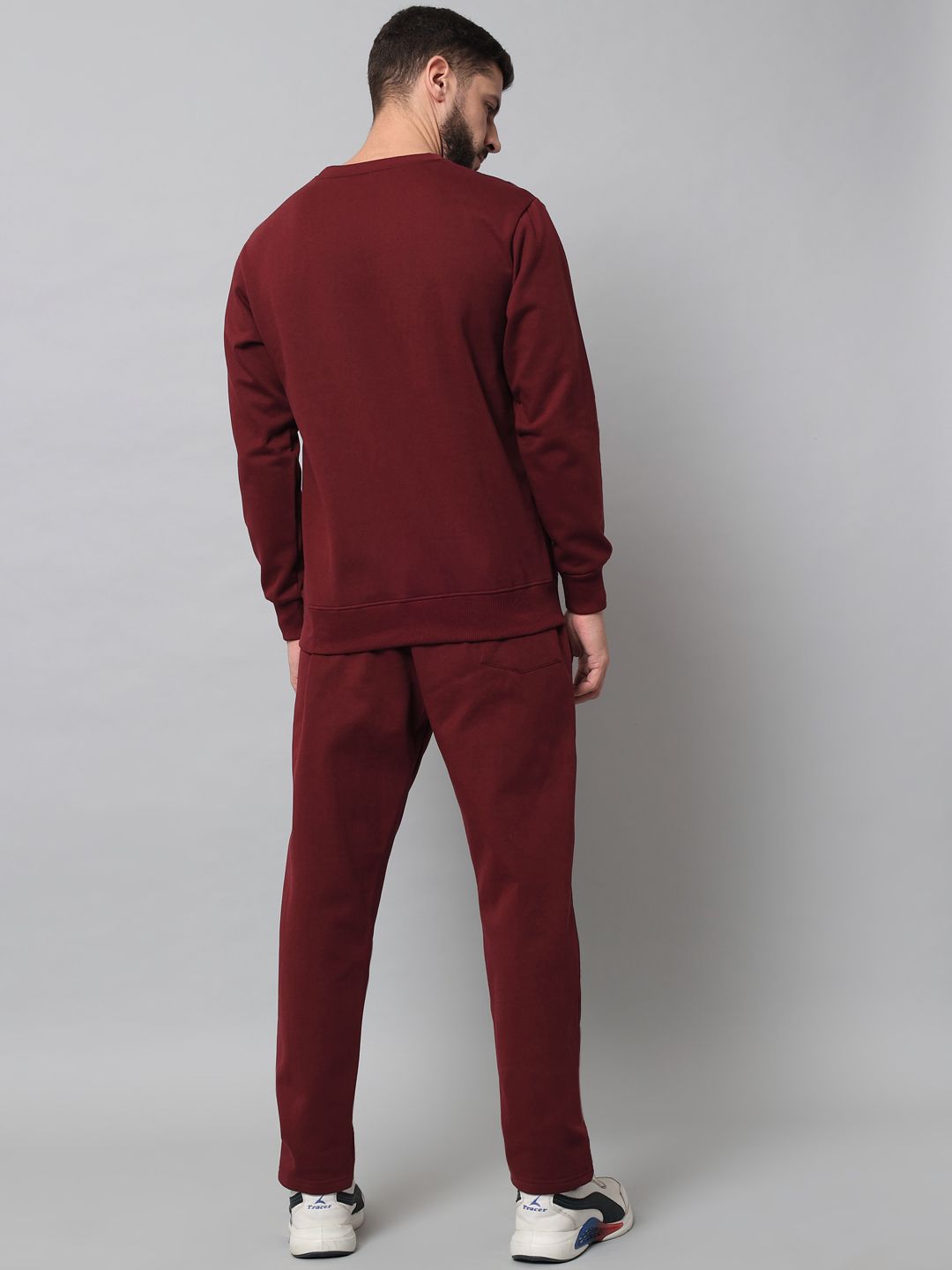 This tracksuit consists of a sweatshirt and a pair of track pantsMaroon solid sweatshirt has a round neck with slip-on closure, long sleevesMaroon solid mid-rise track pants has an elasticated waistband with drawstring closure, and two pockets