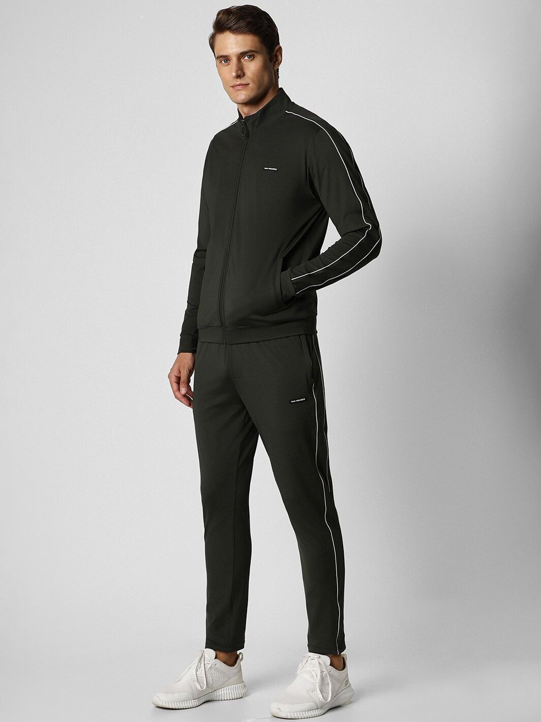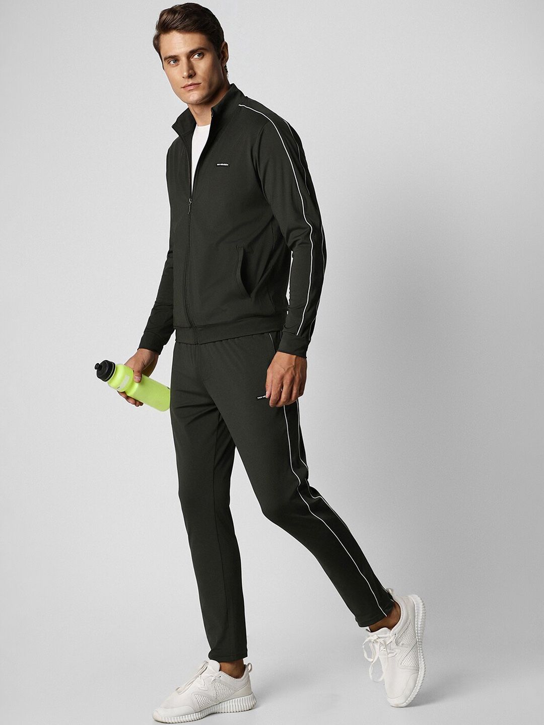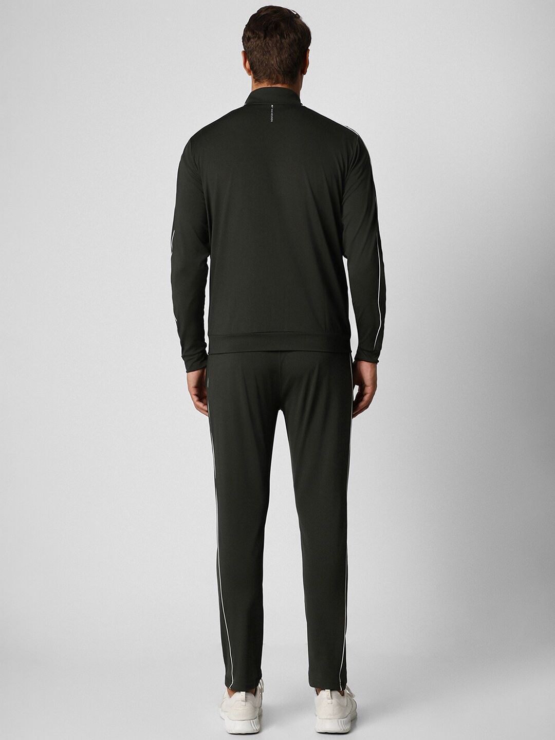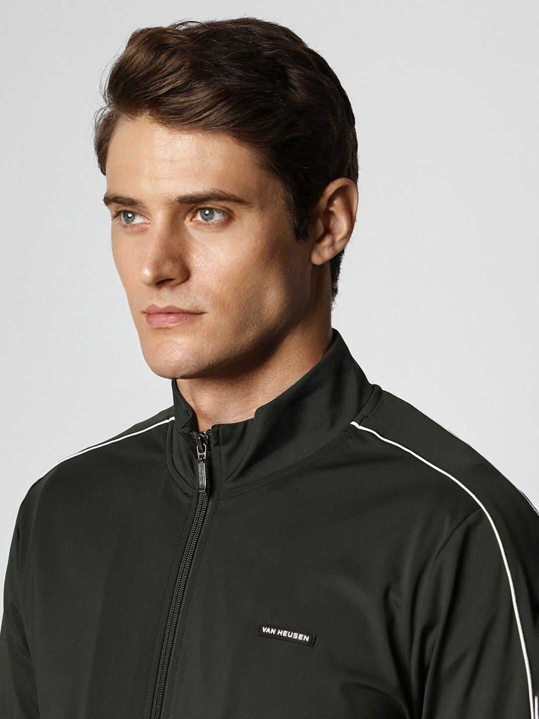 Grey solid tracksuitGrey solid sports jacket has a mock collar, long sleeves and zip closureGrey solid mid-rise track pants, has an elasticated waistband with slip on closure