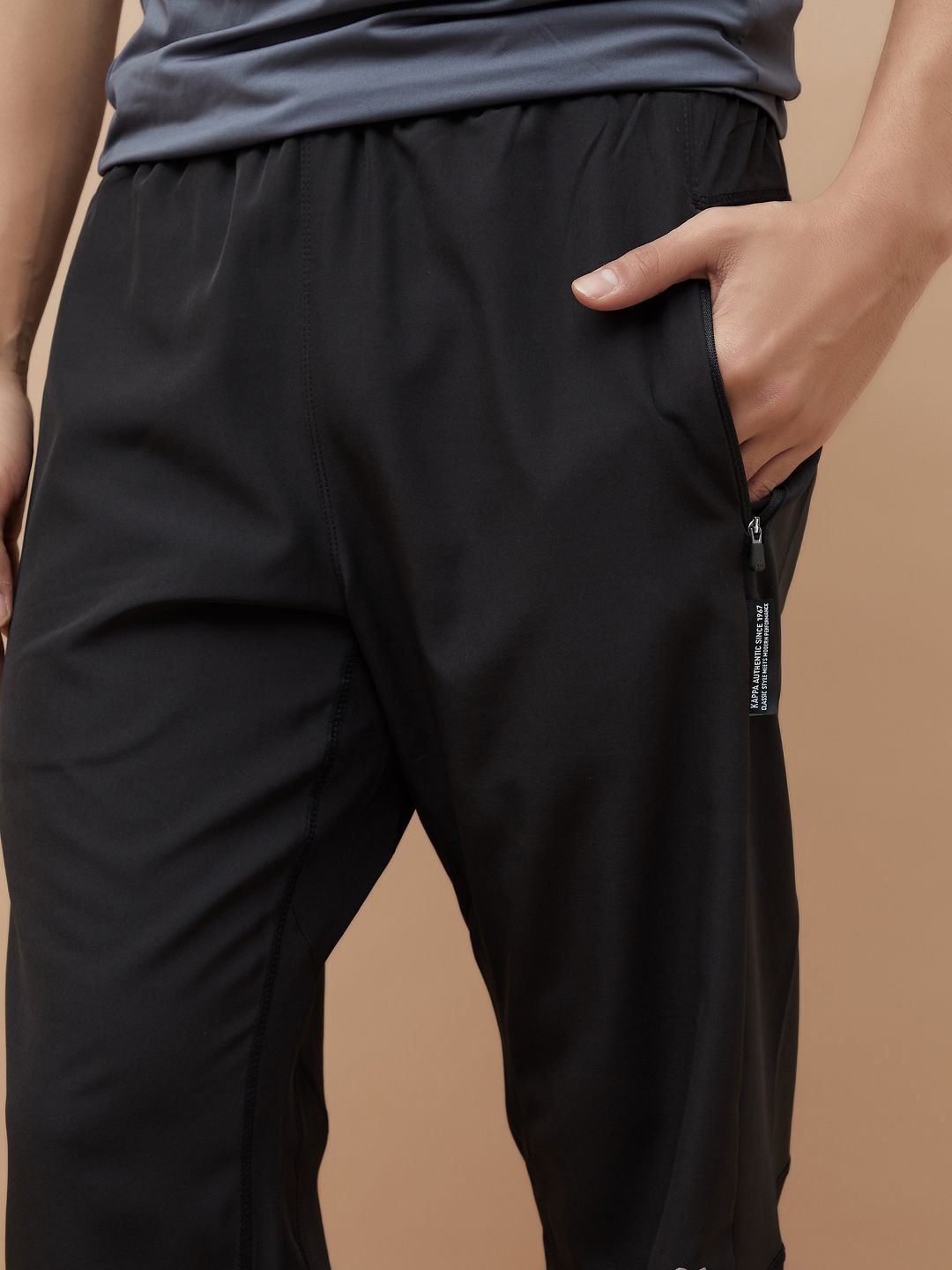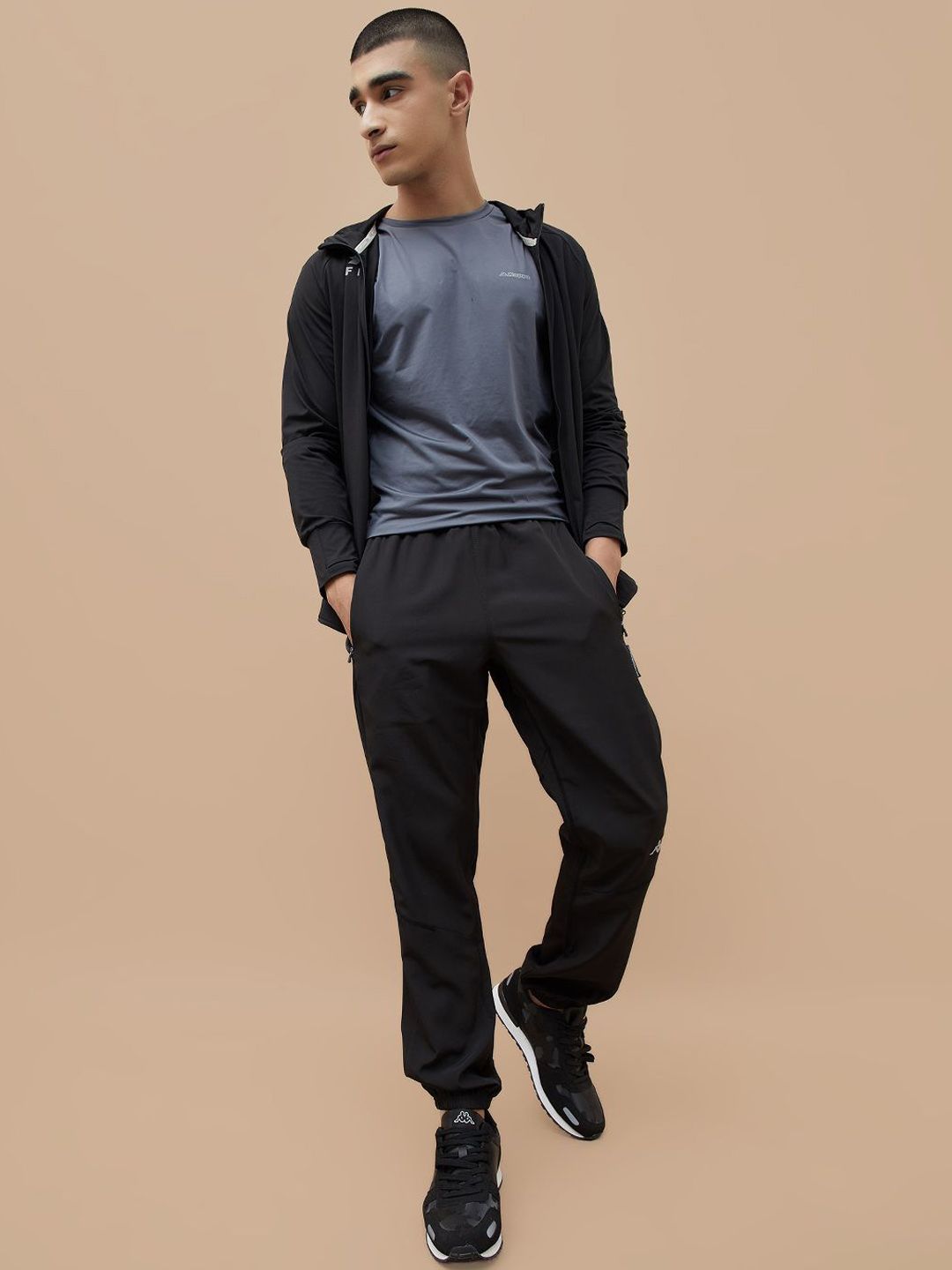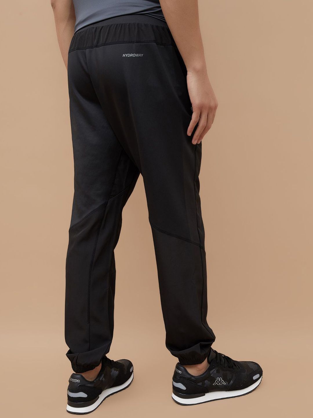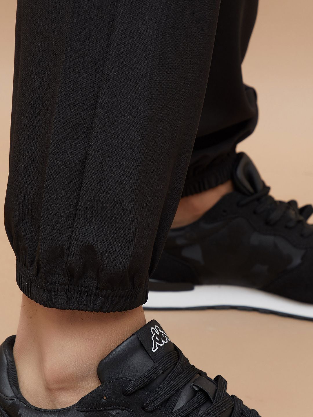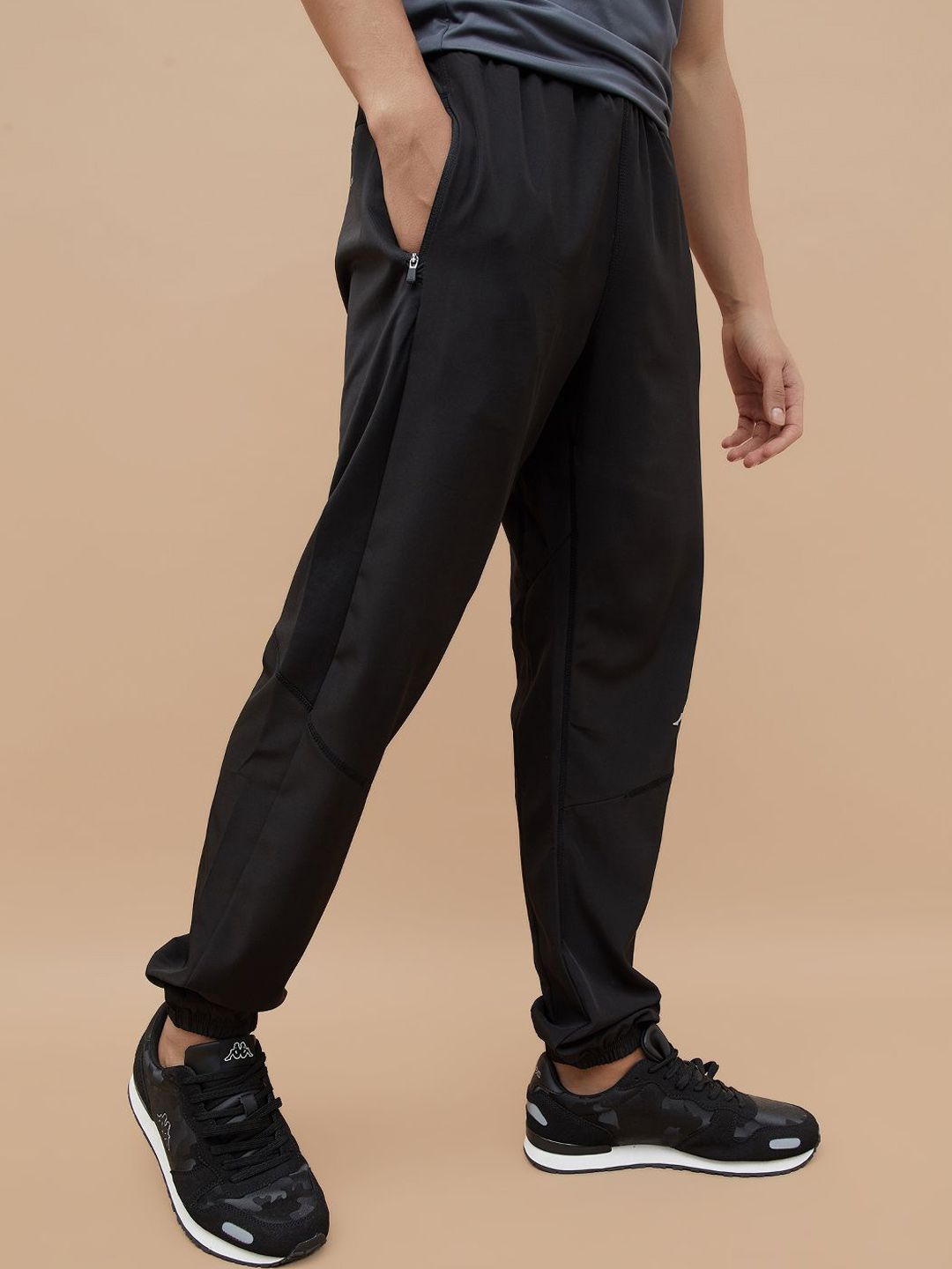 Black solid regular-fit mid-rise joggers, has an elasticated waistband with drawstring closure, two pockets and cuffed hemsFeatures:Breathable