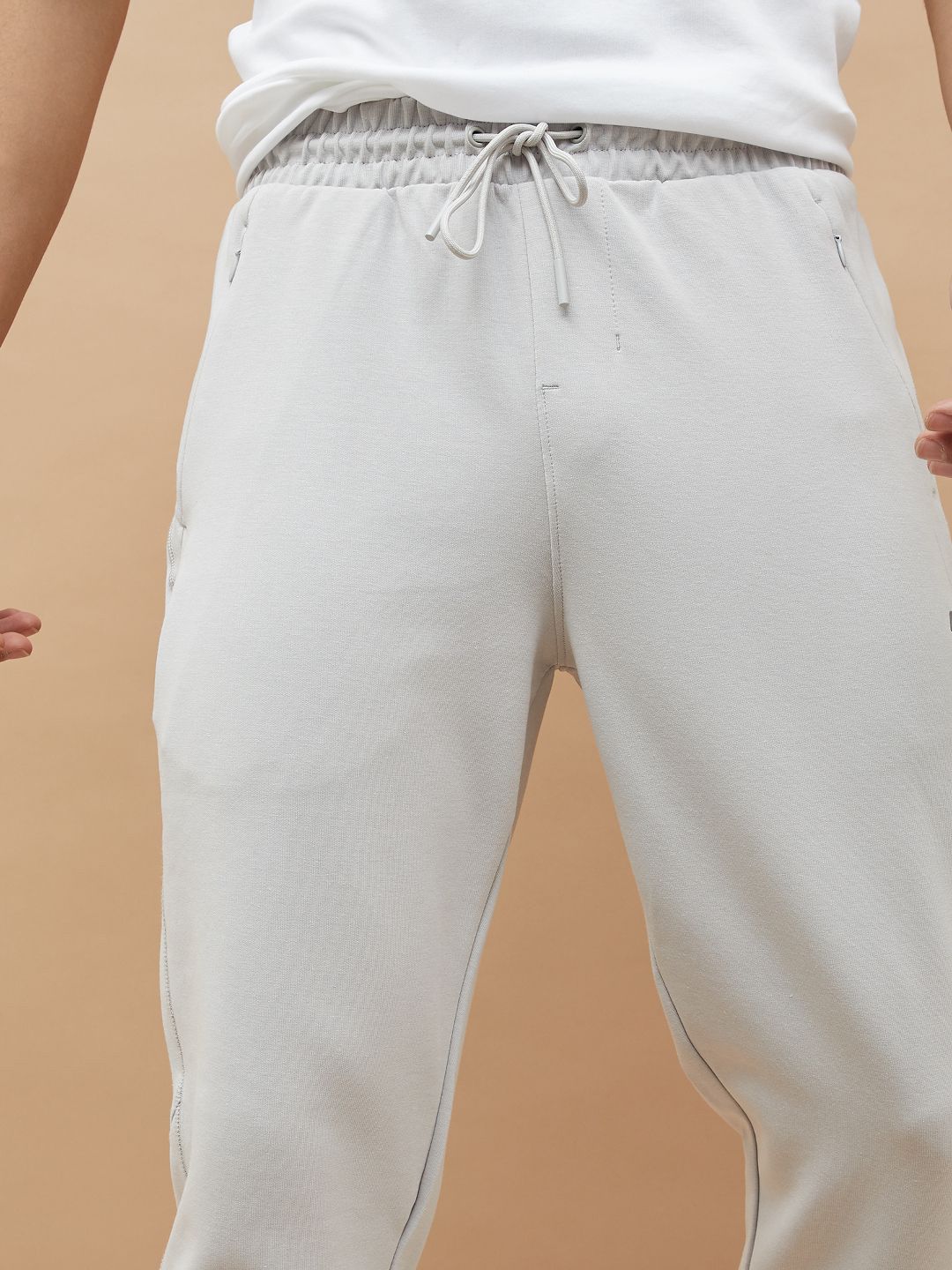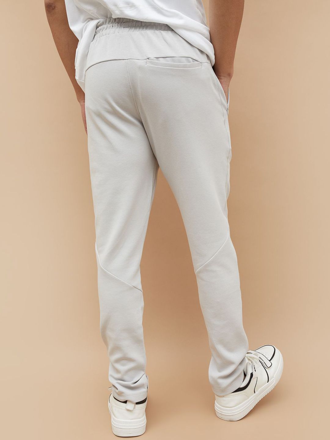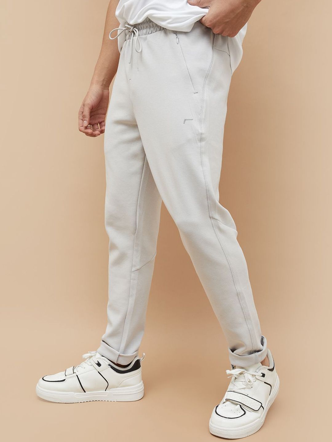 Grey solid slim fit track pants, has an inner elasticated waistband with drawstring closure and three pockets