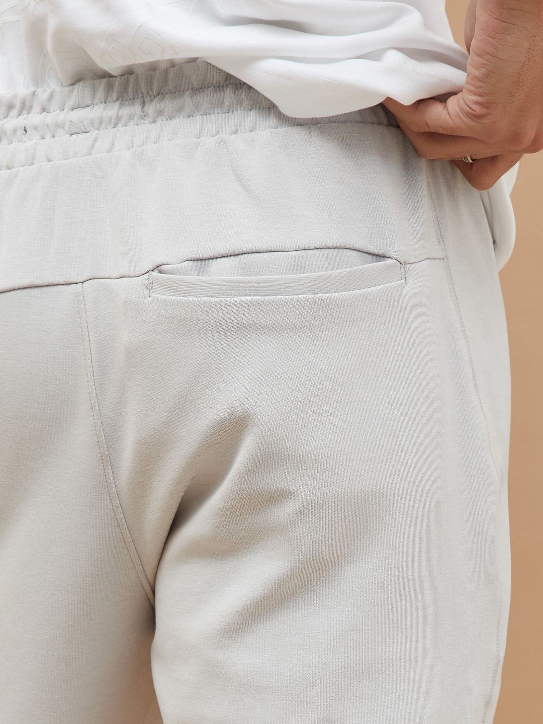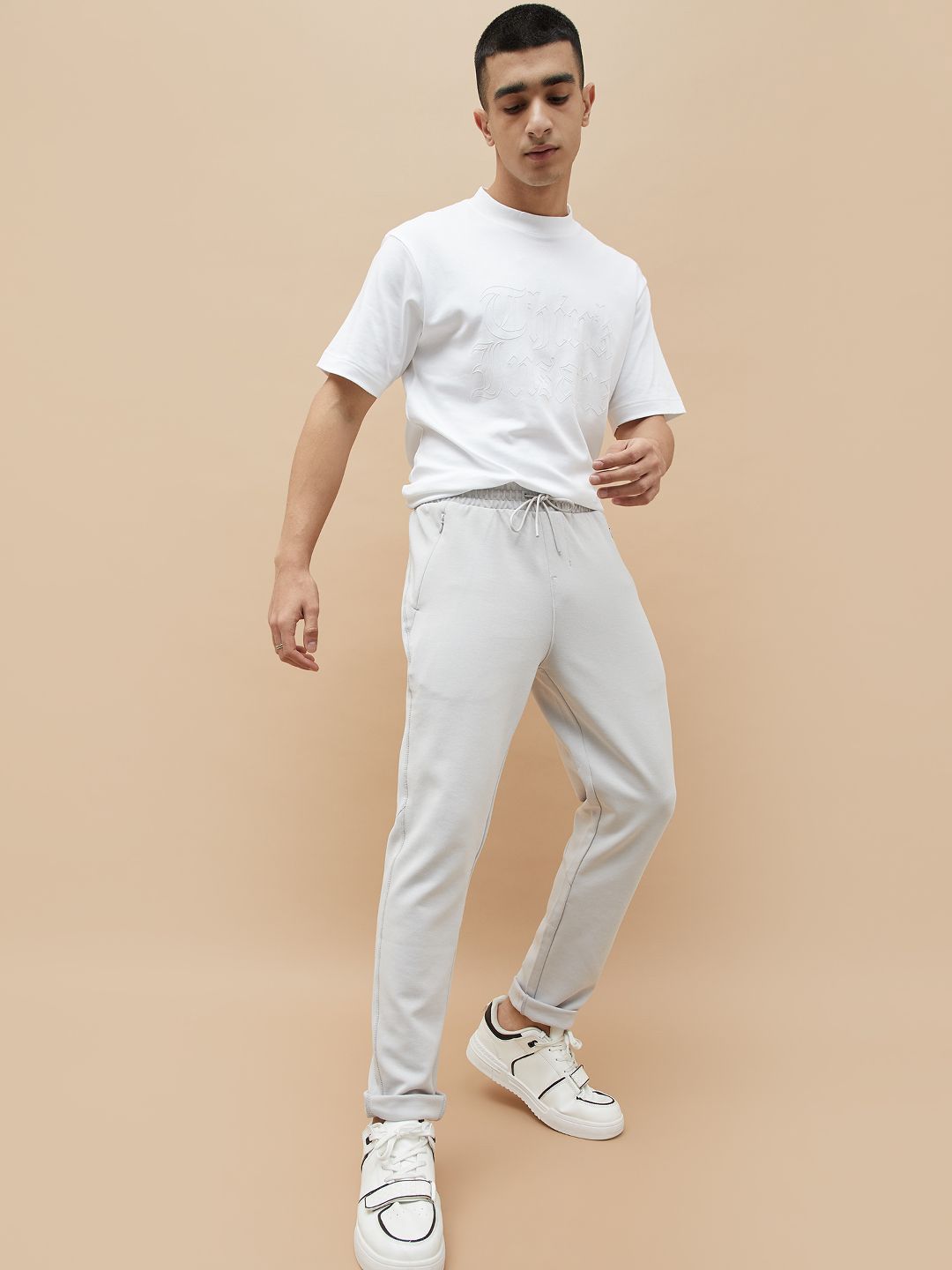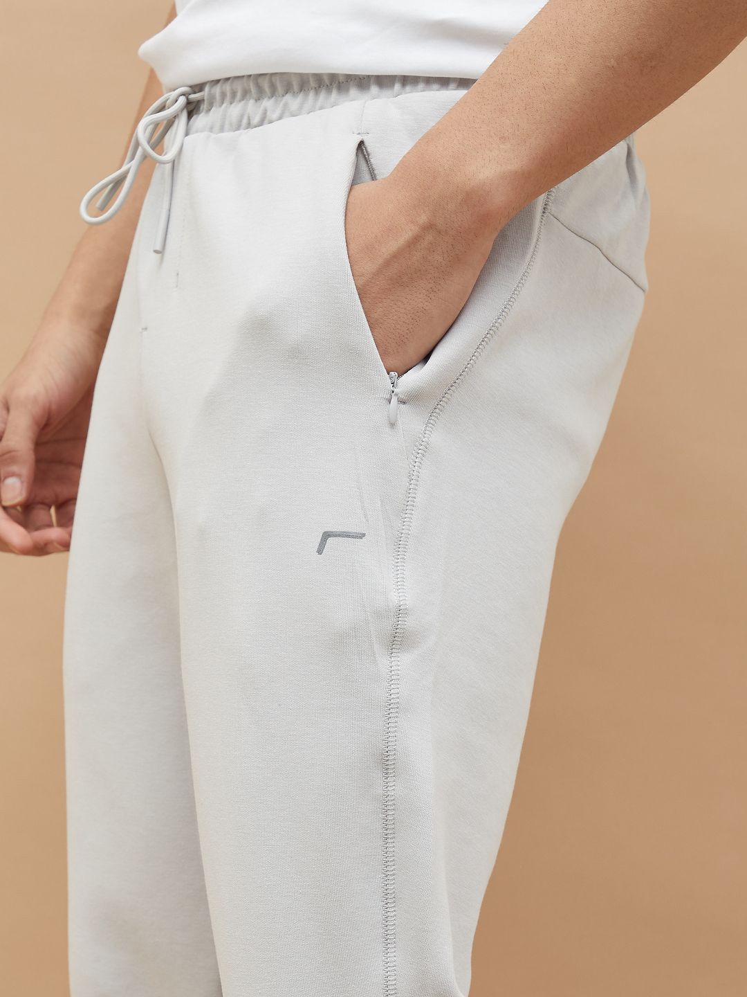 Grey solid slim fit track pants, has an inner elasticated waistband with drawstring closure and three pockets