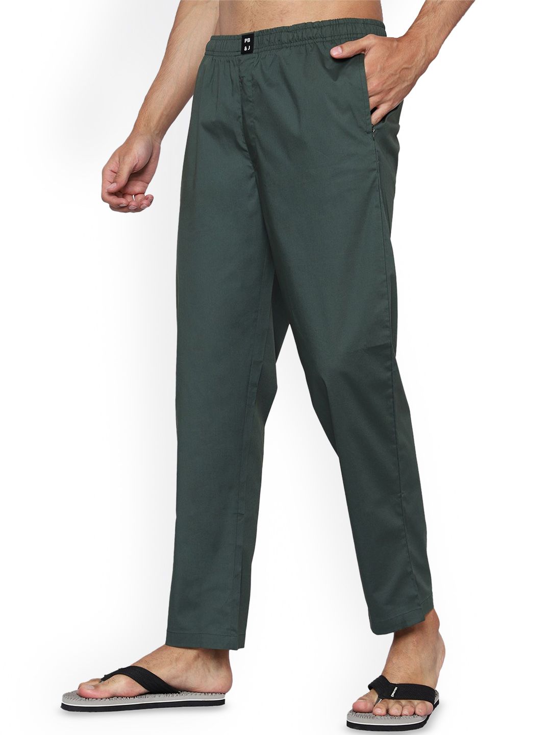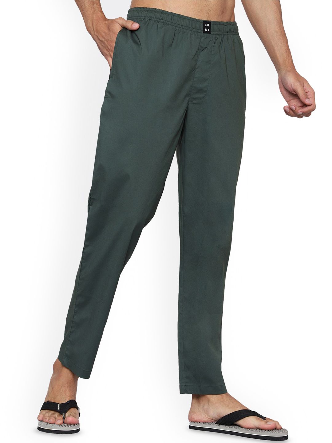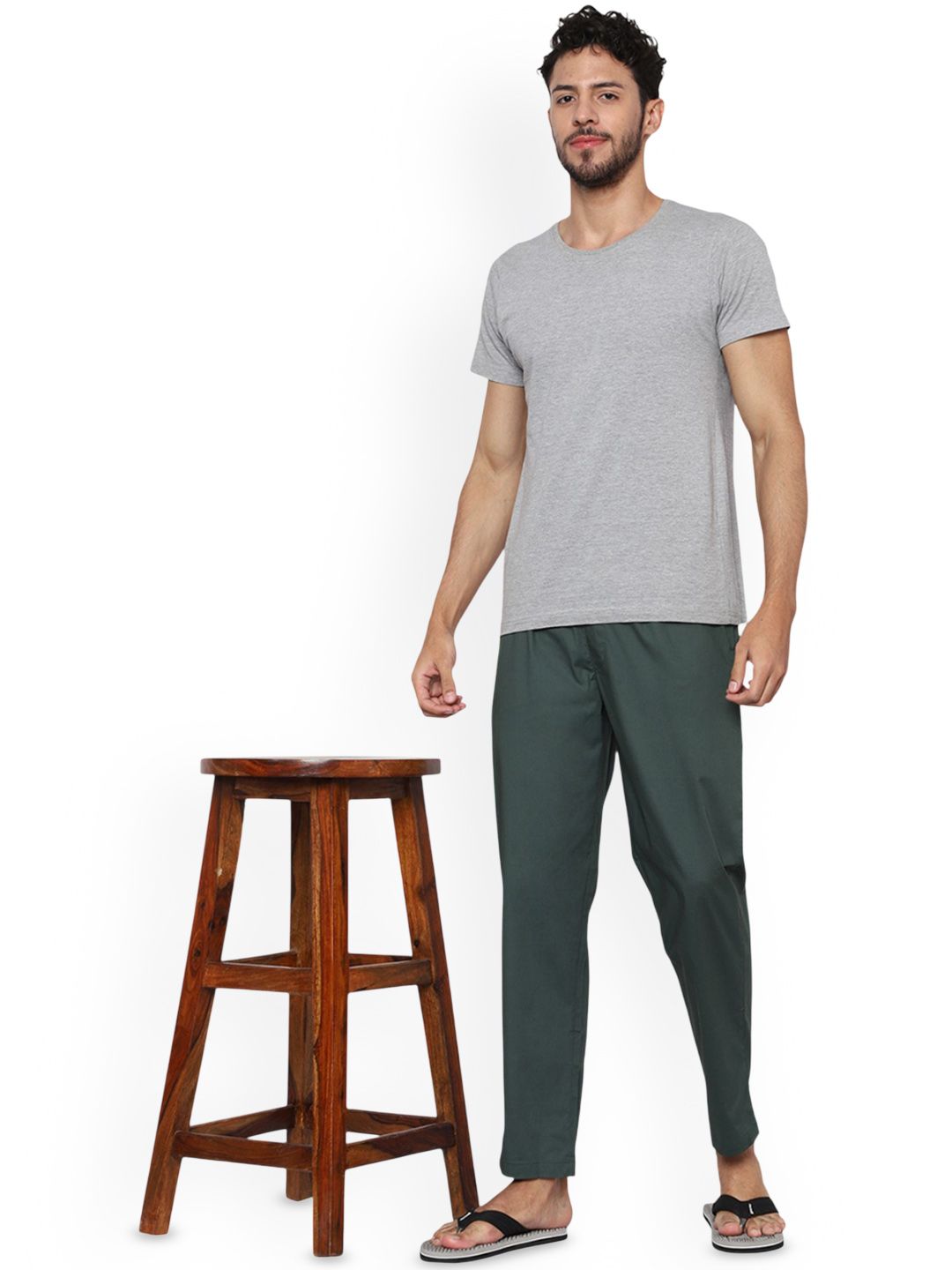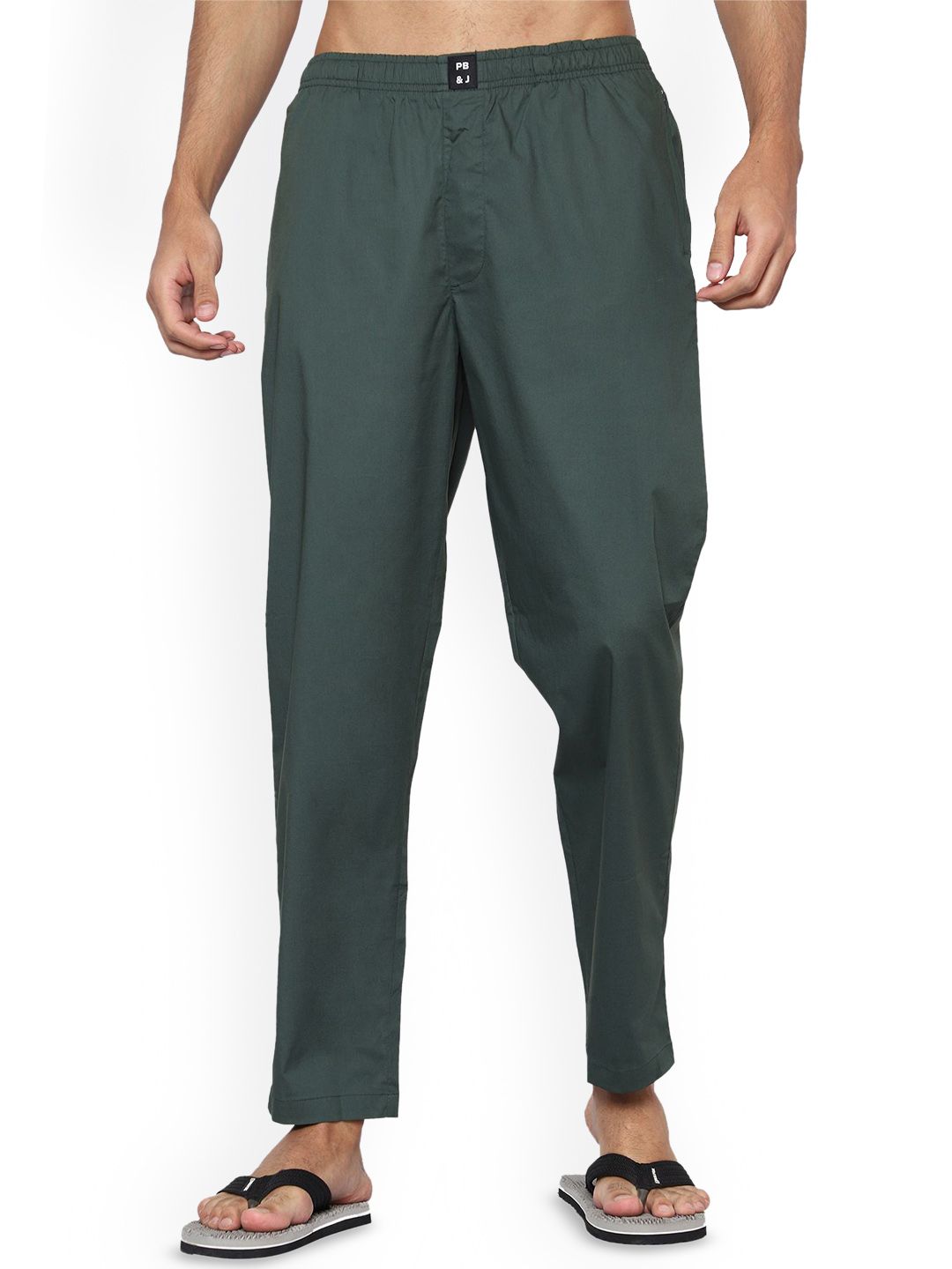 Green solid mid-rise lounge pants has an inner elasticated waistband with slip-on closure, and 2 side pockets