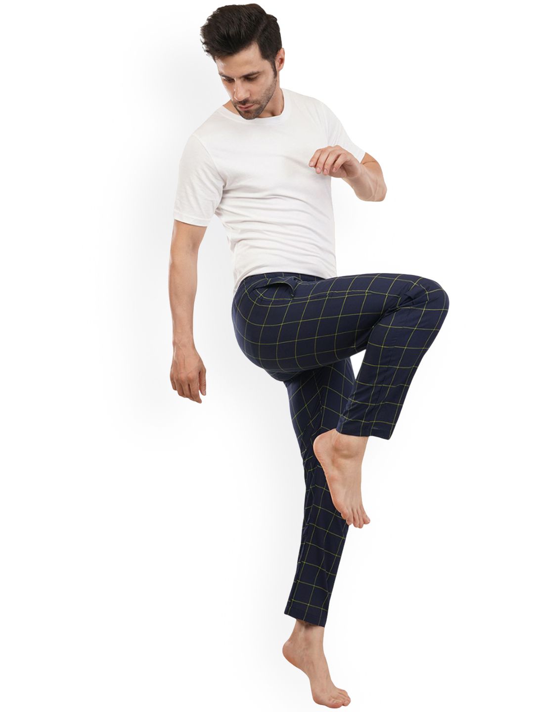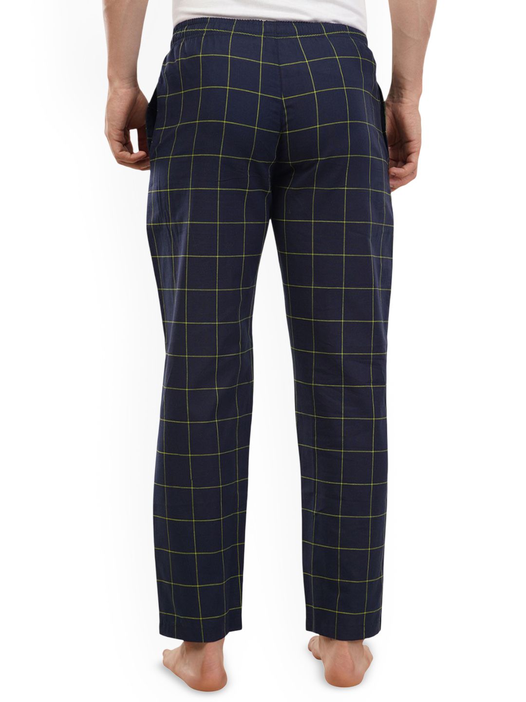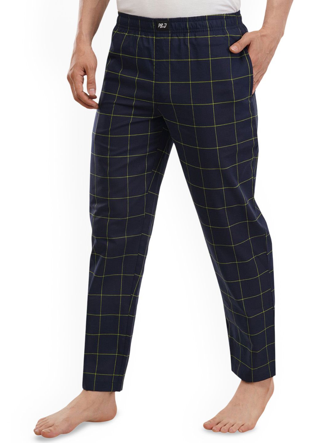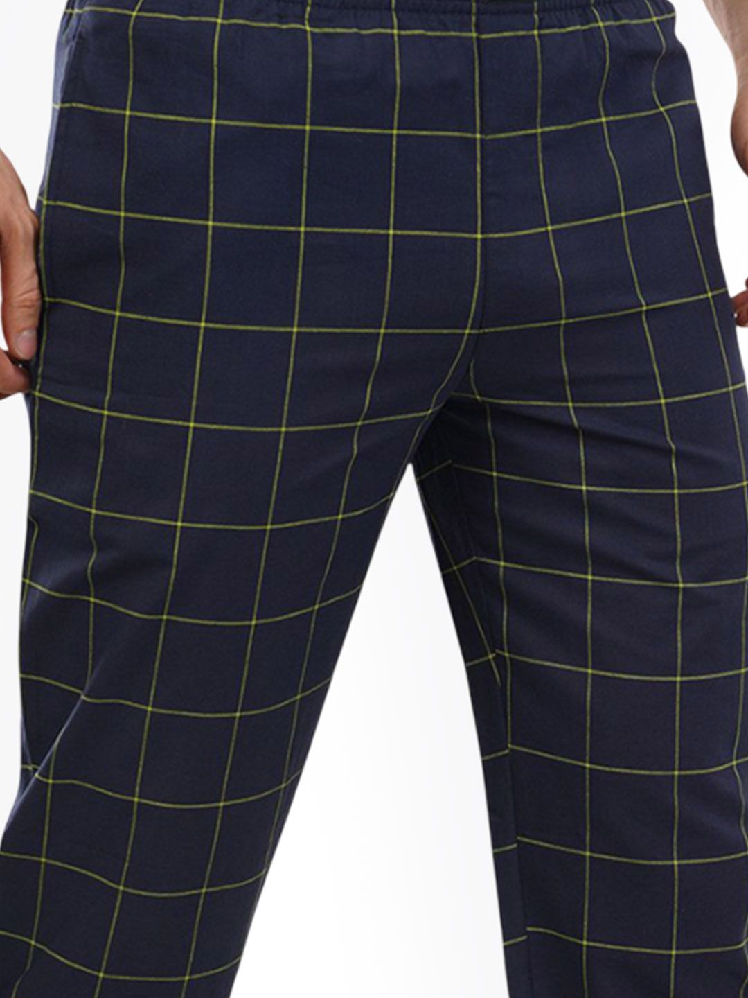 Blue checked mid-rise lounge pants has an inner elasticated waistband with slip-on closure, and 2 side pockets