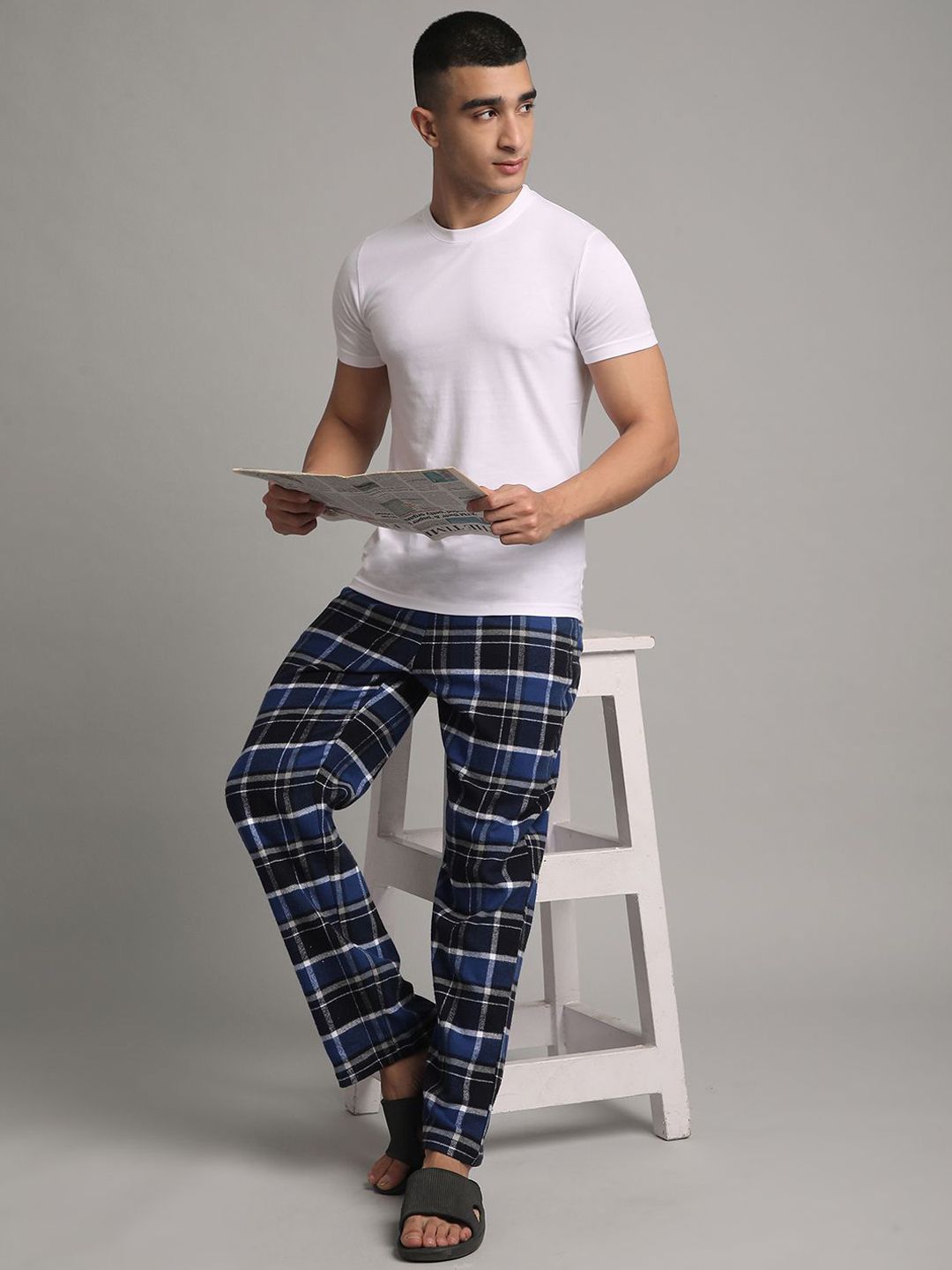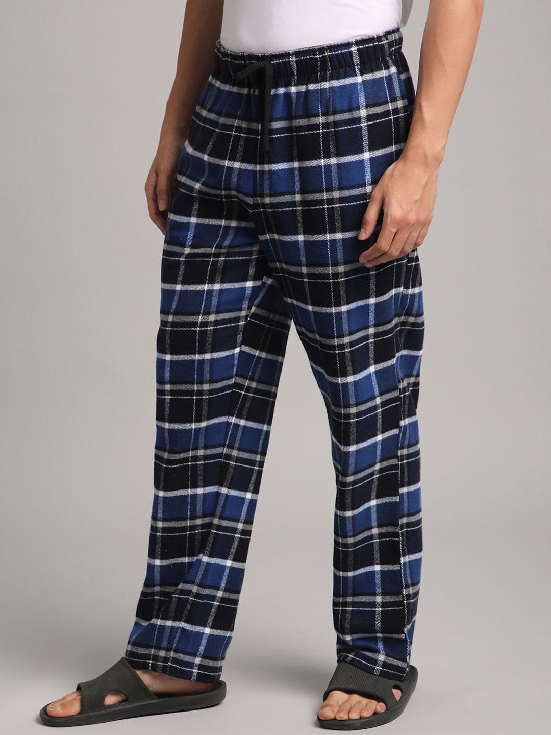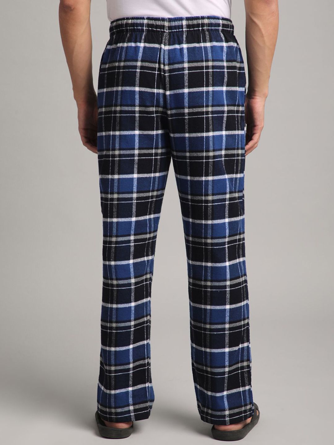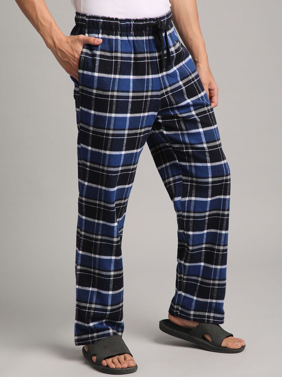 Blue checked lounge pants, has an inner elasticated waistband with drawstring closure and two pockets