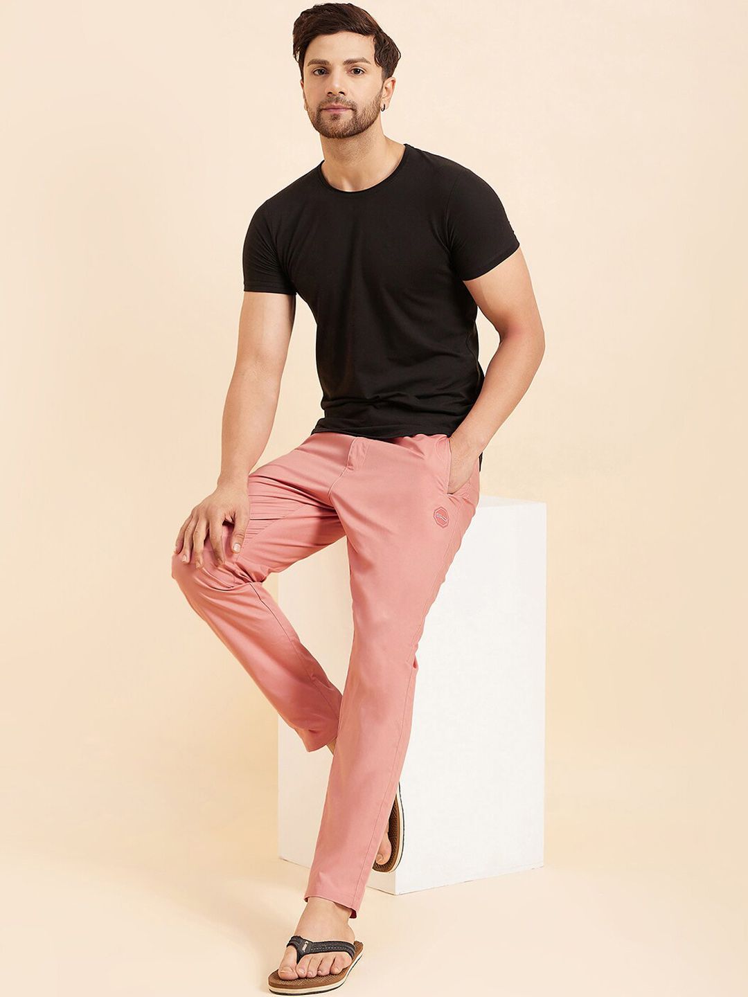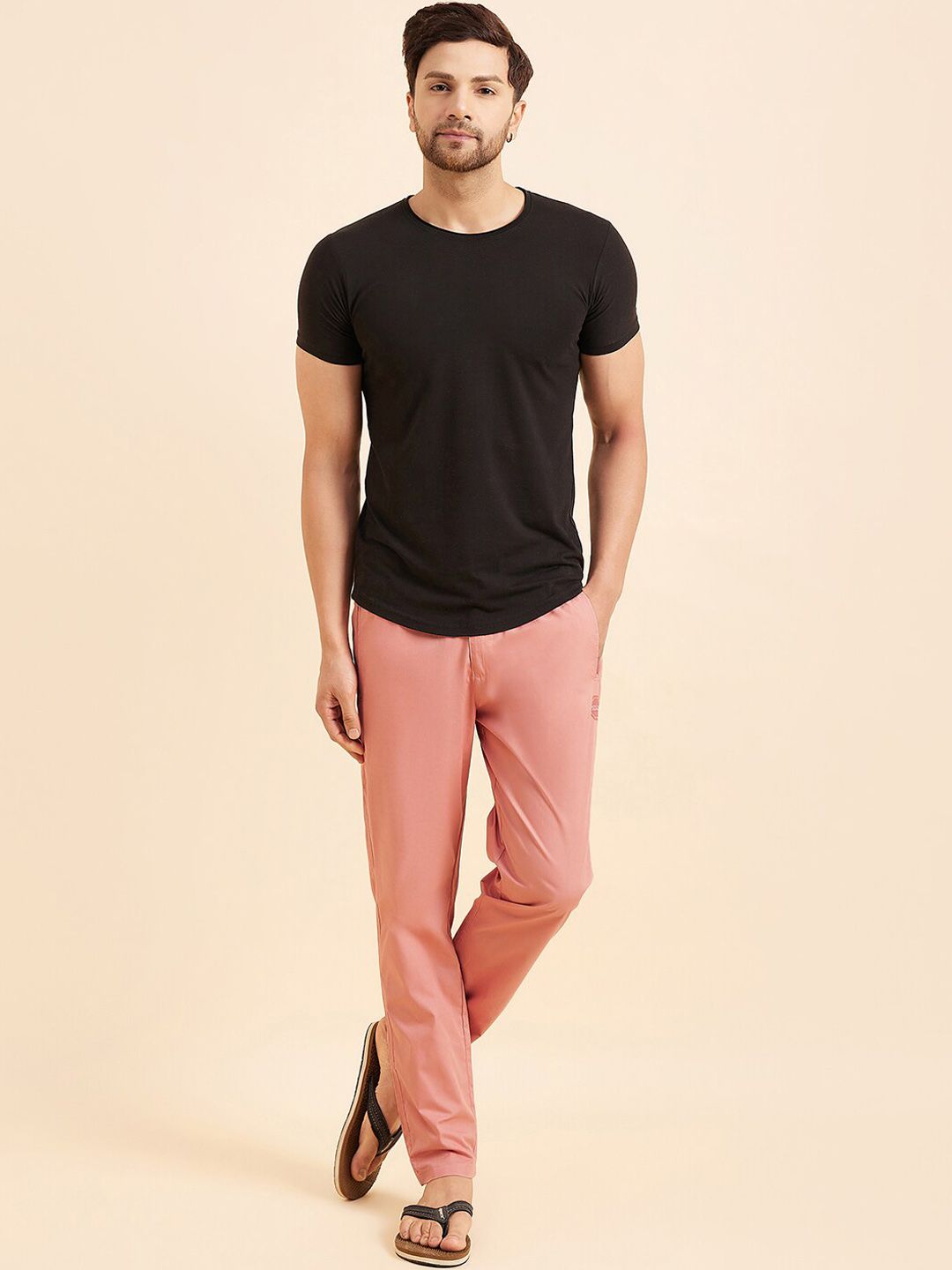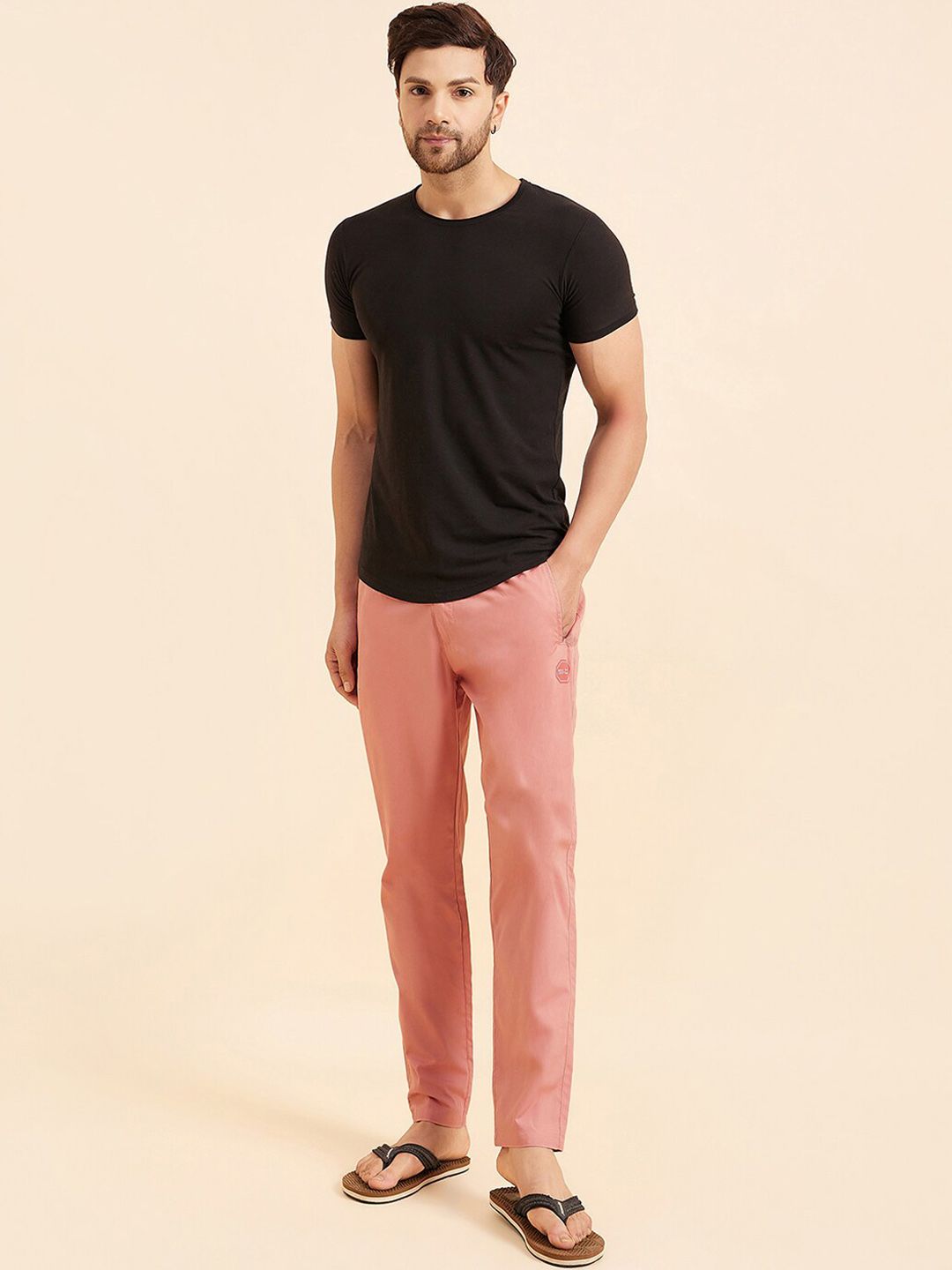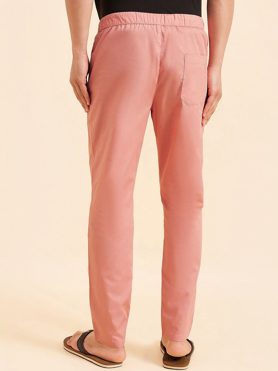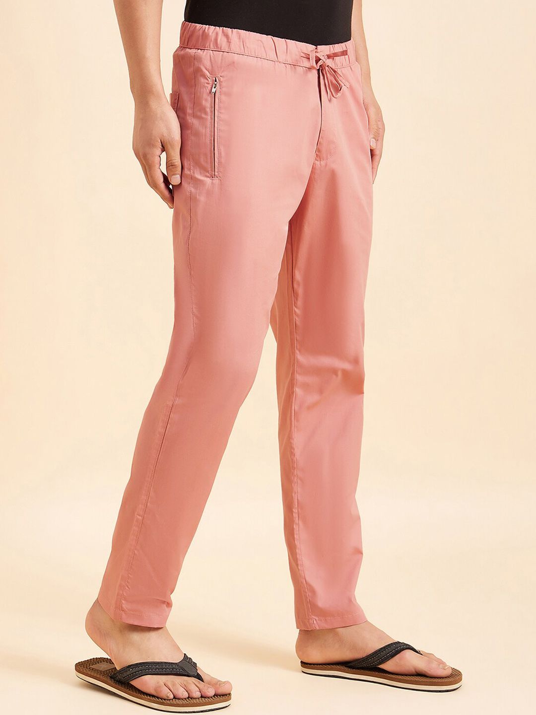 Rose pink solid mid-rise lounge pants, has an inner elasticated waistband with drawstring closure and three pockets