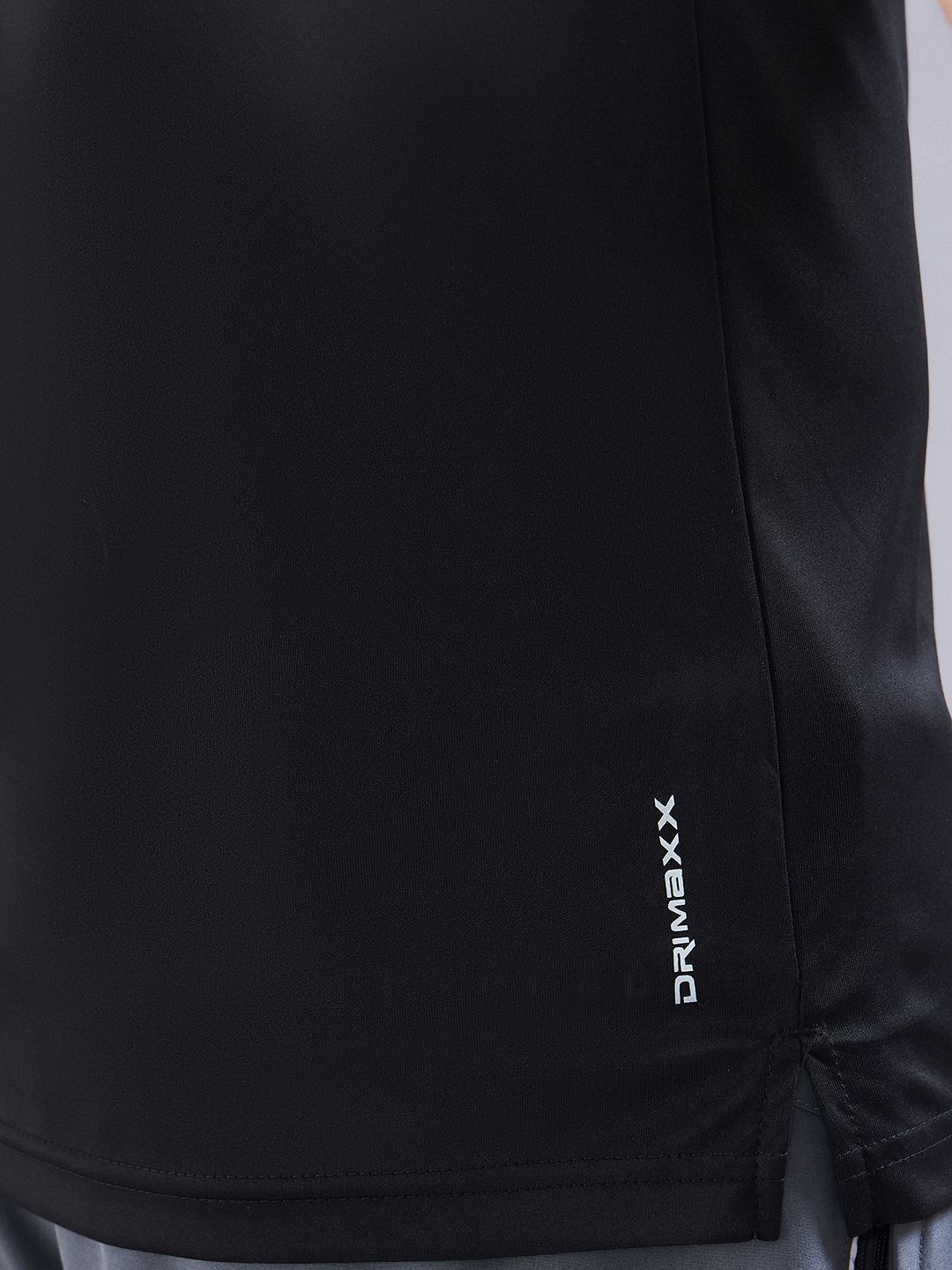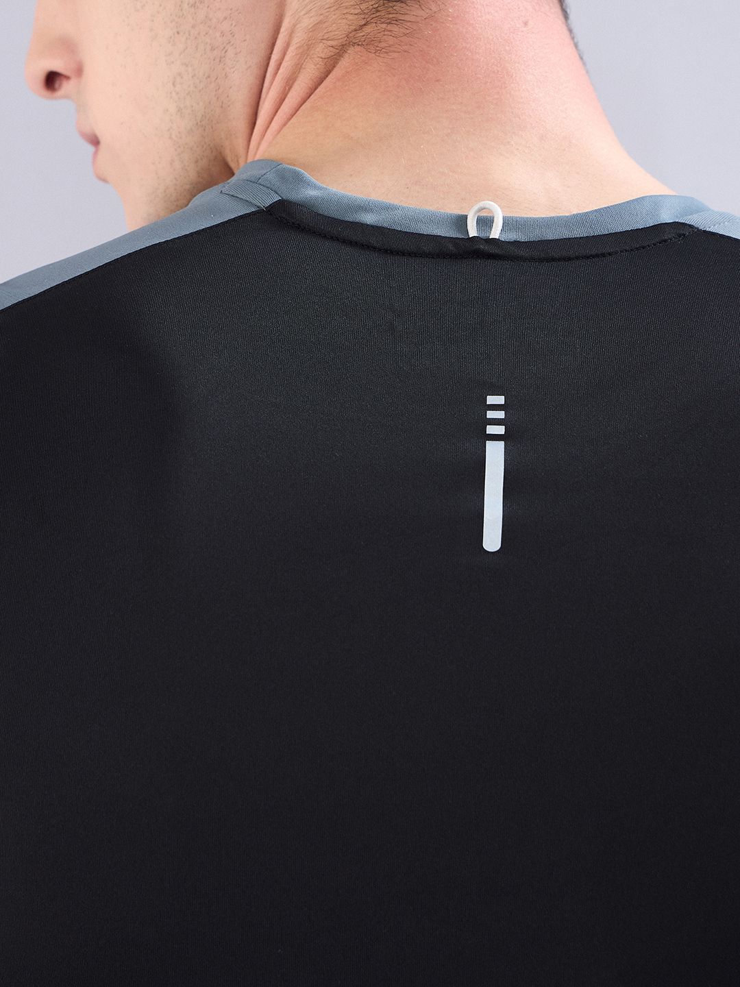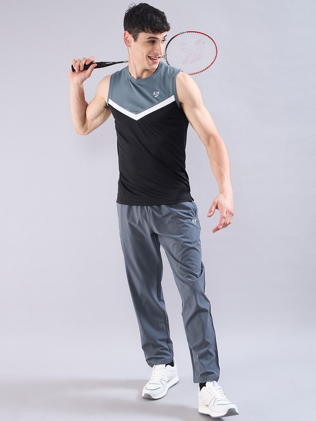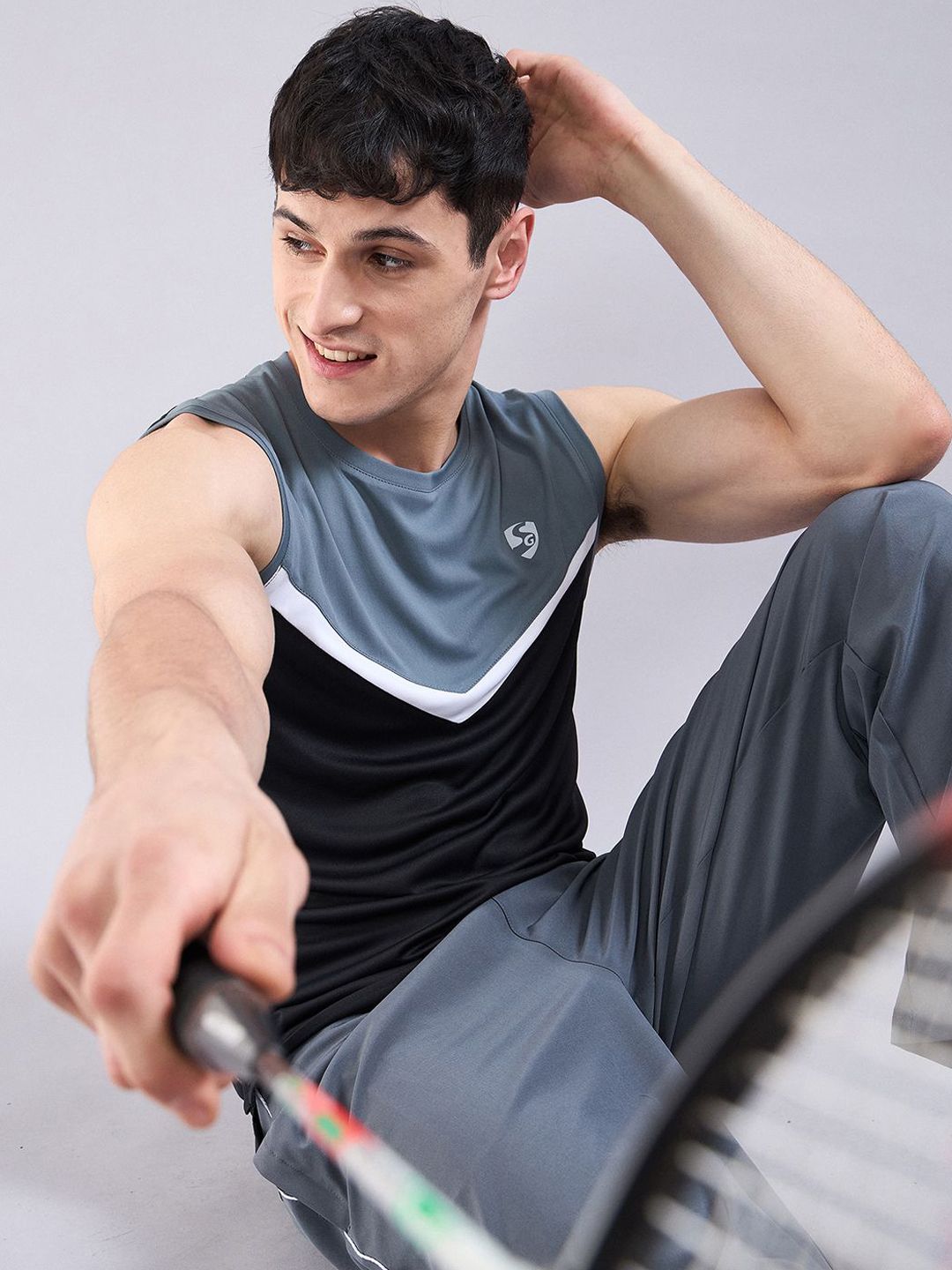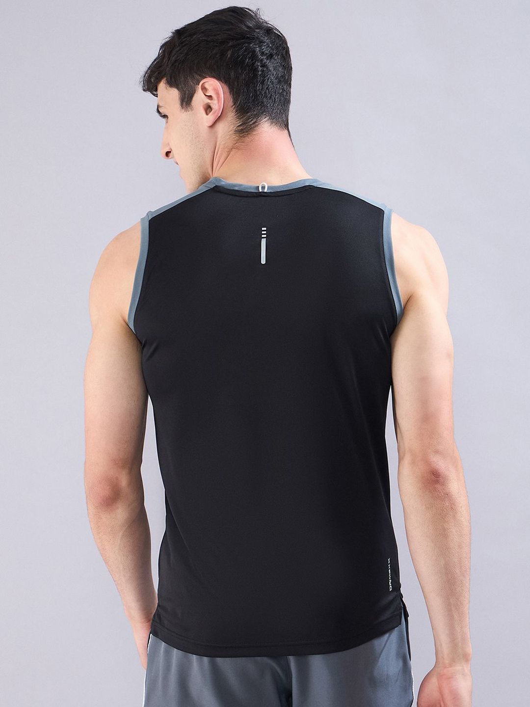 VANumber: H1MV80041Black and grey colourblocked gym vest for men, has round-neck and sleevelessFeatures:SoftComfortableFlexible