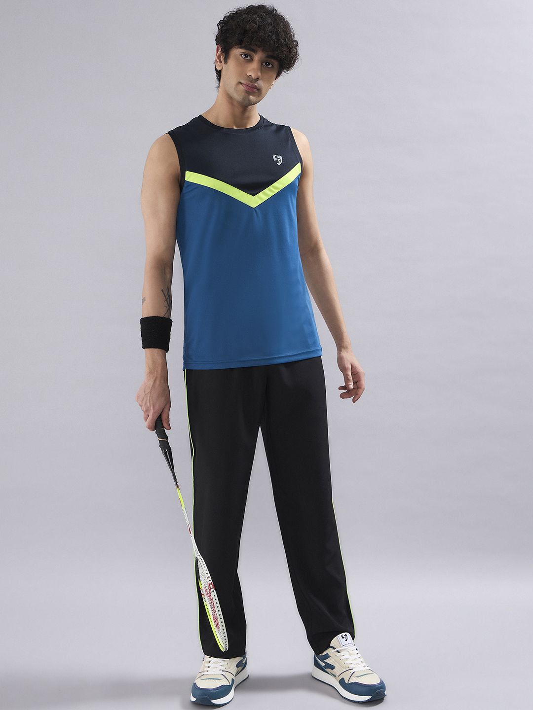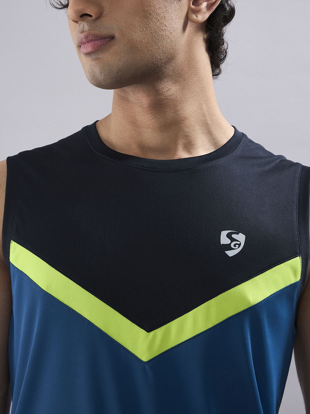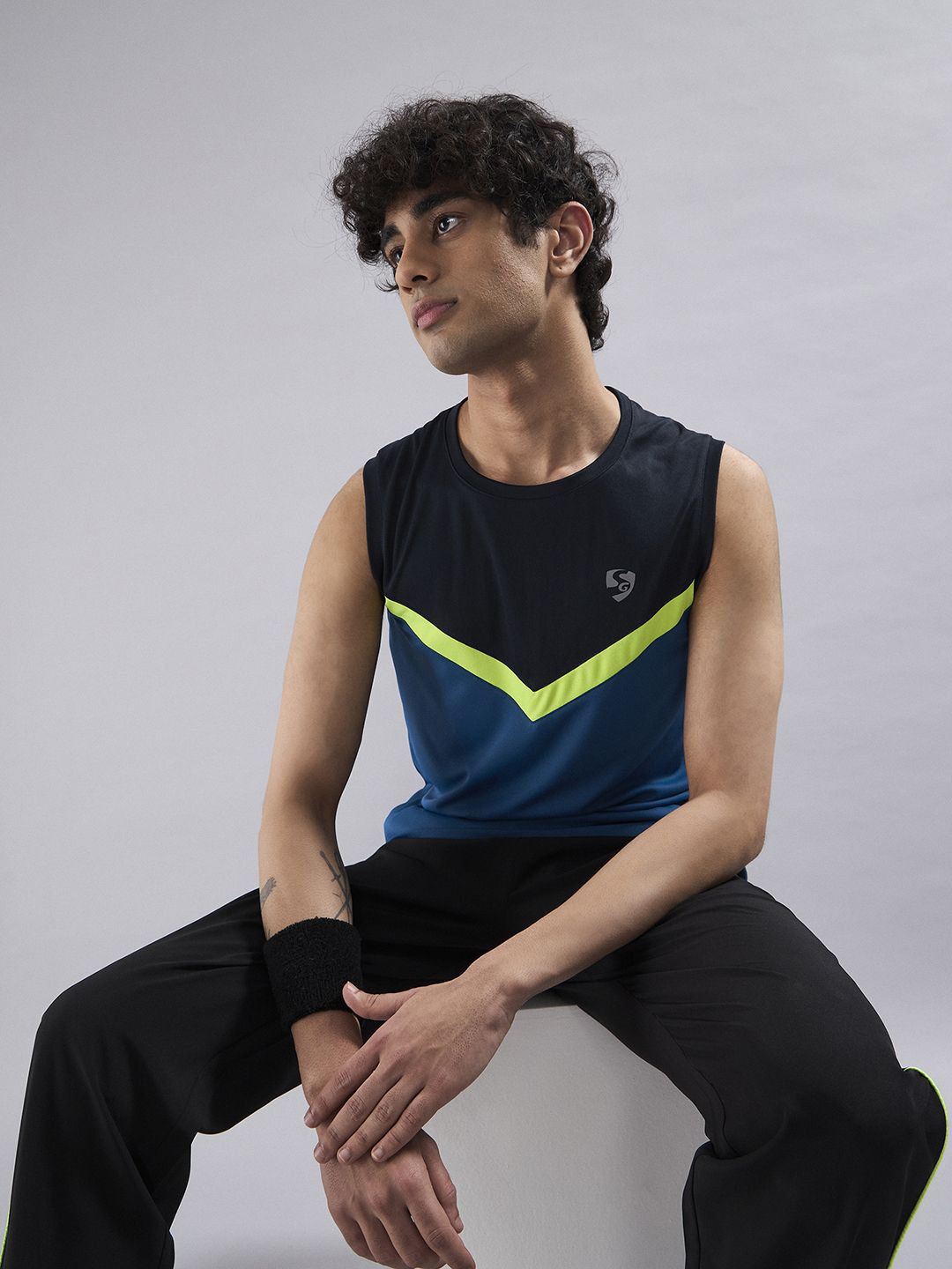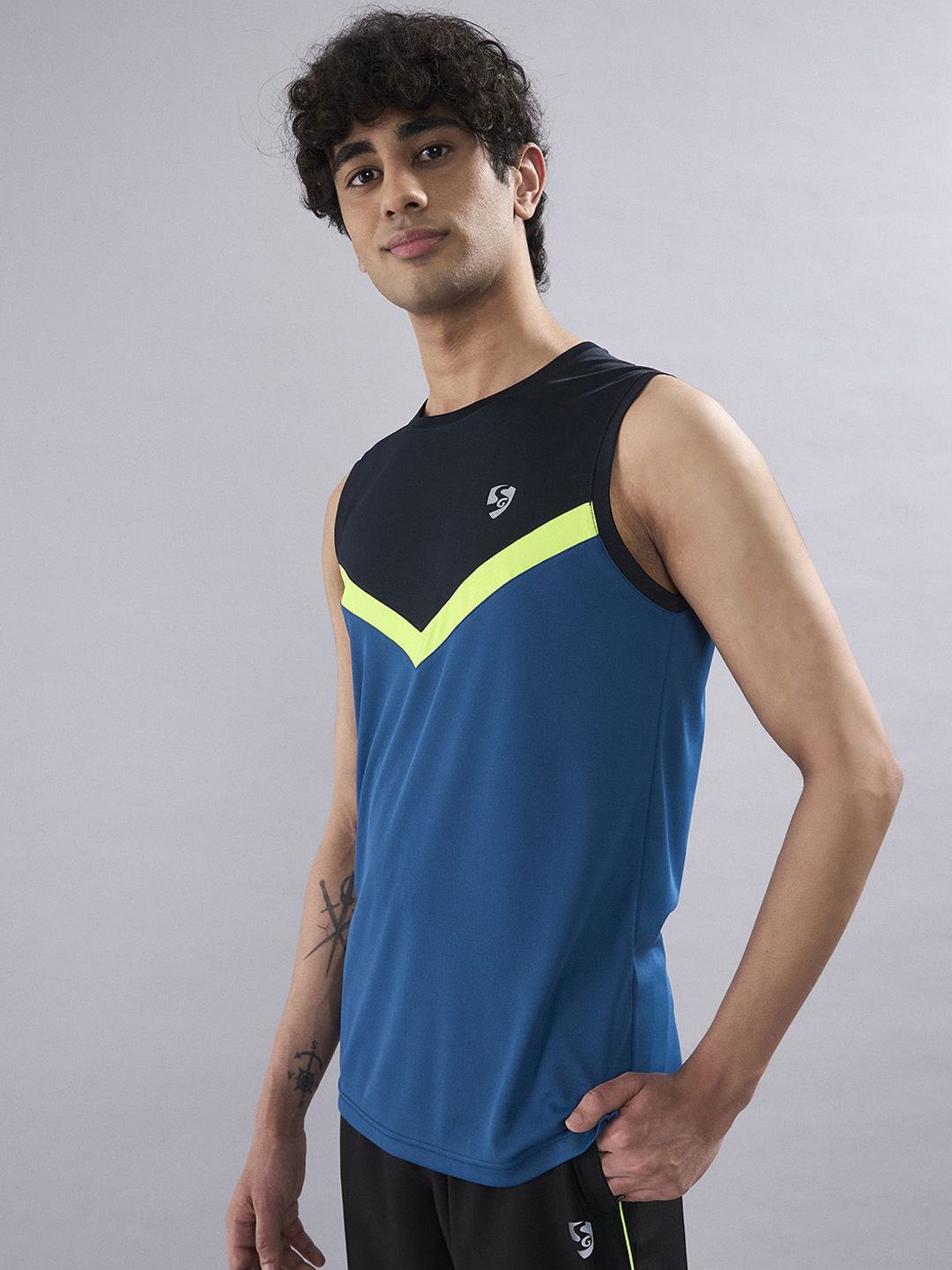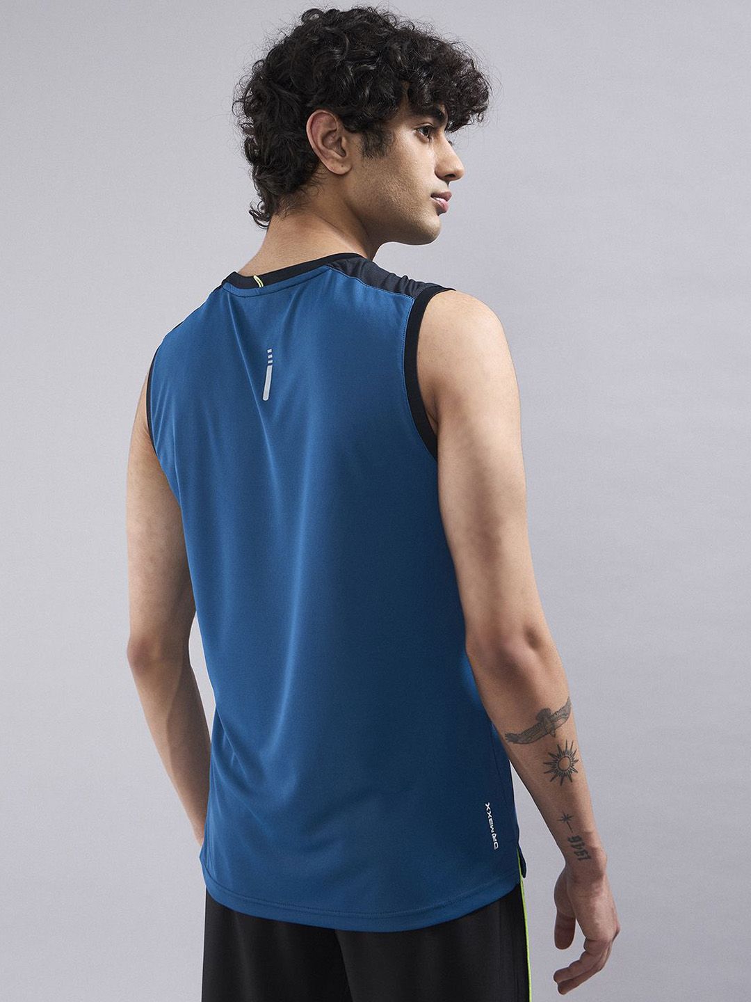 VANumber: H1MV80042Teal-blue and navy-blue colourblocked gym vest for men, has round-neck and sleevelessFeatures:ComfortableFlexible
