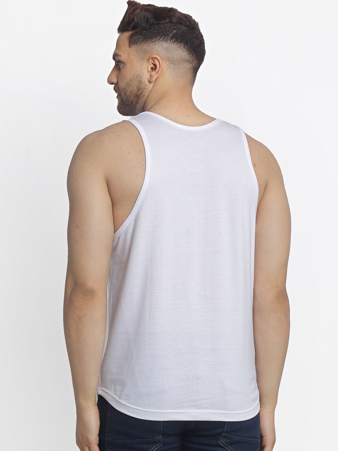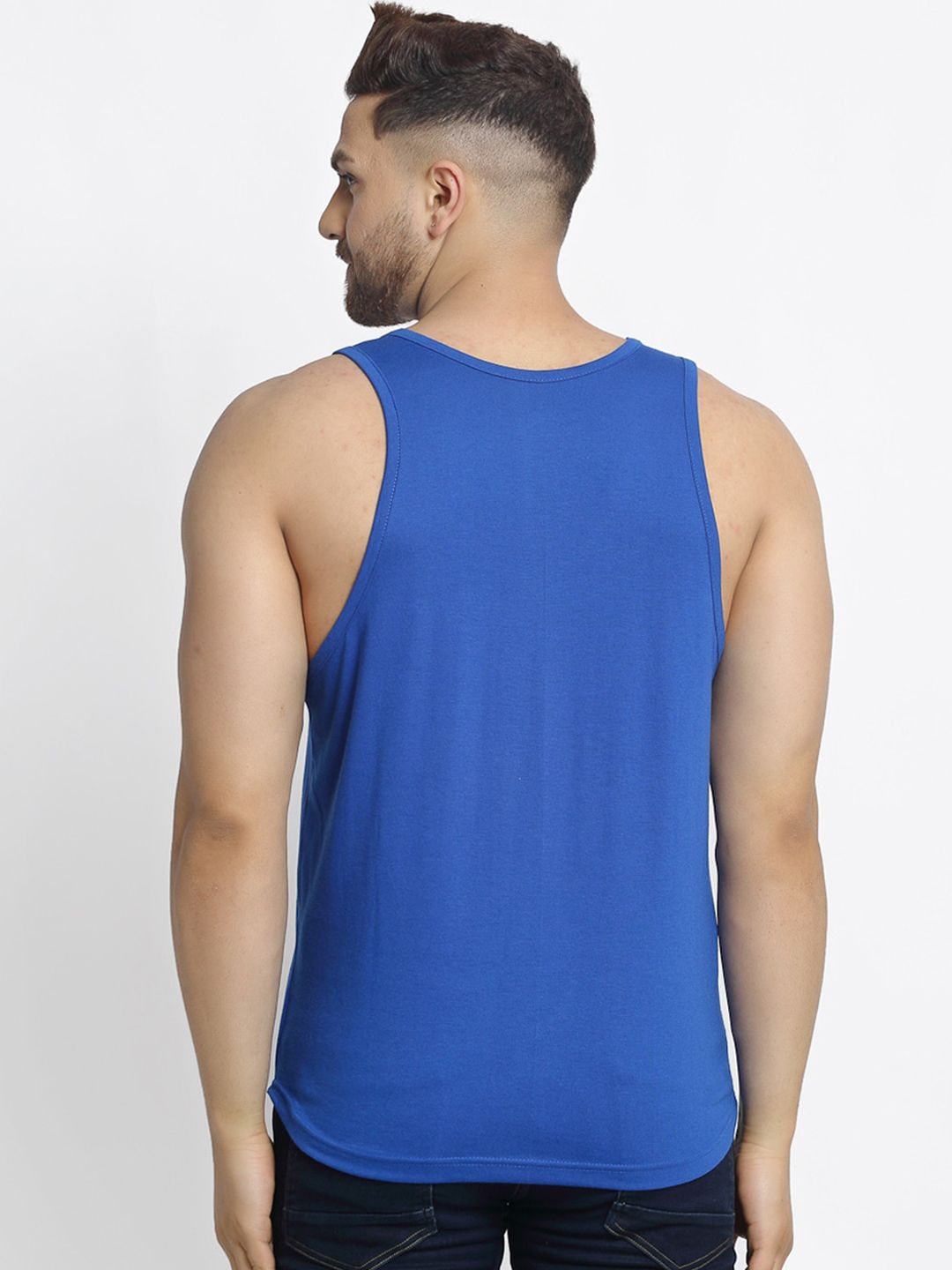Pack of 2 printed innerwear vestsWhite and black printed innerwear vest, has a scoop neck and sleevelessBlue, white and black printed innerwear vest, has a scoop neck and sleevelessFeatures: 175 - 180 GSM Cotton used