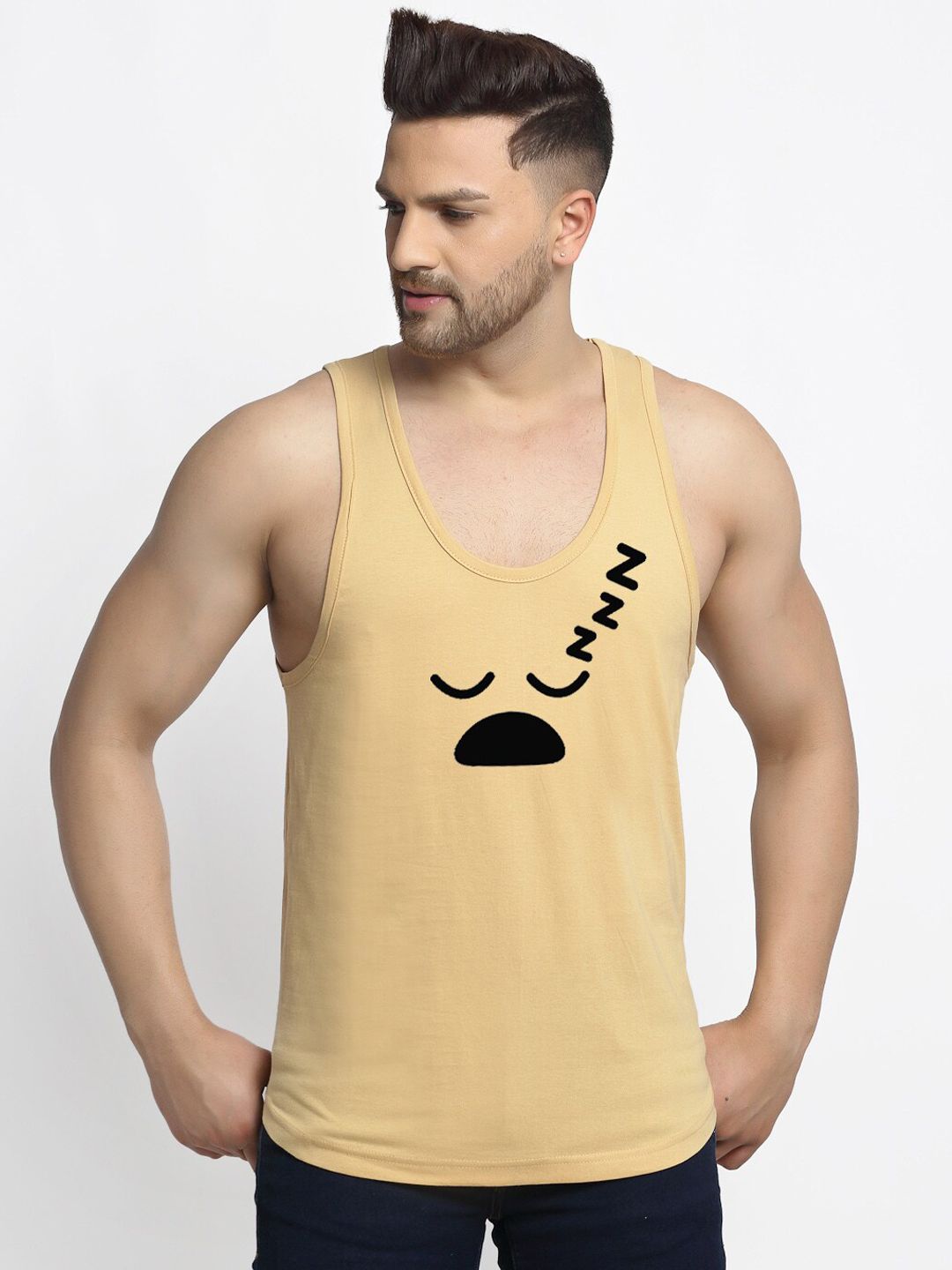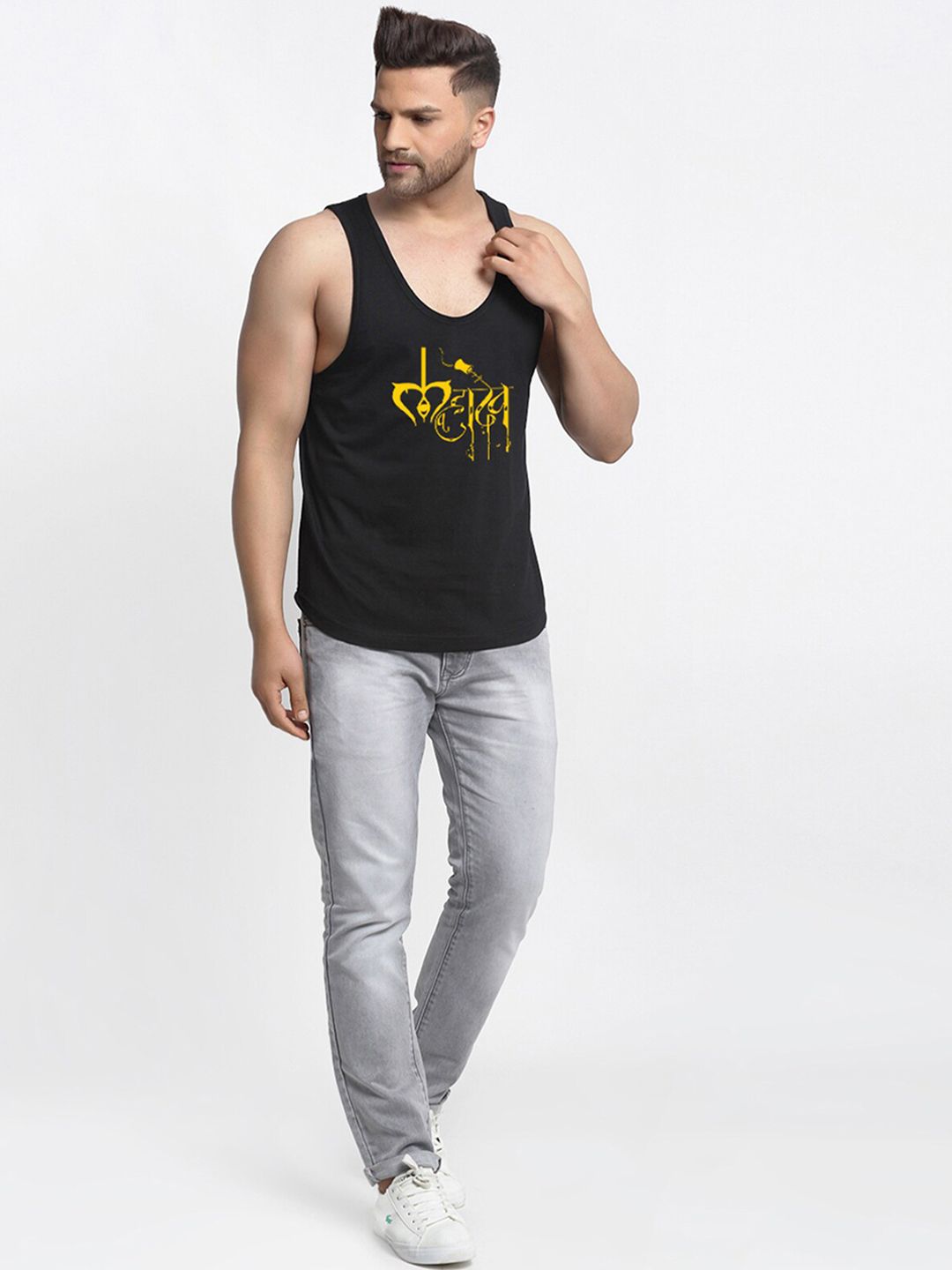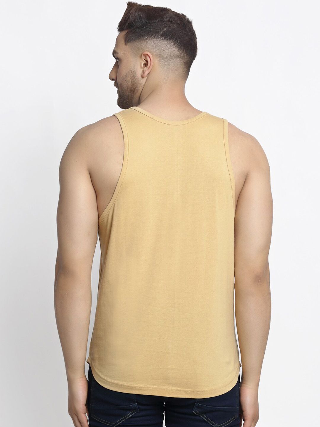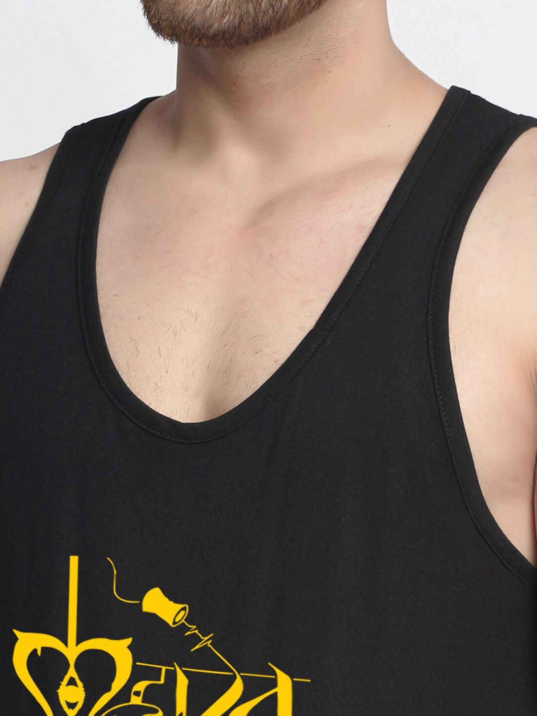 Pack of 2 printed innerwear vestsYellow and black printed innerwear vest, has a scoop neck and sleevelessBlack and yellow printed innerwear vest, has a scoop neck and sleevelessFeatures: 175 - 180 GSM Cotton used