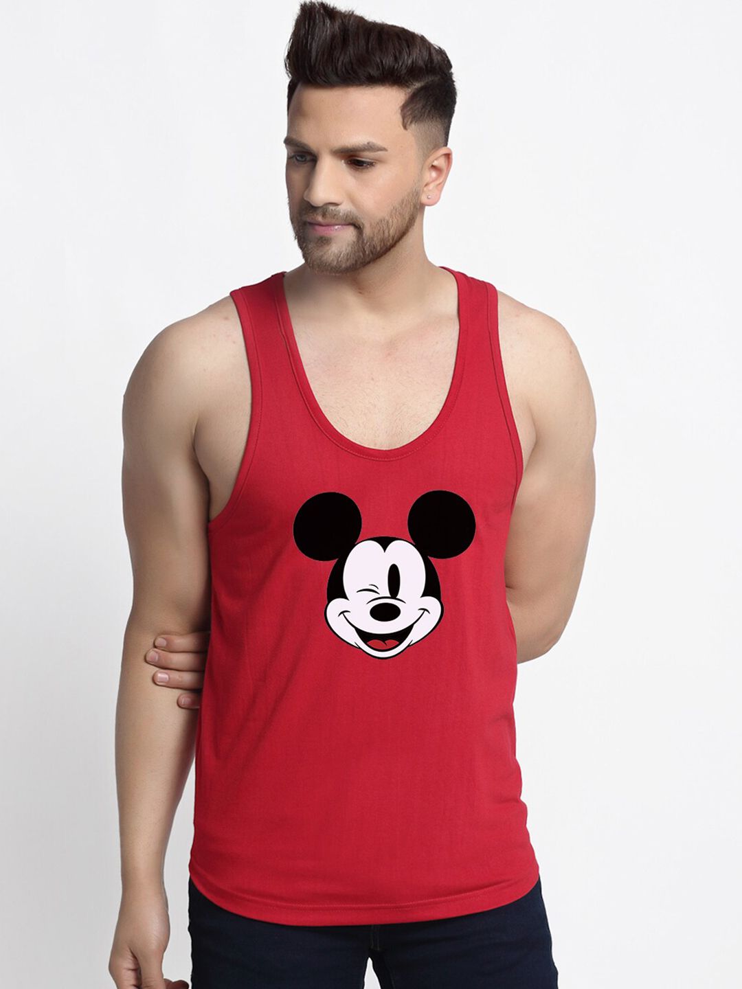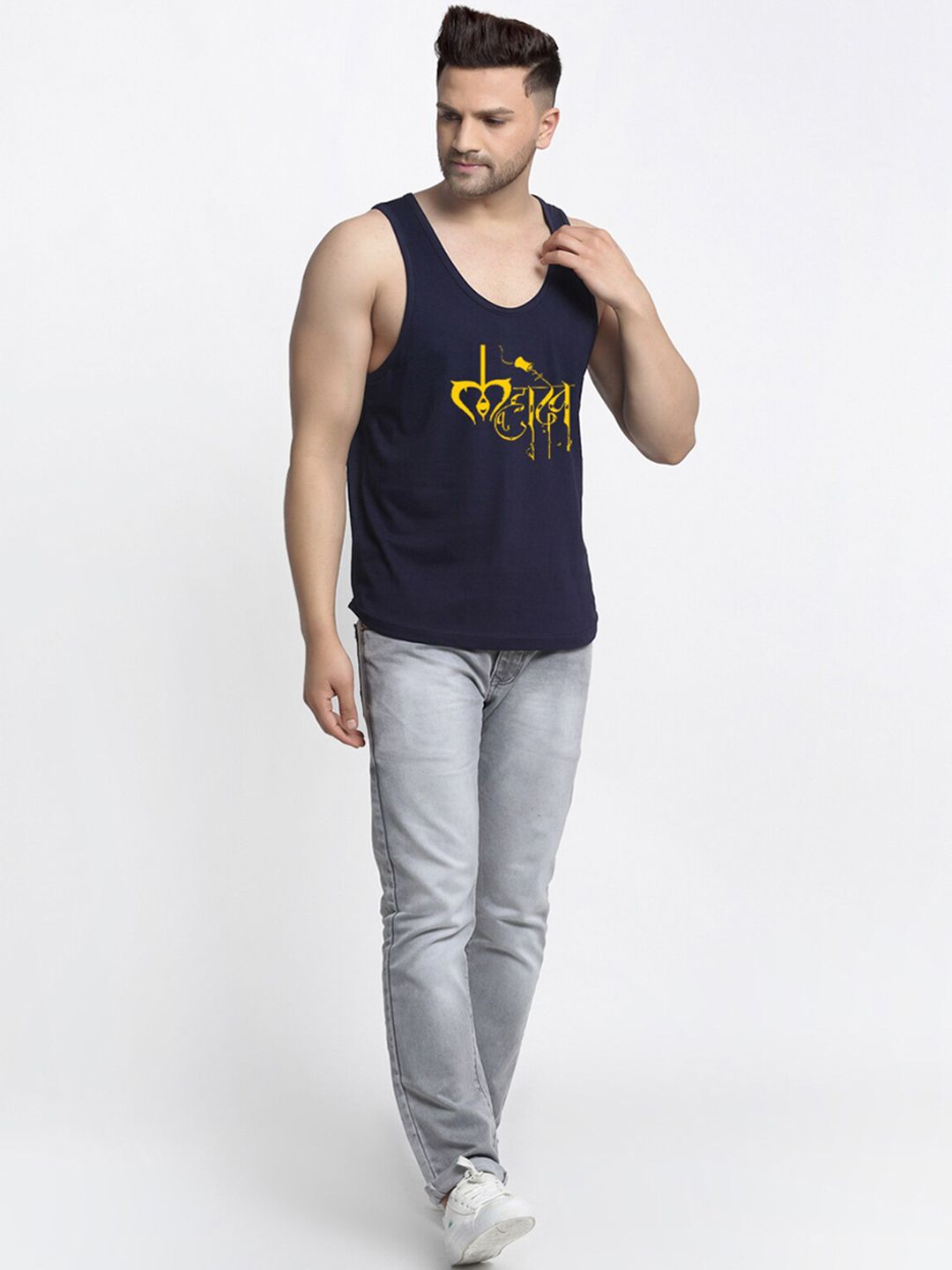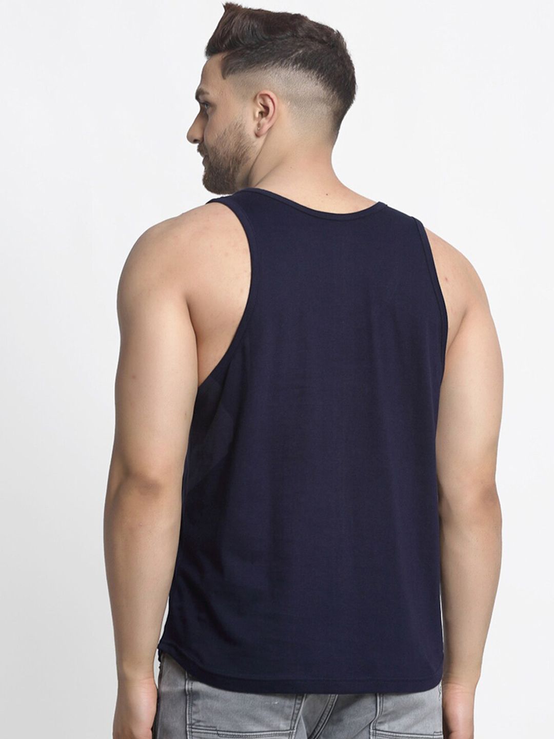 Pack of 2 printed innerwear vestsNavy blue and yellow printed drop cut innerwear vest, has a U-neck and drop cut sleevelessRed, white and black printed drop cut innerwear vest, has a U-neck and sleevelessGSM: 175 - 180 GSM