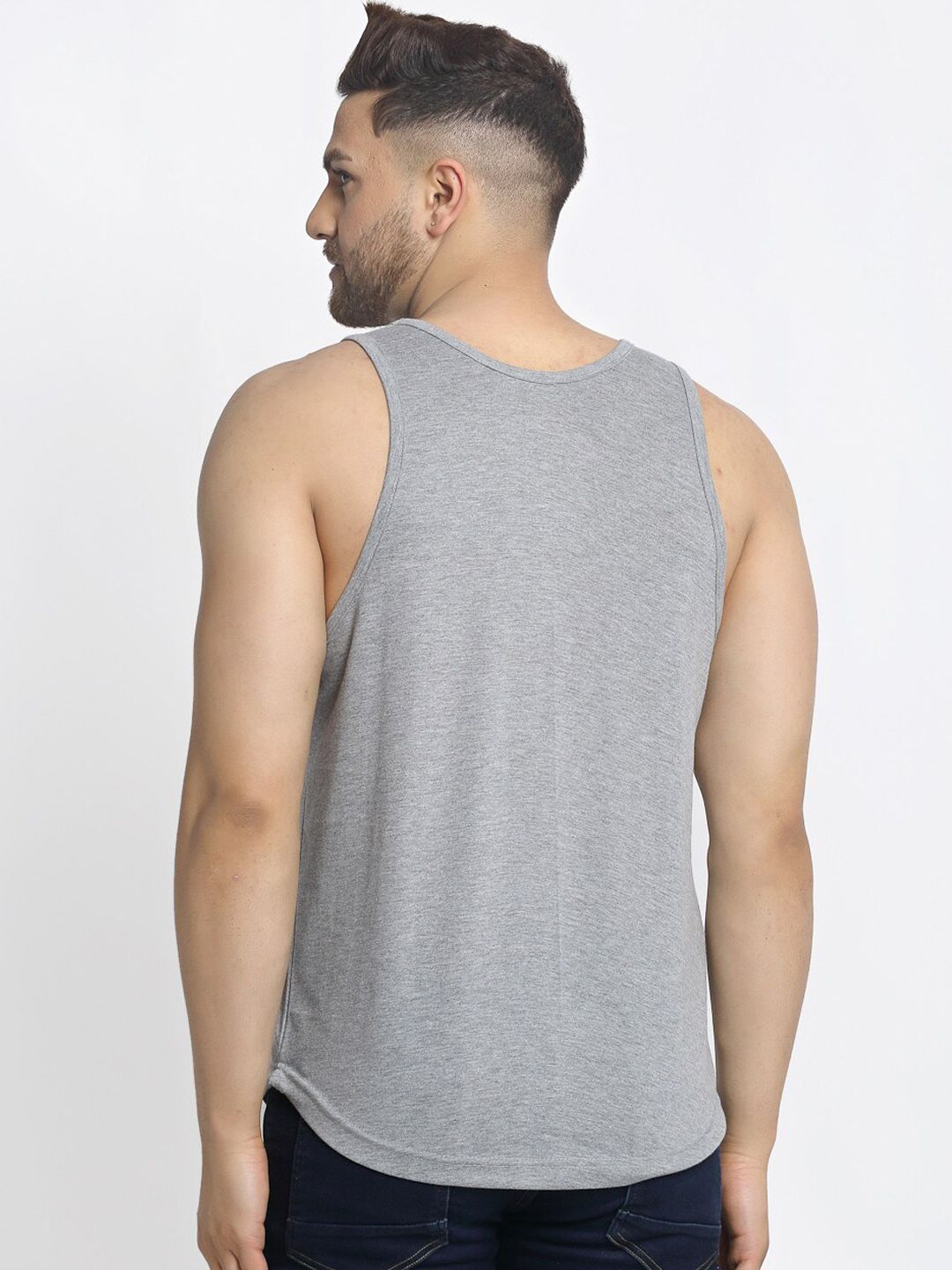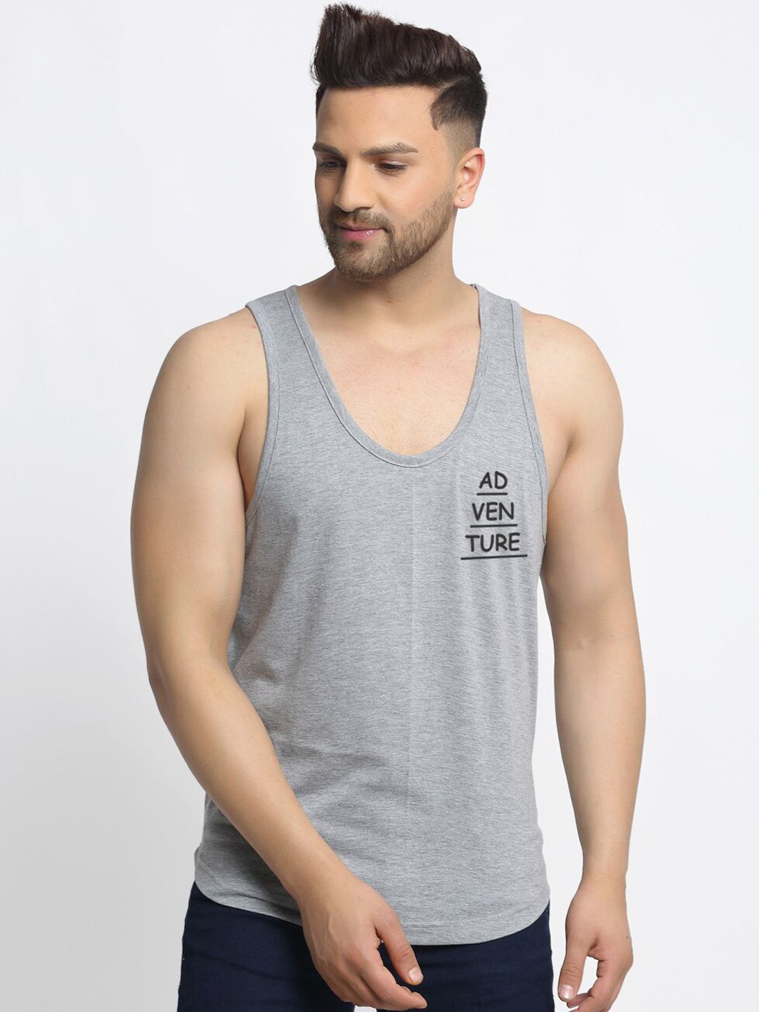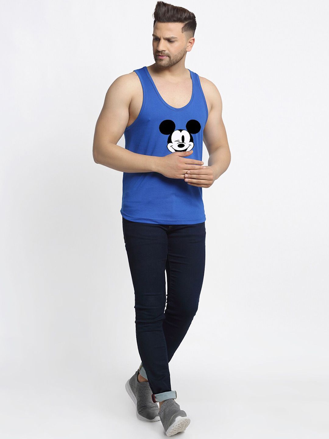 Pack of 2 printed innerwear vests in blue, grey and black, each has a scoop neck and sleeveless