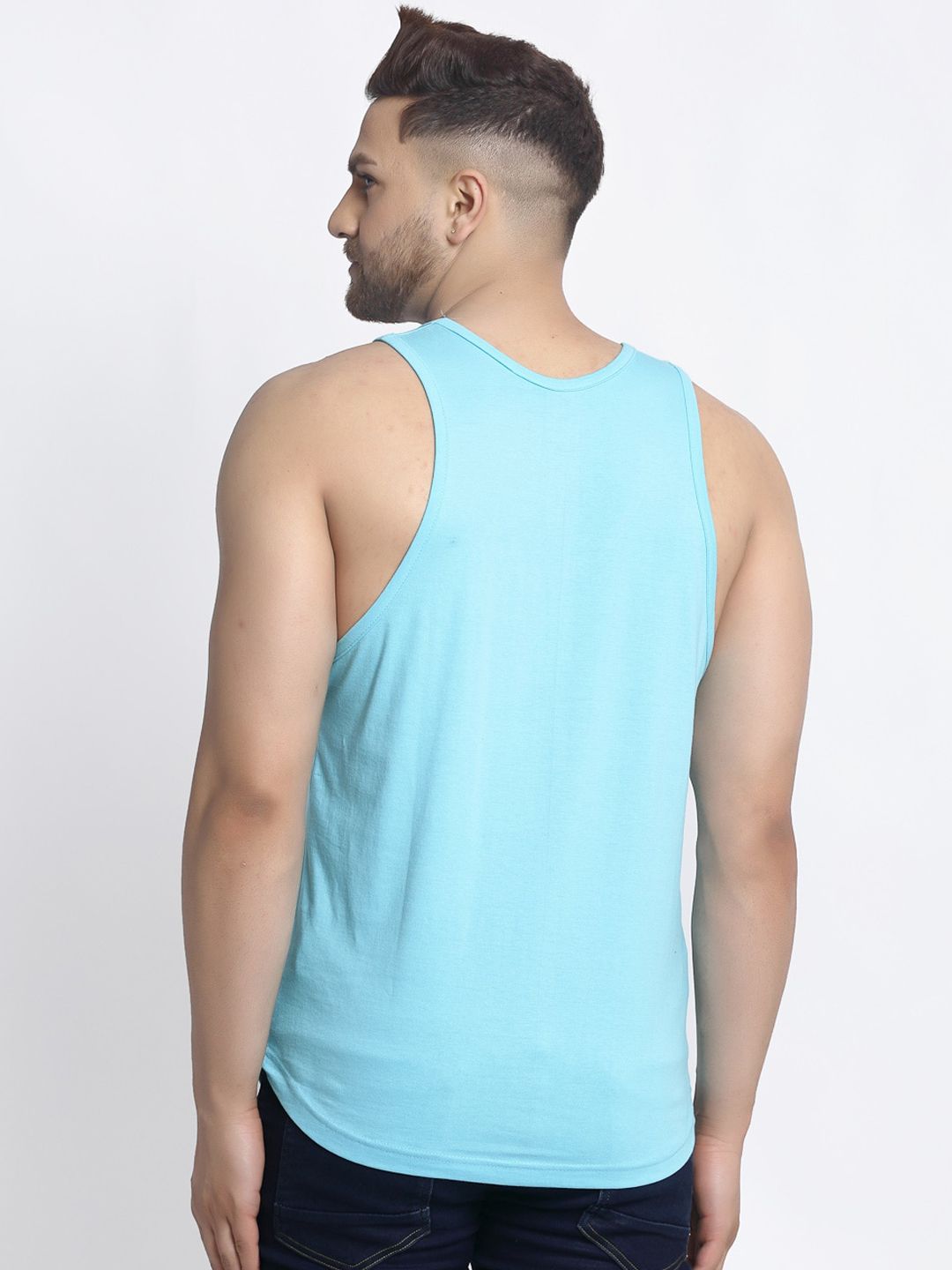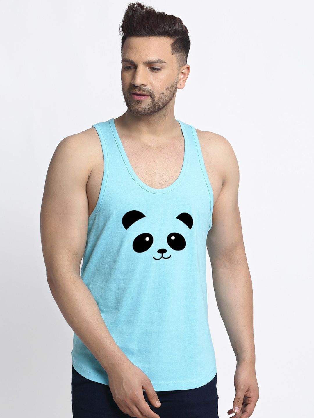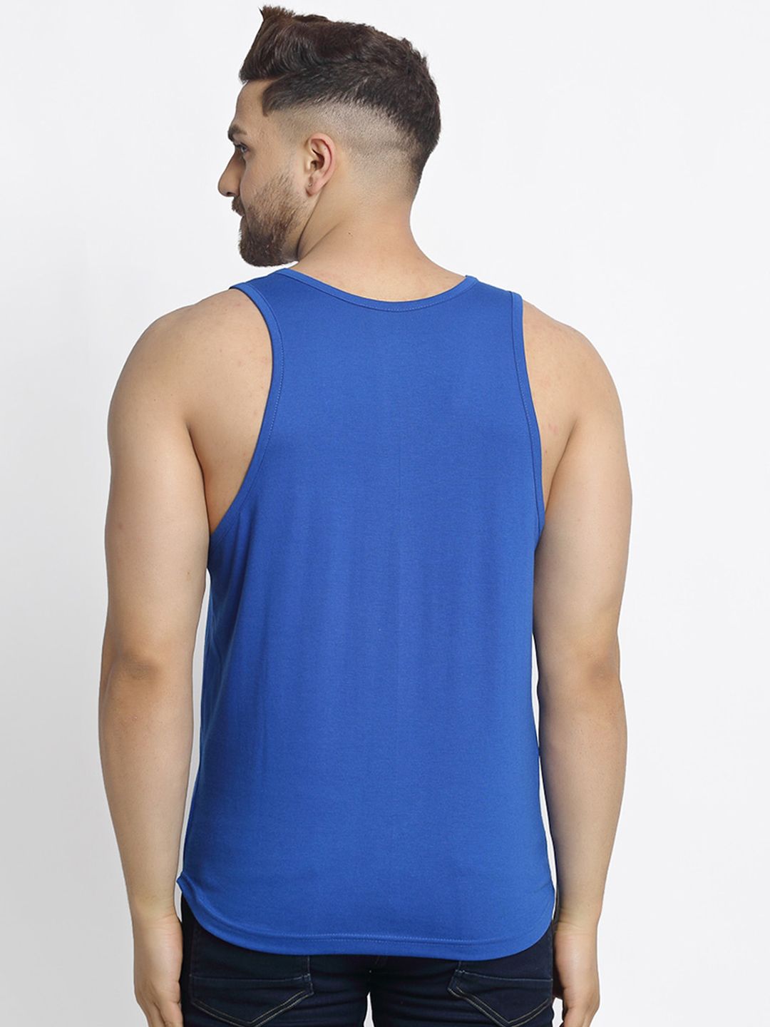 Pack of 2 printed innerwear vests in blue, black and white, each has a scoop neck and sleeveless
