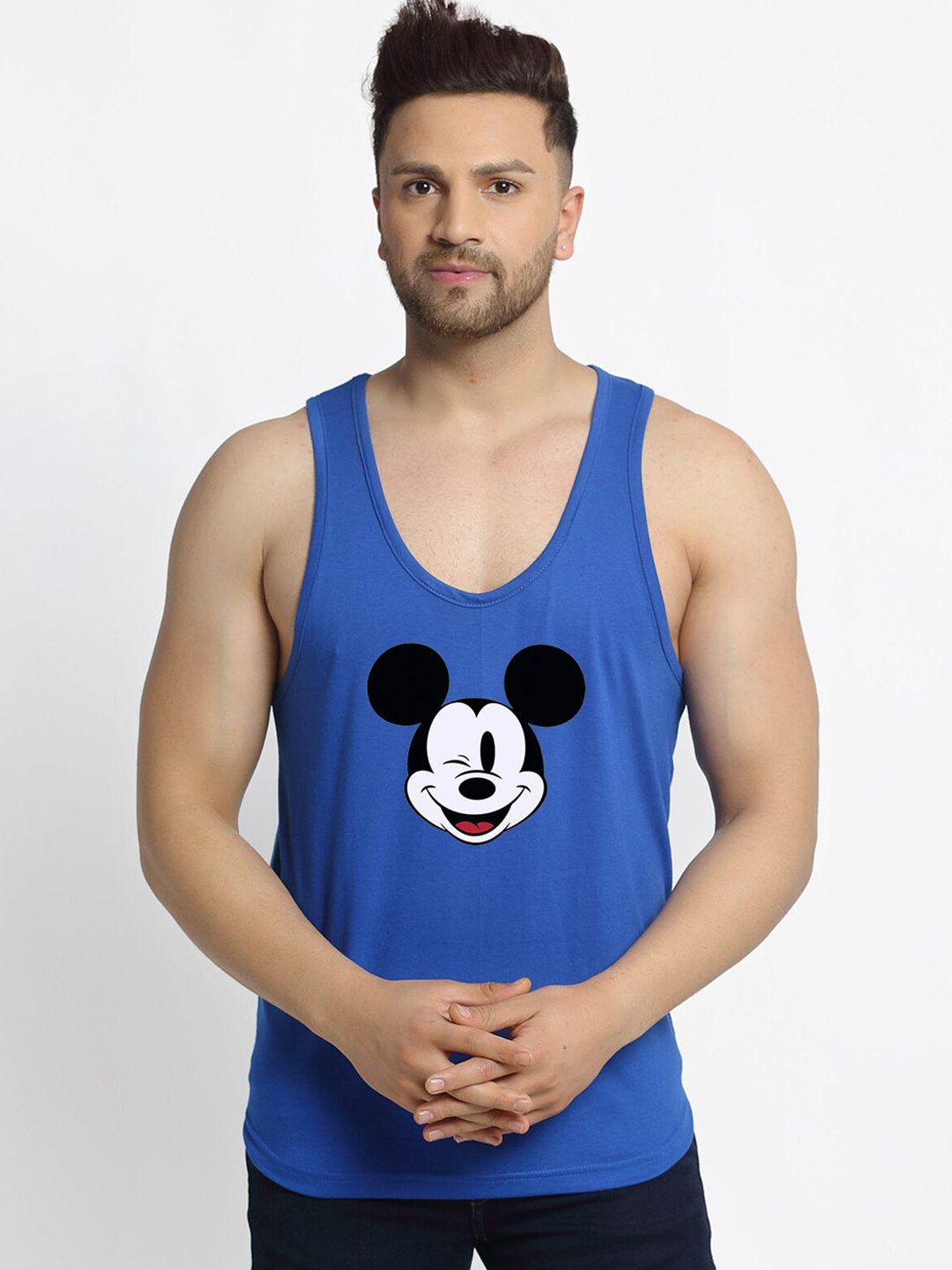 Pack of two printed regular-fit vestsBlue, black and white mickey printed regular-fit vests has a U-neck and sleevelessBlack and red printed regular-fit vests has a U-neck and sleevelessFeatures: 175-180 GSM Cotton used
