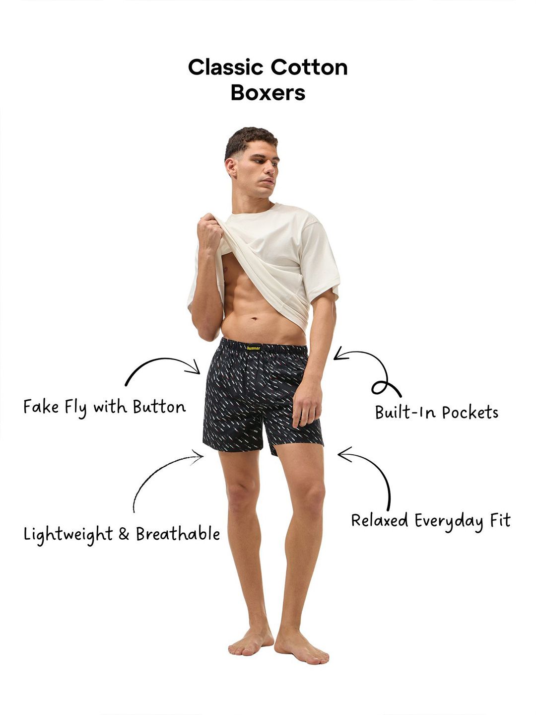 VAN Number: BOASTRBANGLE03Pack of 3 boxersBlack printed boxers, has an elasticated waistband with concealed flyGreen printed boxers, has an elasticated waistband with concealed flyTeal-Blue printed boxers, has an elasticated waistband with concealed fly