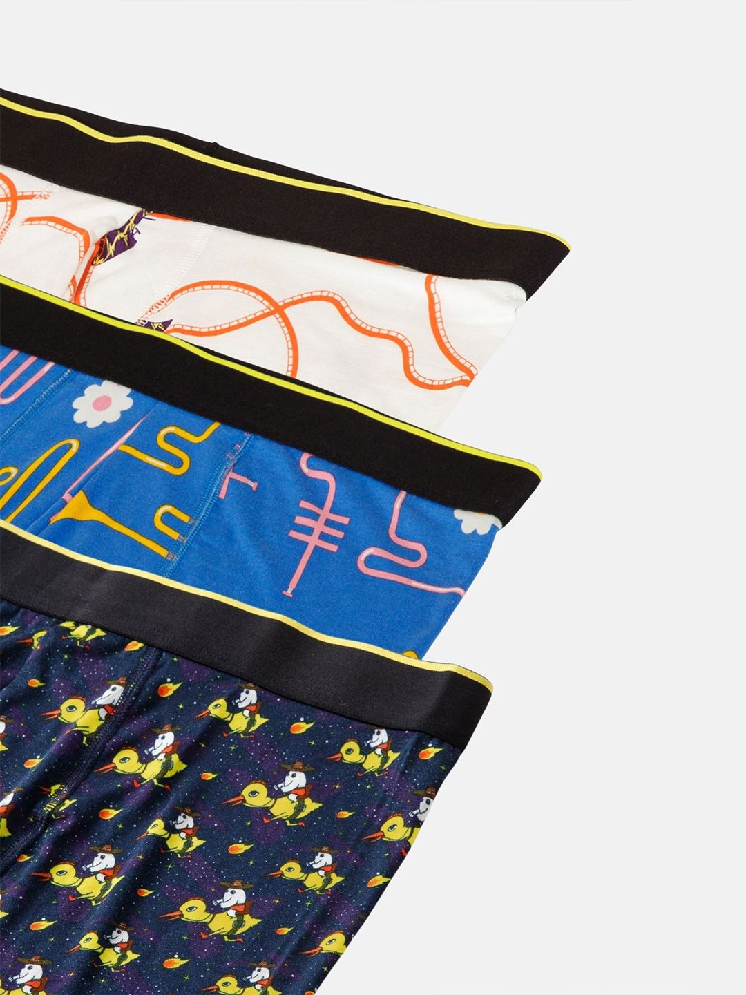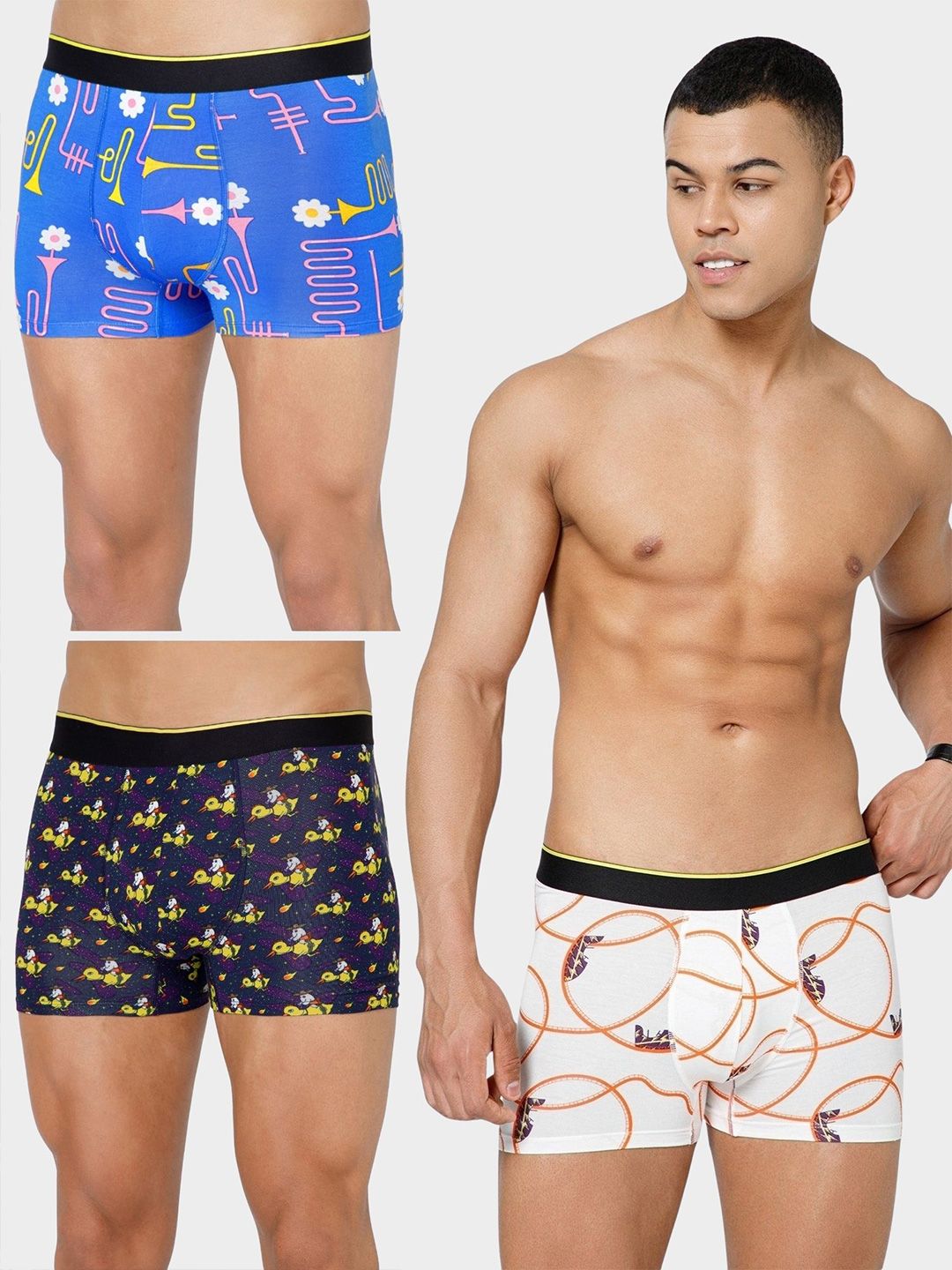 VANumber: TRDBSRUWHE03Pack of 3 trunksBlue printed trunk, has an outer elasticated waistband, and a double-layered contoured front pouchNavy Blue printed trunk, has an outer elasticated waistband, and a double-layered contoured front pouchWhite printed trunk, has an outer elasticated waistband, and a double-layered contoured front pouch