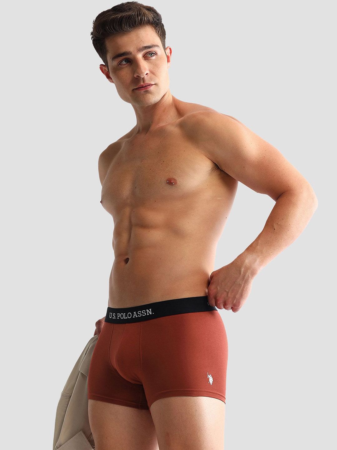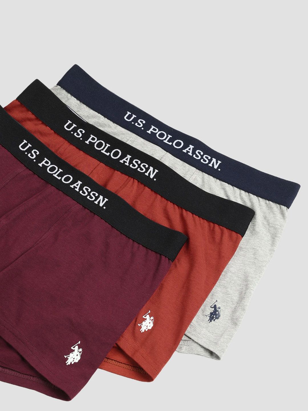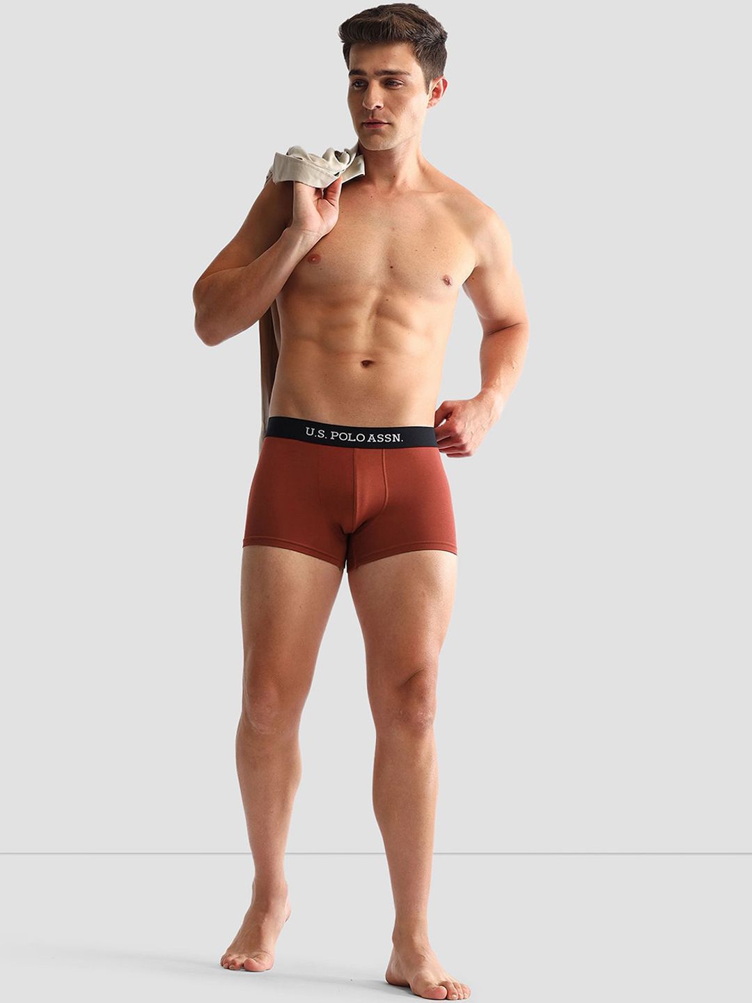 VANumber: OET13-GRM-P3Pack of 3 solid trunksBurgundy solid trunks, has an outer elasticated waistband, and a double-layered contoured front pouchGrey melange solid trunks, has an outer elasticated waistband, and a double-layered contoured front pouchRust orange-colored solid trunks, has an outer elasticated waistband, and a double-layered contoured front pouch