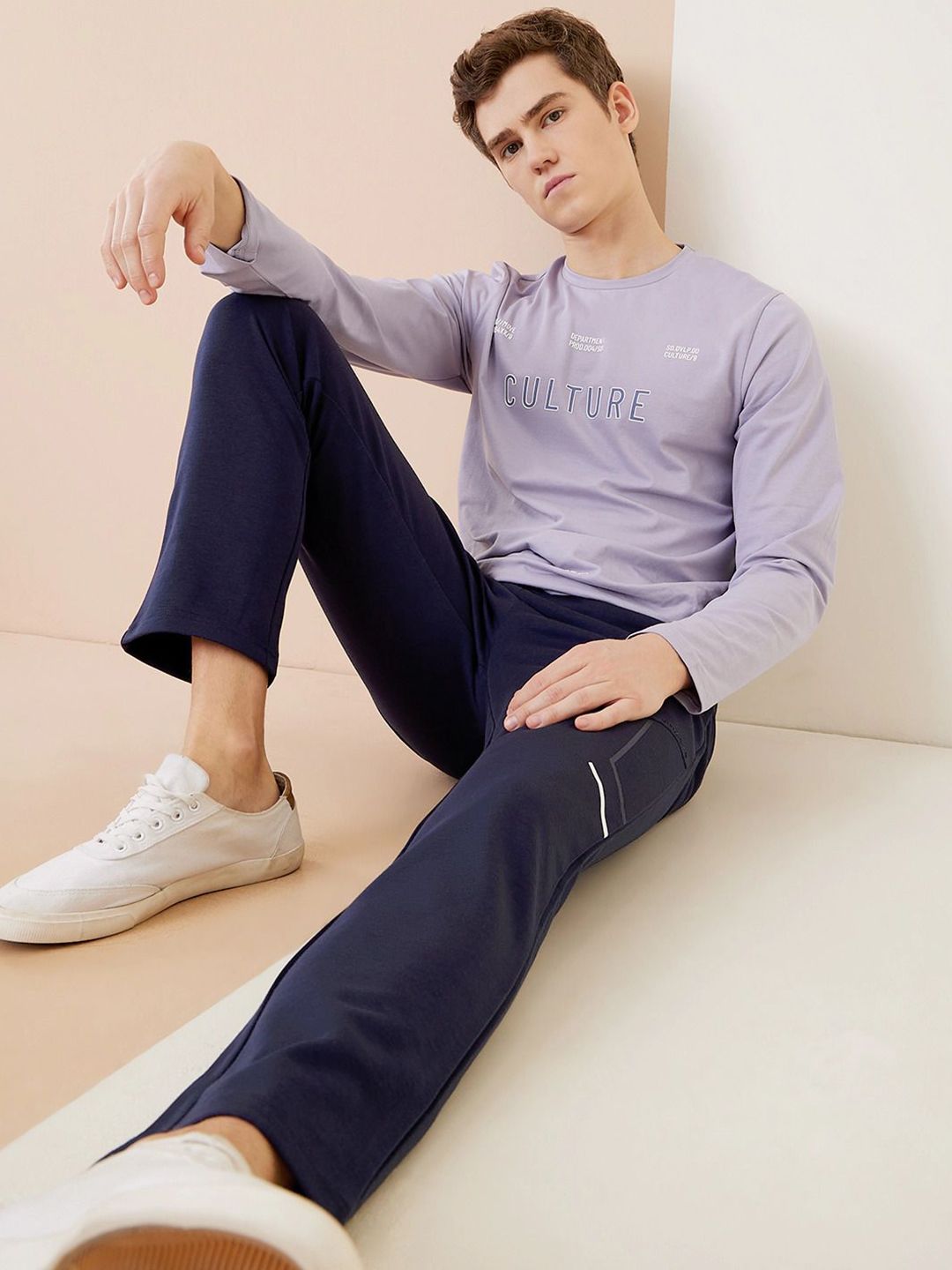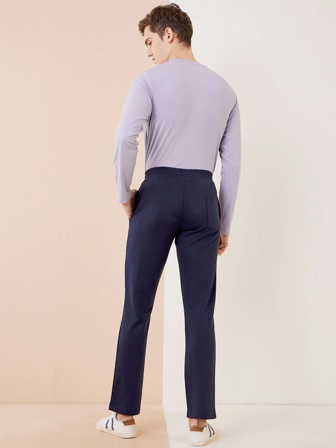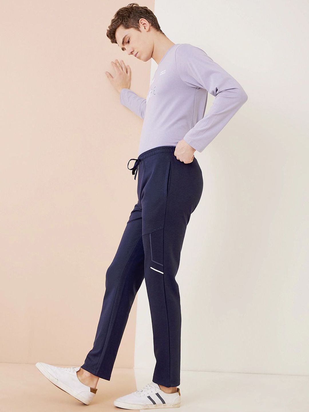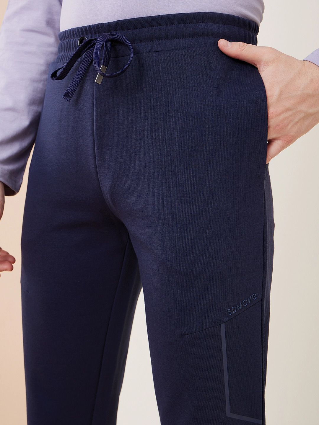 Navy Blue solid regular-fit mid-rise track pant with print detail, has an elasticated waistband with drawstring closure and two pockets