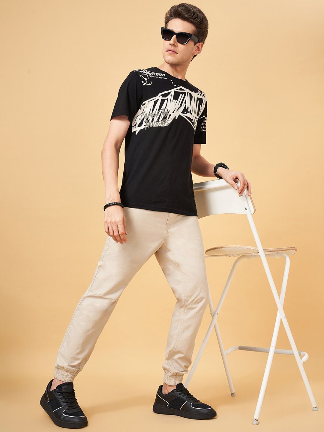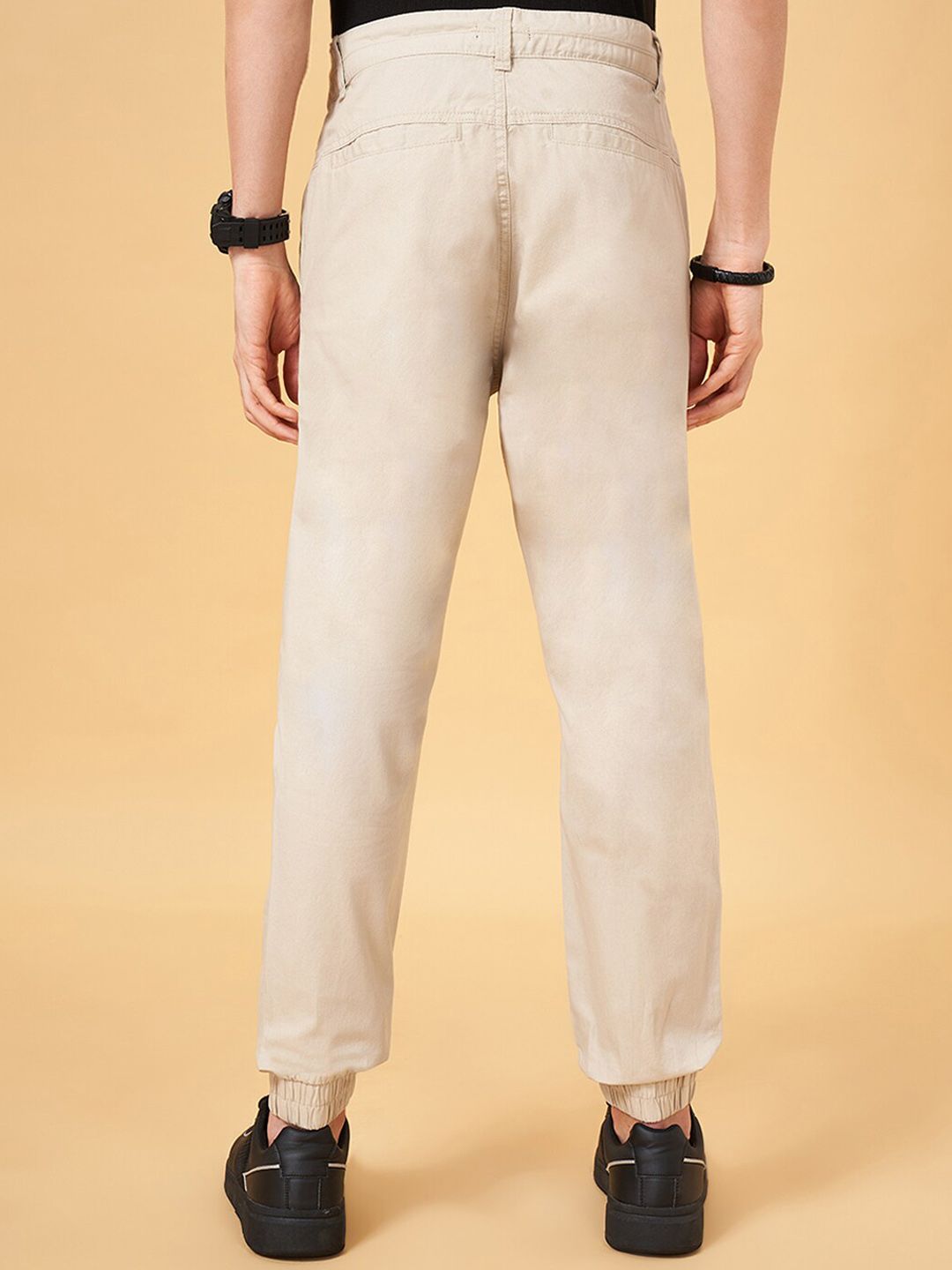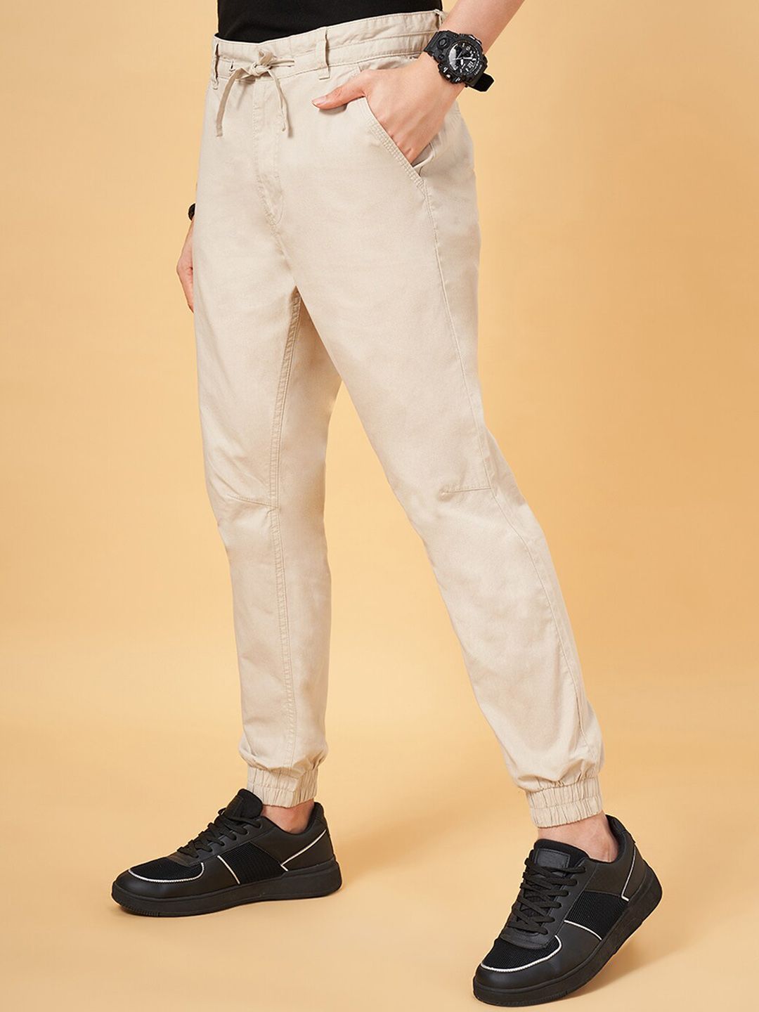 Beige solid mid-rise joggers, has an elasticated waistband with drawstring closure and four pockets with cuffed hems