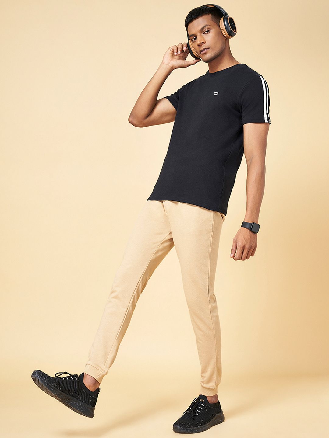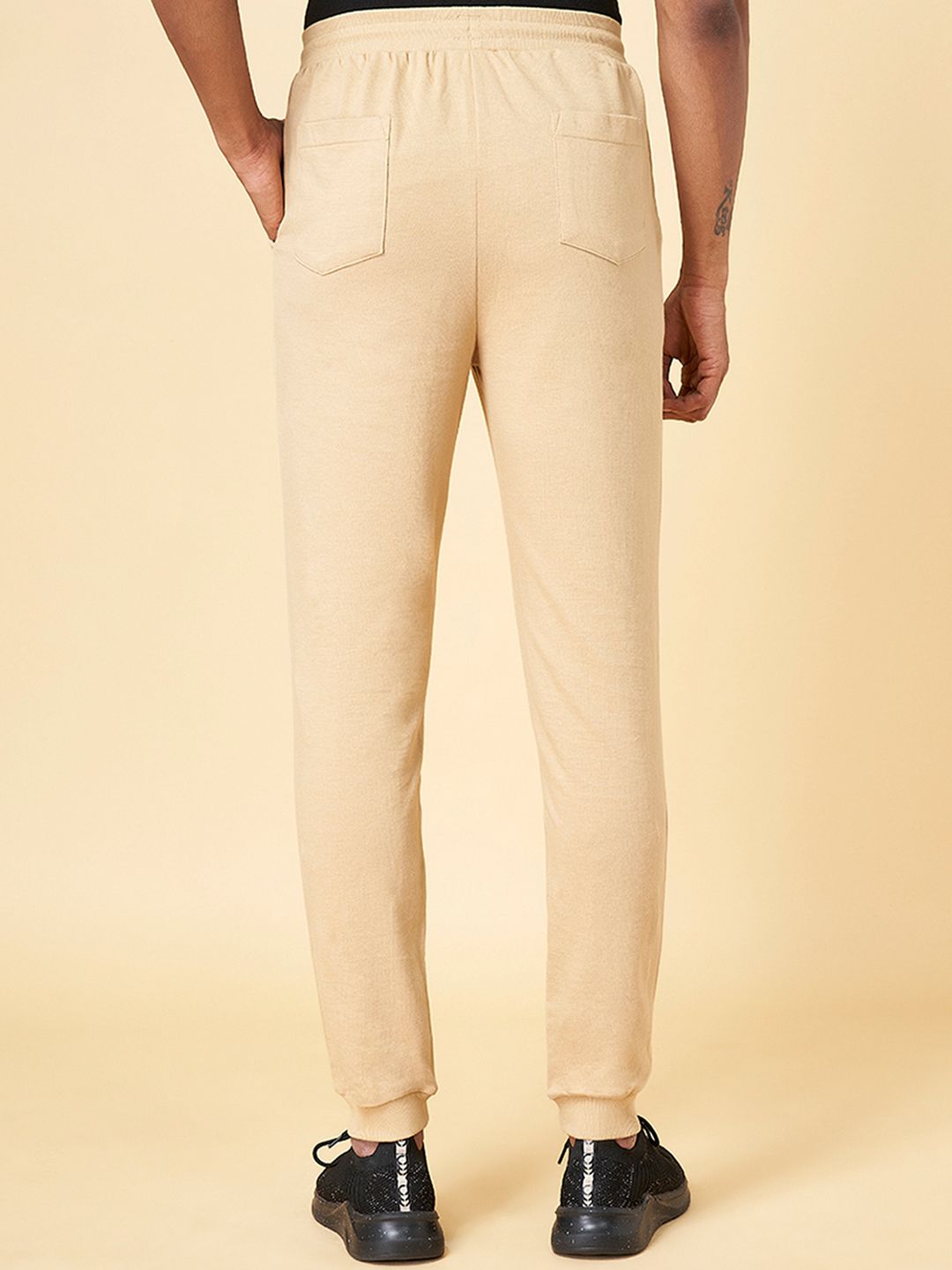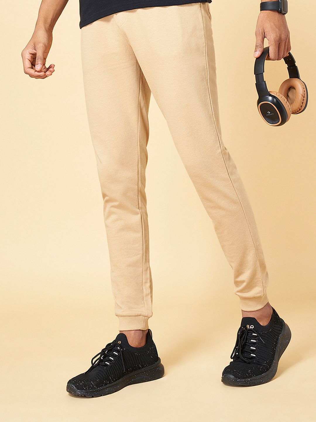 Tan brown solid slim-fit joggers, has an elasticated waistband with drawstring closure, four pockets and cuffed hems